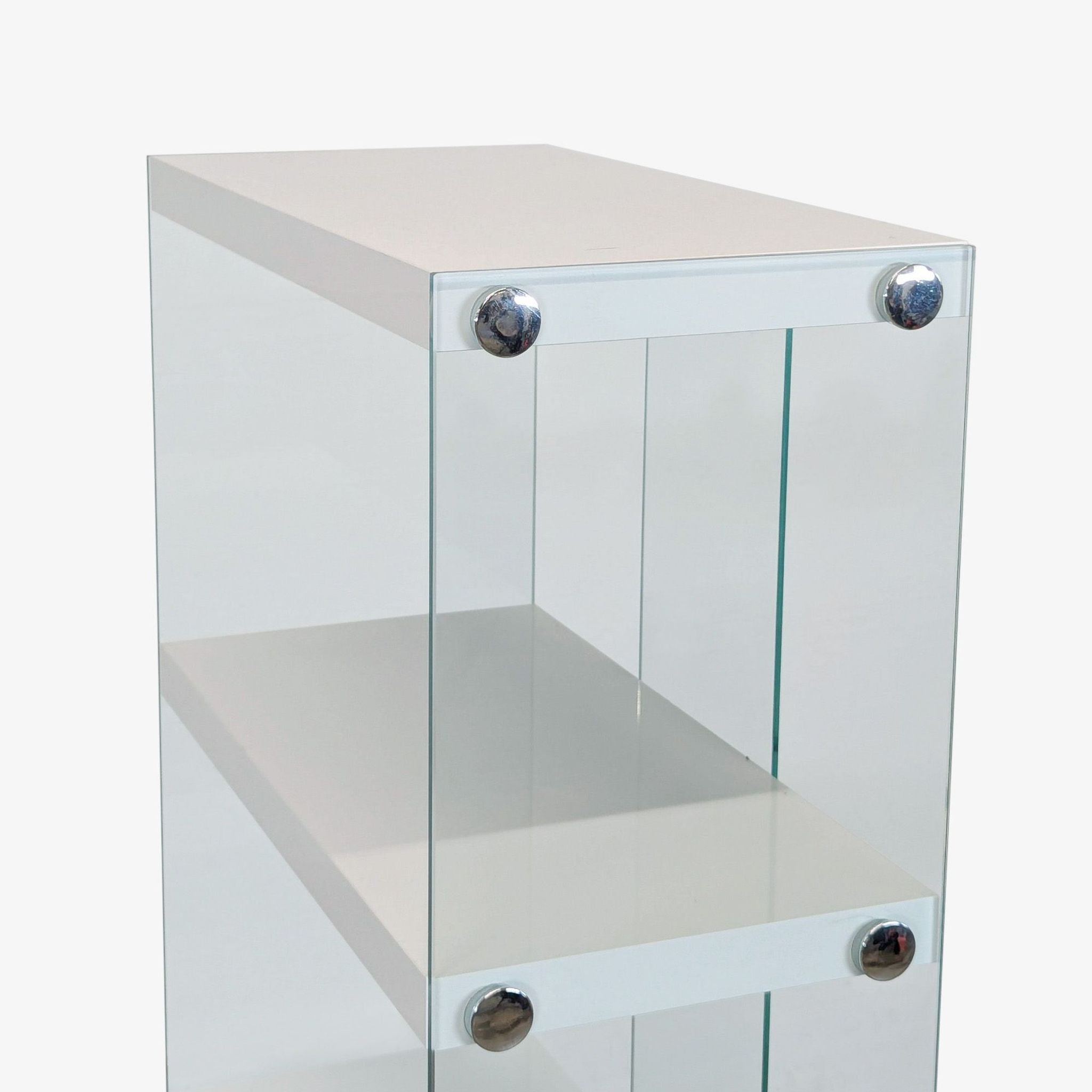Constructed of tempered glass with 5 fixed white gloss shelves and chrome accents.