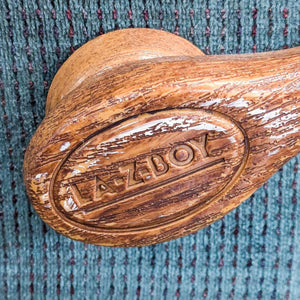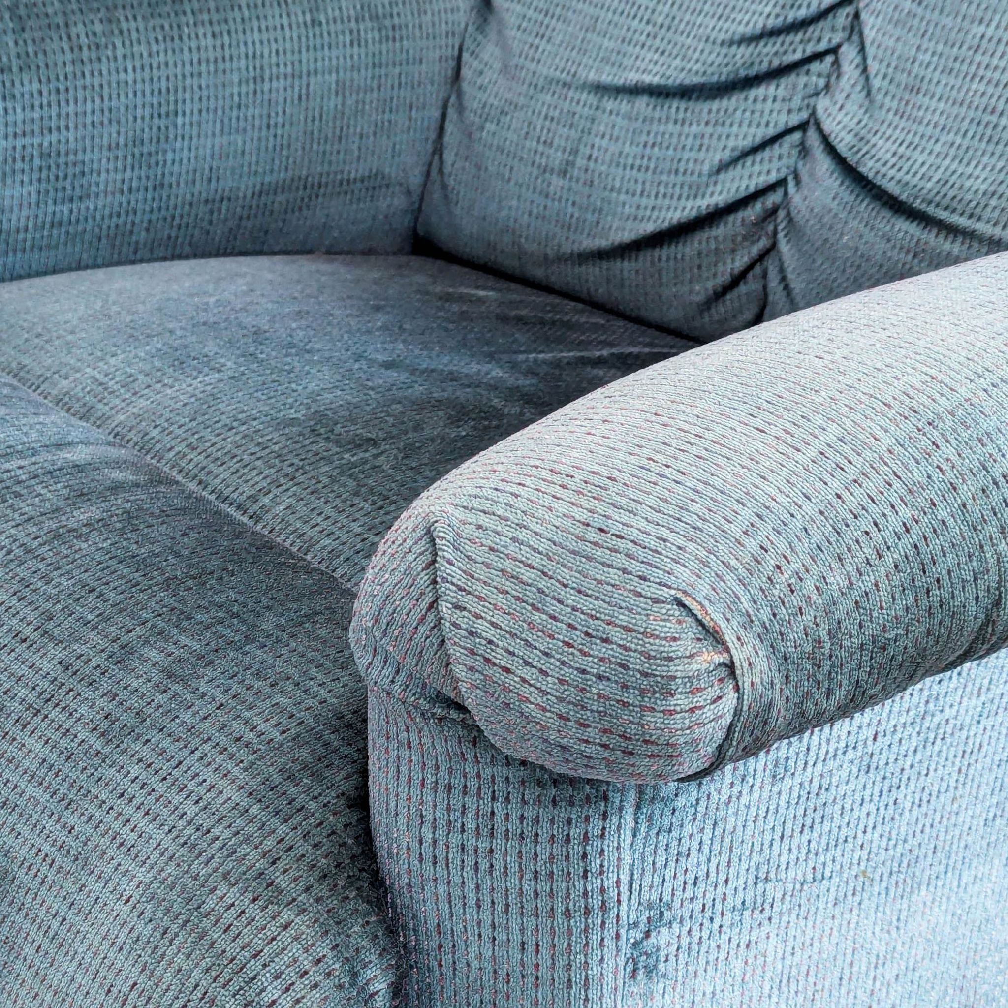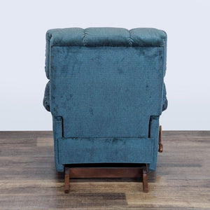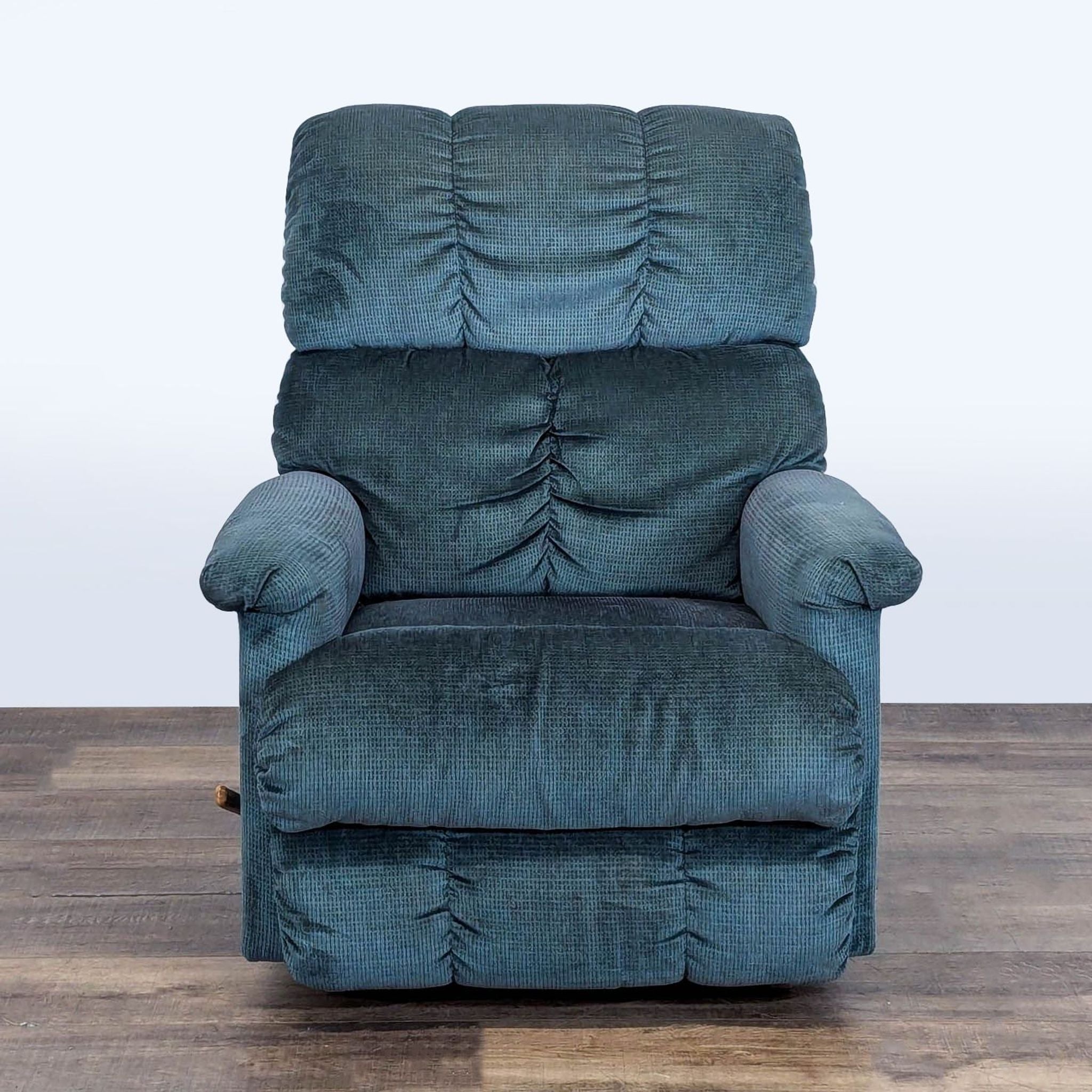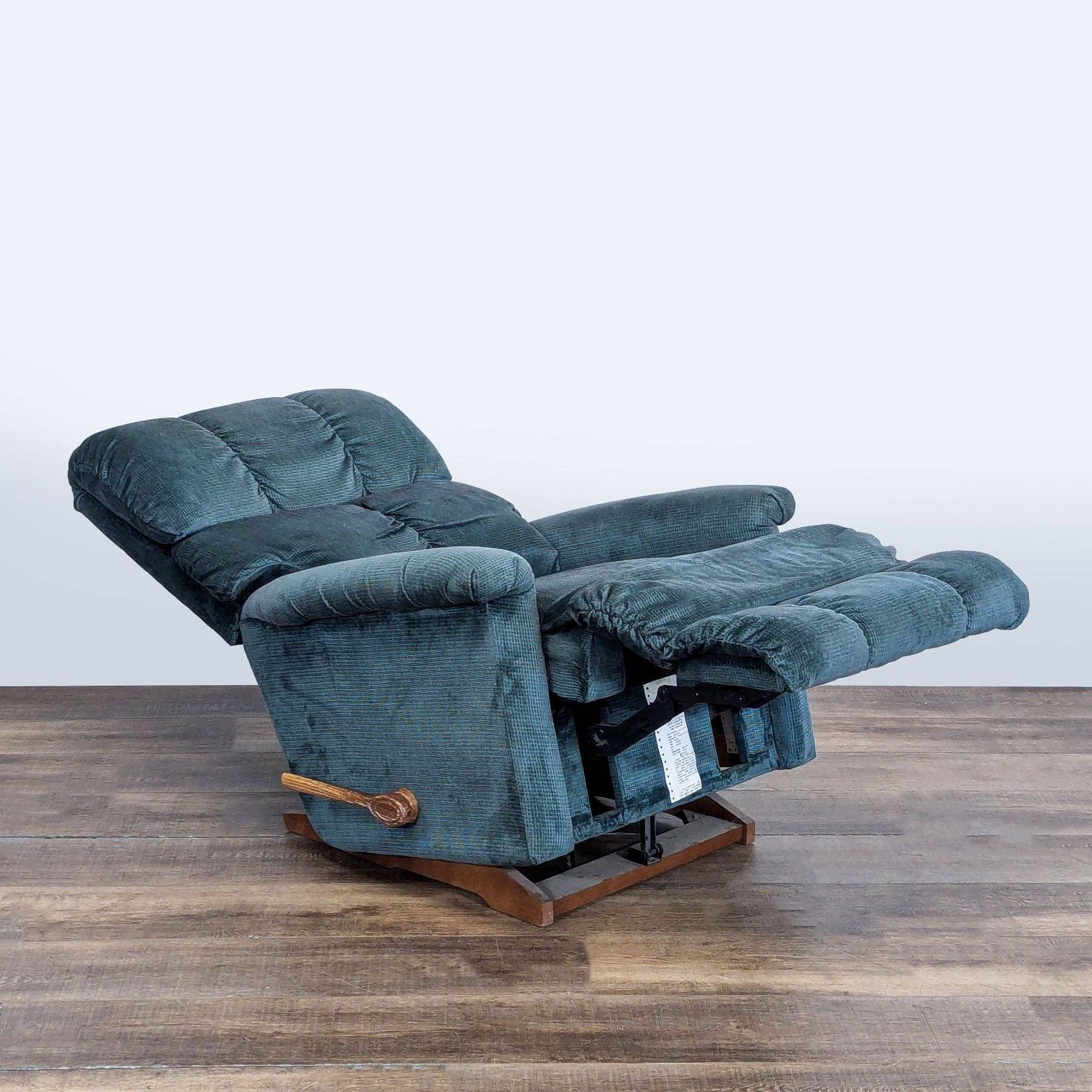 Manual recliner with blue upholstery.