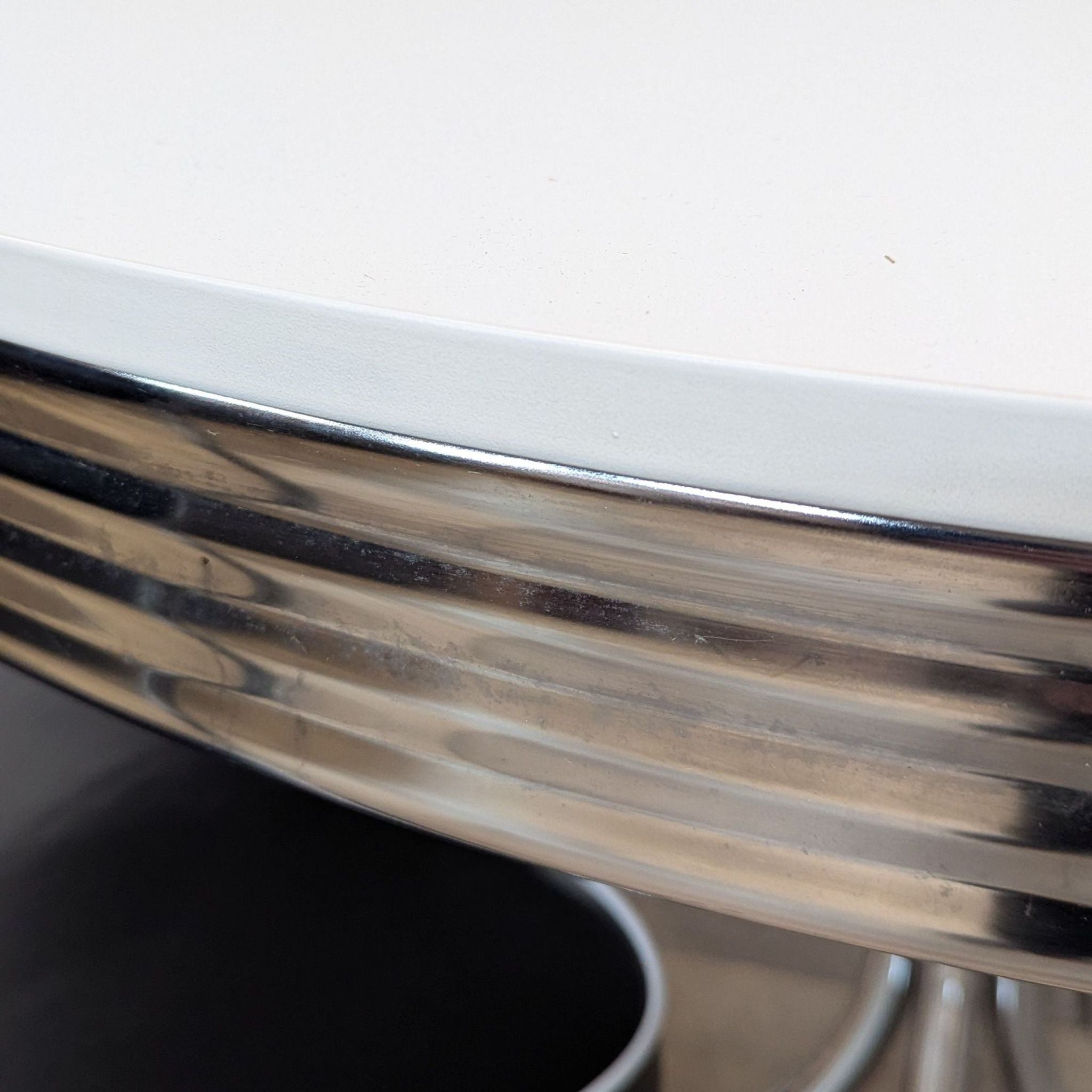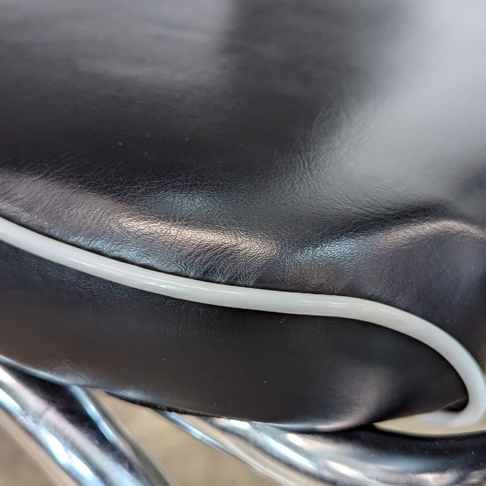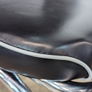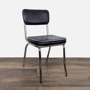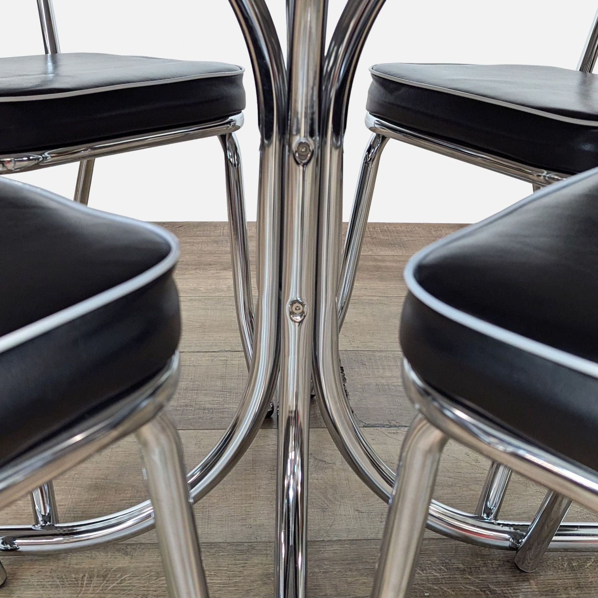 This Coaster five-piece dining set features a classic retro round dining table with a metal ellipse edge profile and shiny top with a flared metal base. Black pleather upholstery covers thick seat cushions and slender backs, with white piping details.