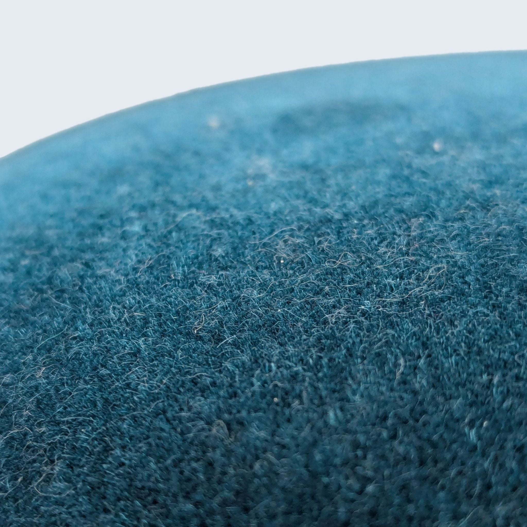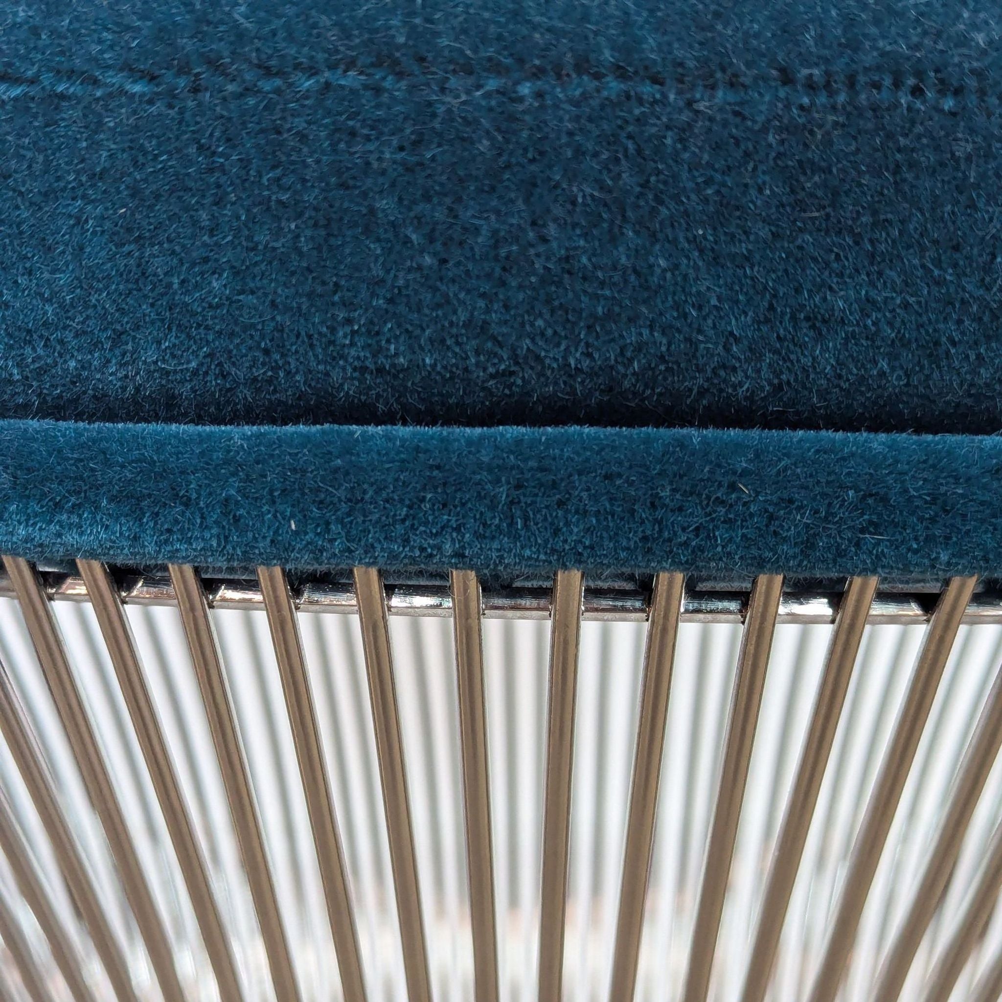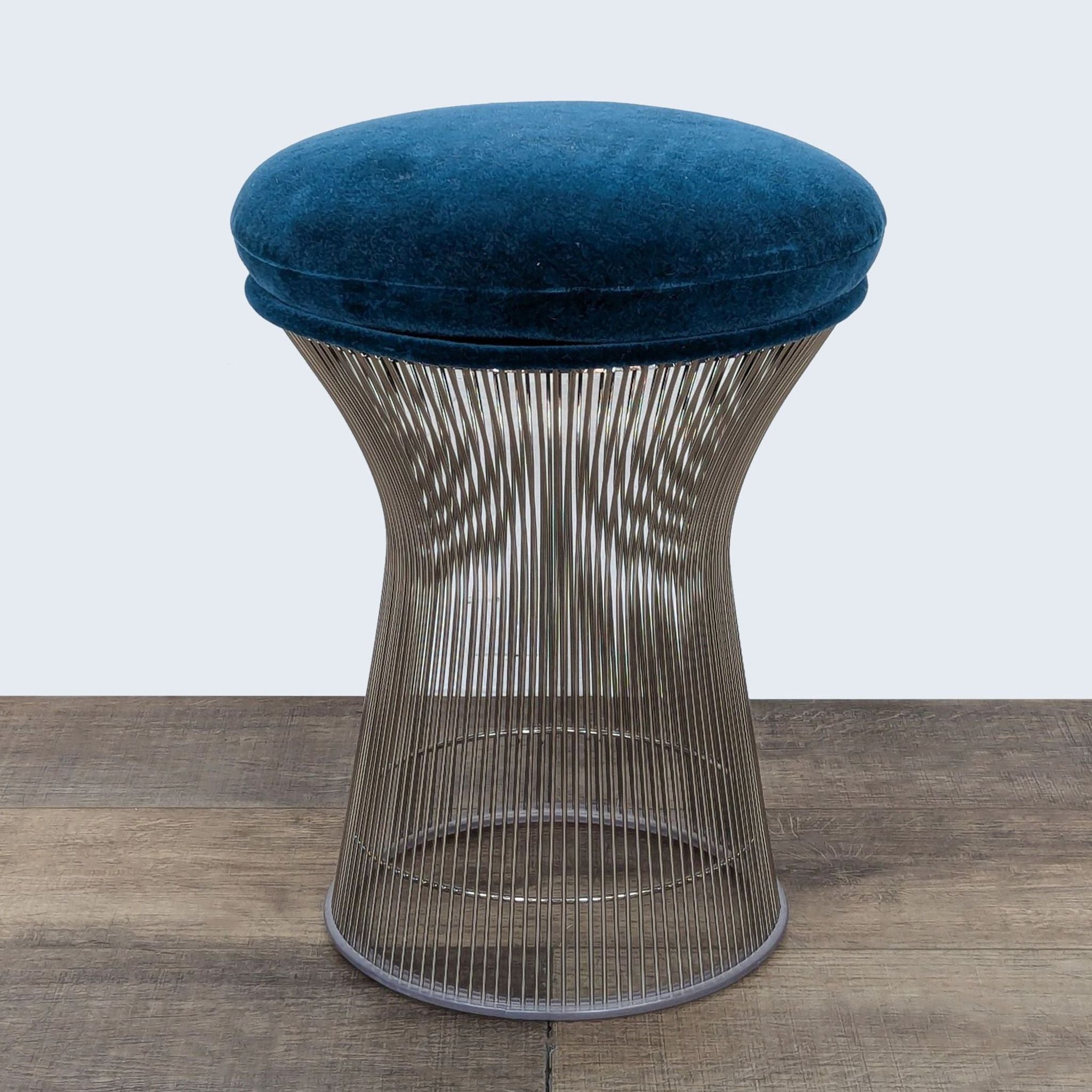 Designed by Warren Platner, the Platner stool by Knoll features a metal brushed nickel base made from curved steel rods and finished with a cushioned top upholstered in Teal velvet.