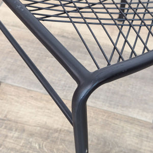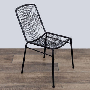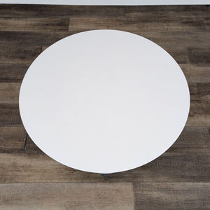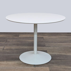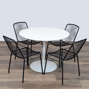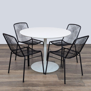This dining set features the Odyssey white wood round dining table with 4 black metal Alpha chairs with a woven back.