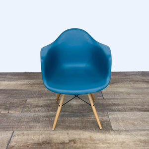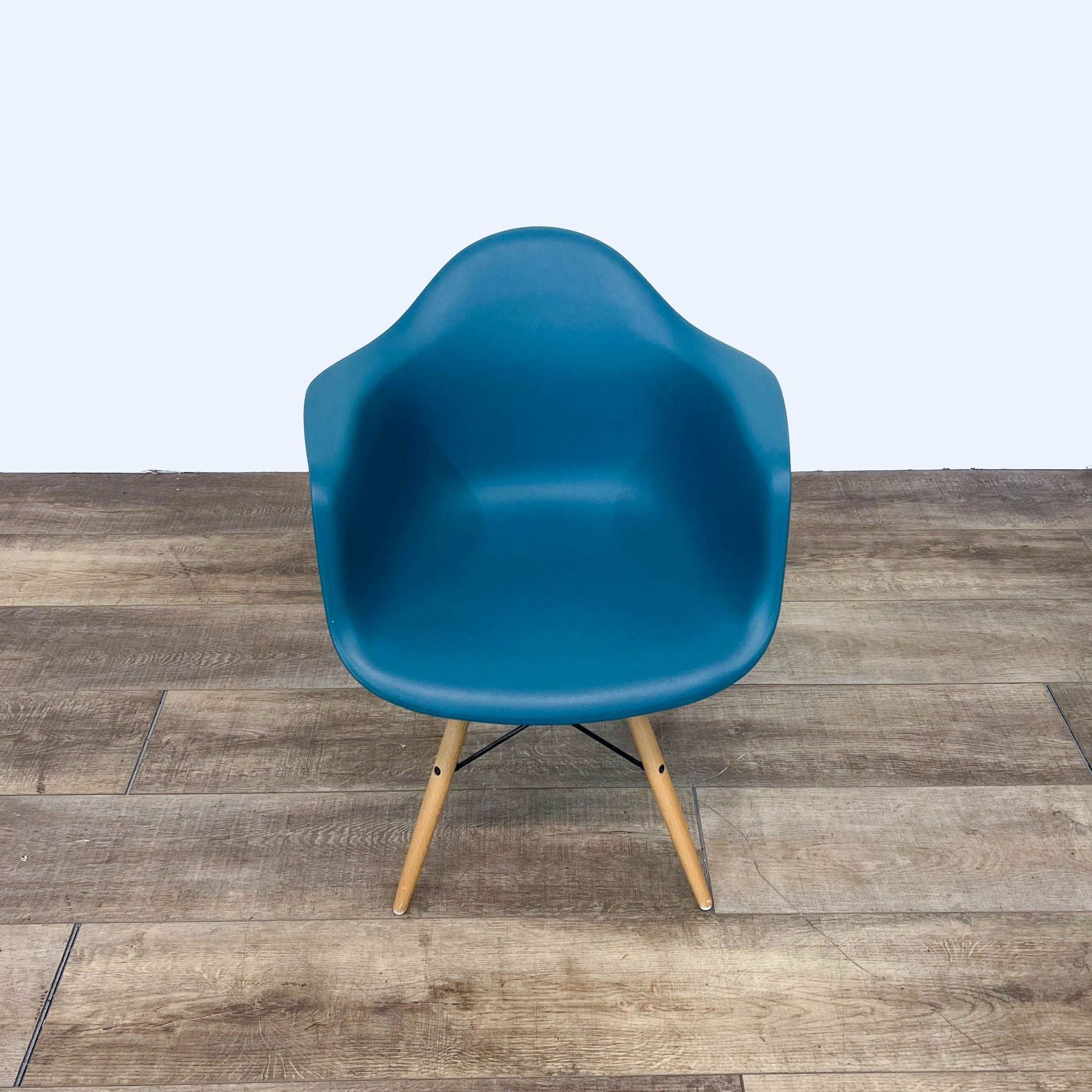 This modern armchair features a curvy, inviting seat that is made from plastic and features a chic matte finish. The Eiffel style base is crafted from contrasting wood and wire.