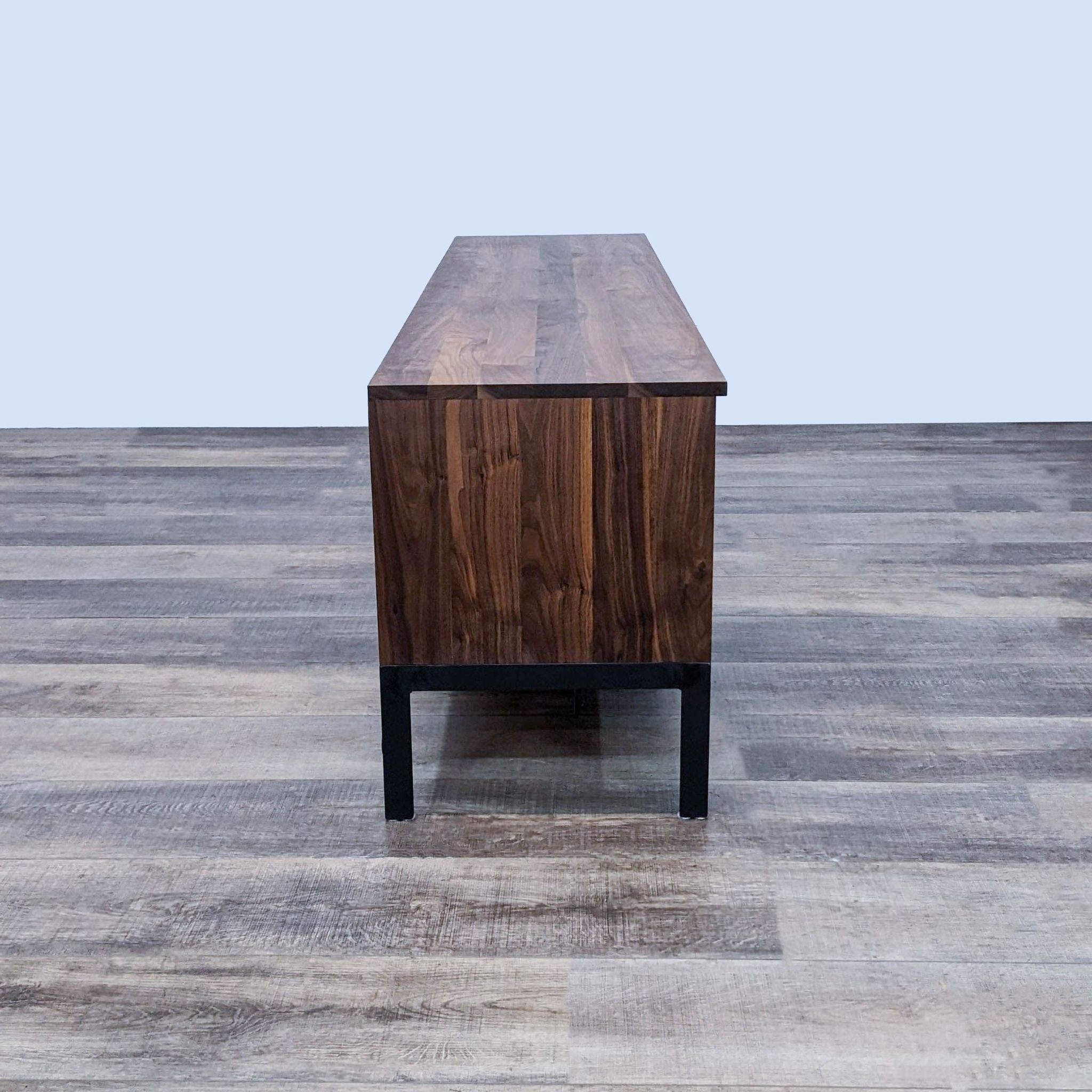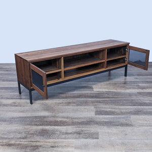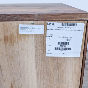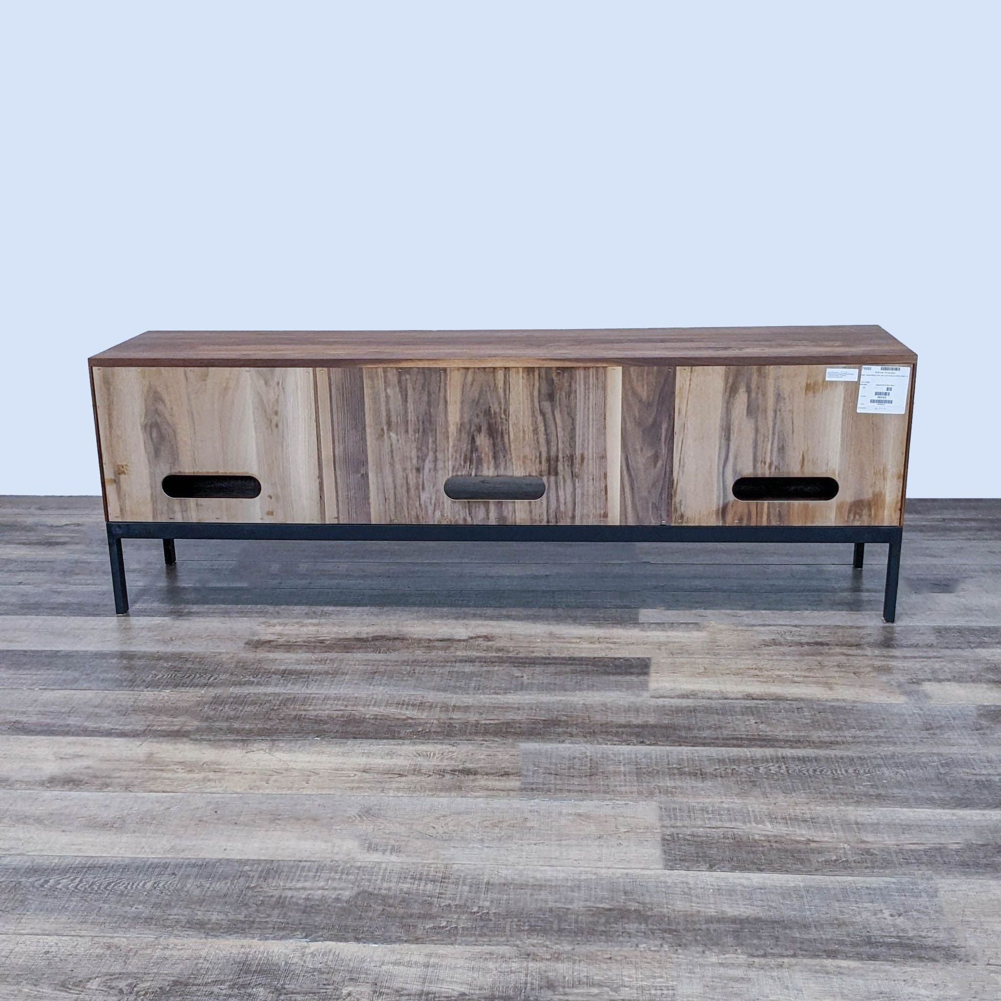 Benchmade solid wood with an unfinished wood veneer back on a hand-welded black natural steel base. The doors have a solid wood frame with a perforated metal panel. There are 3 adjustable wood shelves with black steel hardware.
