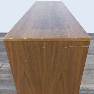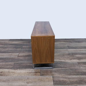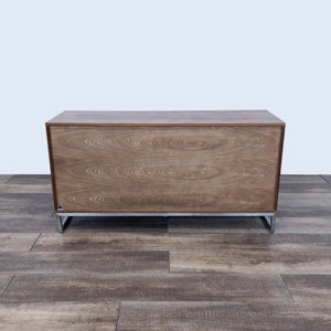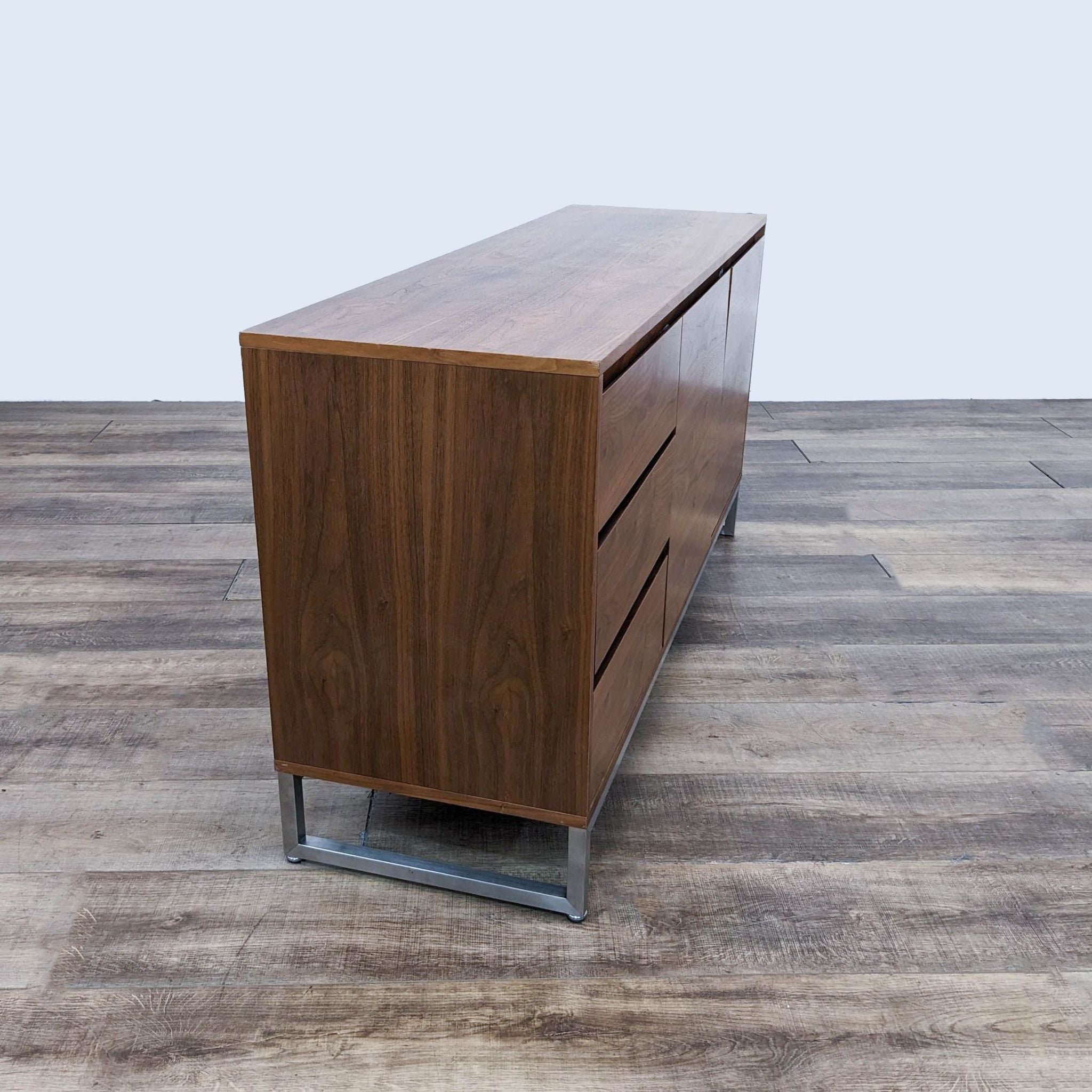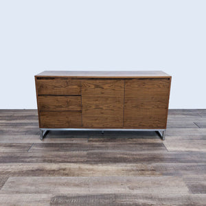 This versatile Annex dresser by Gus Modern has adjustable shelves and self-closing doors and drawers with integrated, recessed handles. The warm, walnut finish contrasts perfectly with the stainless steel base. Features: - 3 self-closing drawers and 2 self-closing doors with beveled pulls and adjustable hinge hardware - Doors reveal storage compartment with adjustable shelf - Bench-made, brushed stainless steel perimeter base with mitered corners - Water-based, clear coat finish - Non-marking leveler feet can be adjusted for stability and uneven floor surfaces