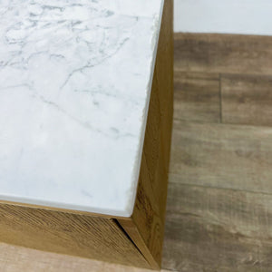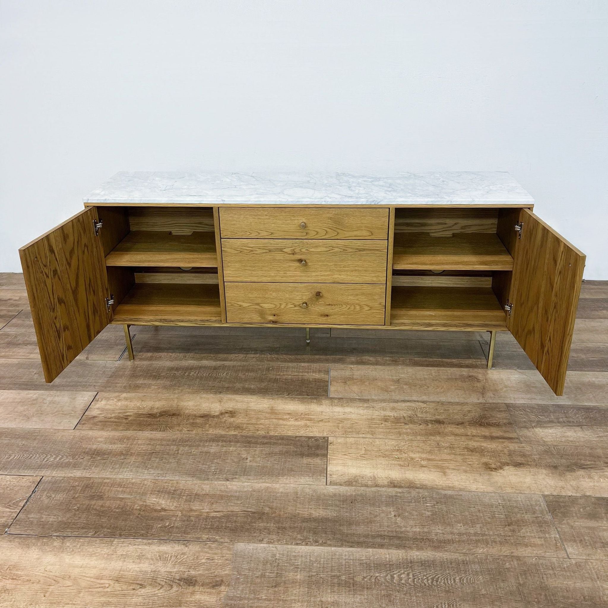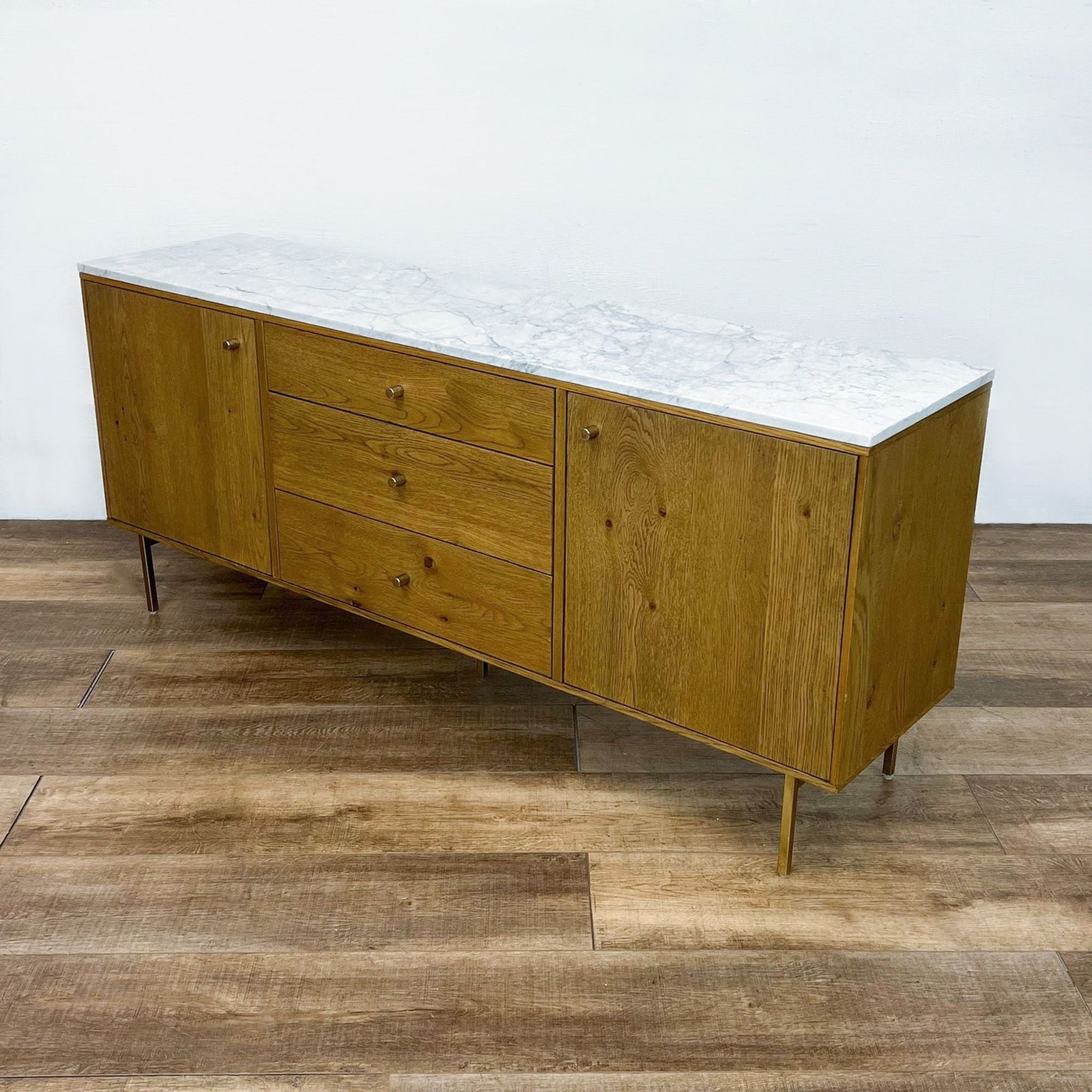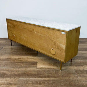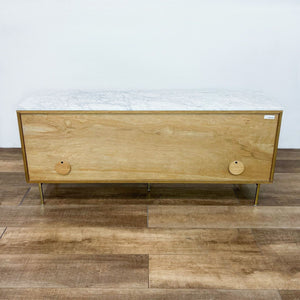 Dry oak body features brushed brass legs and hardware with a top of white marble