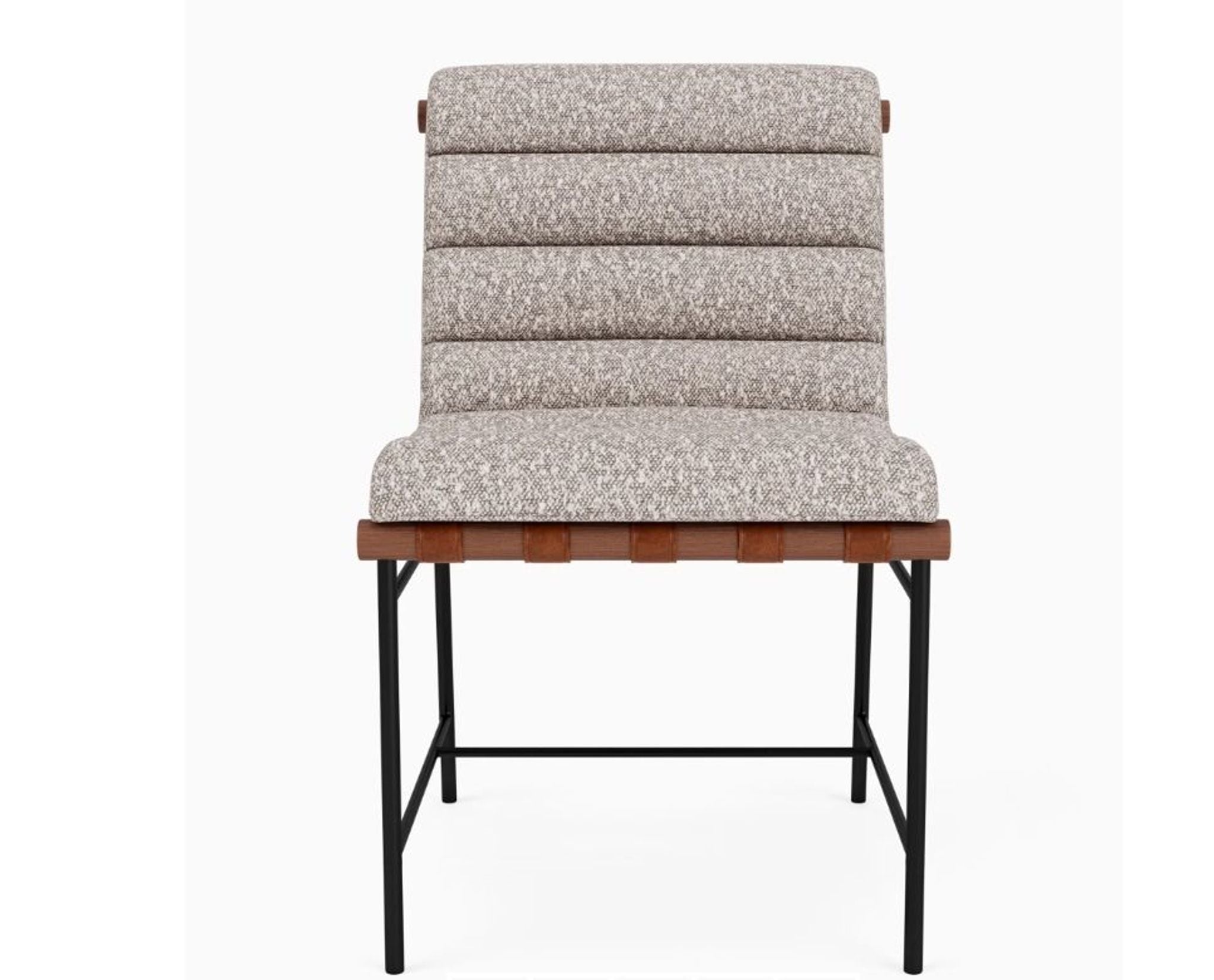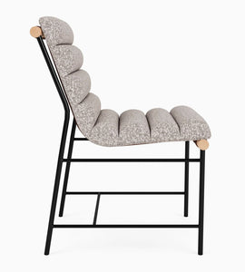 The Vail Dining Chair has a sturdy metal frame with Stone Boucle channel-tufted upholstery with leather straps. The chair's ergonomic design provides excellent support and comfort. The frame is powder-coated steel, and the dowel is white oak.