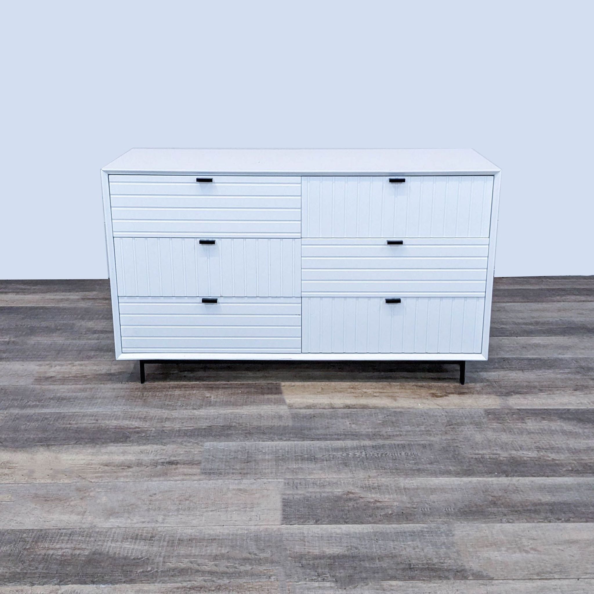 The Nova Domus Valencia Contemporary White Dresser by Vig furniture is constructed with 6 drawers with horizontal and vertical ridges on the fronts and black handles. Durable black metal legs keep this dresser poised.