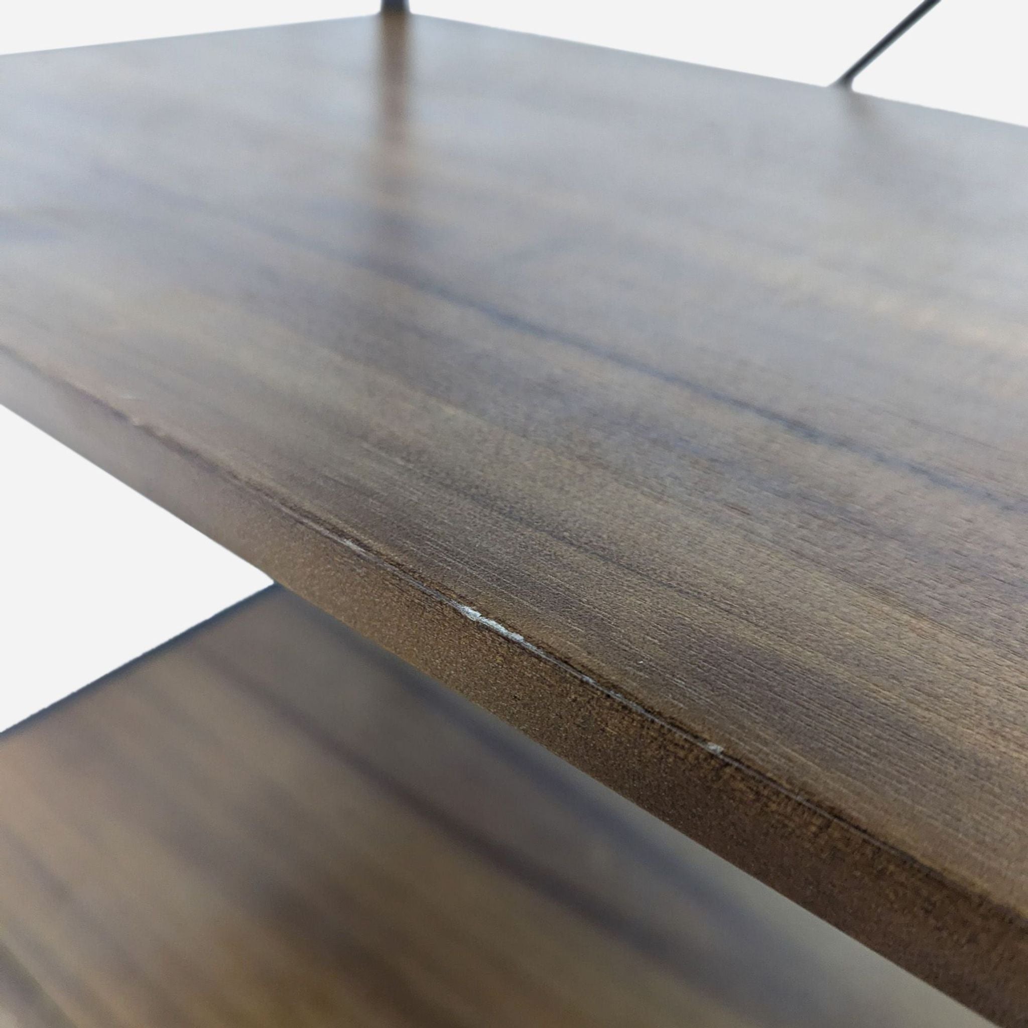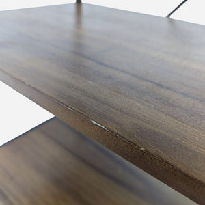 Acacia veneer over engineered wood supported by a black matte steel frame.