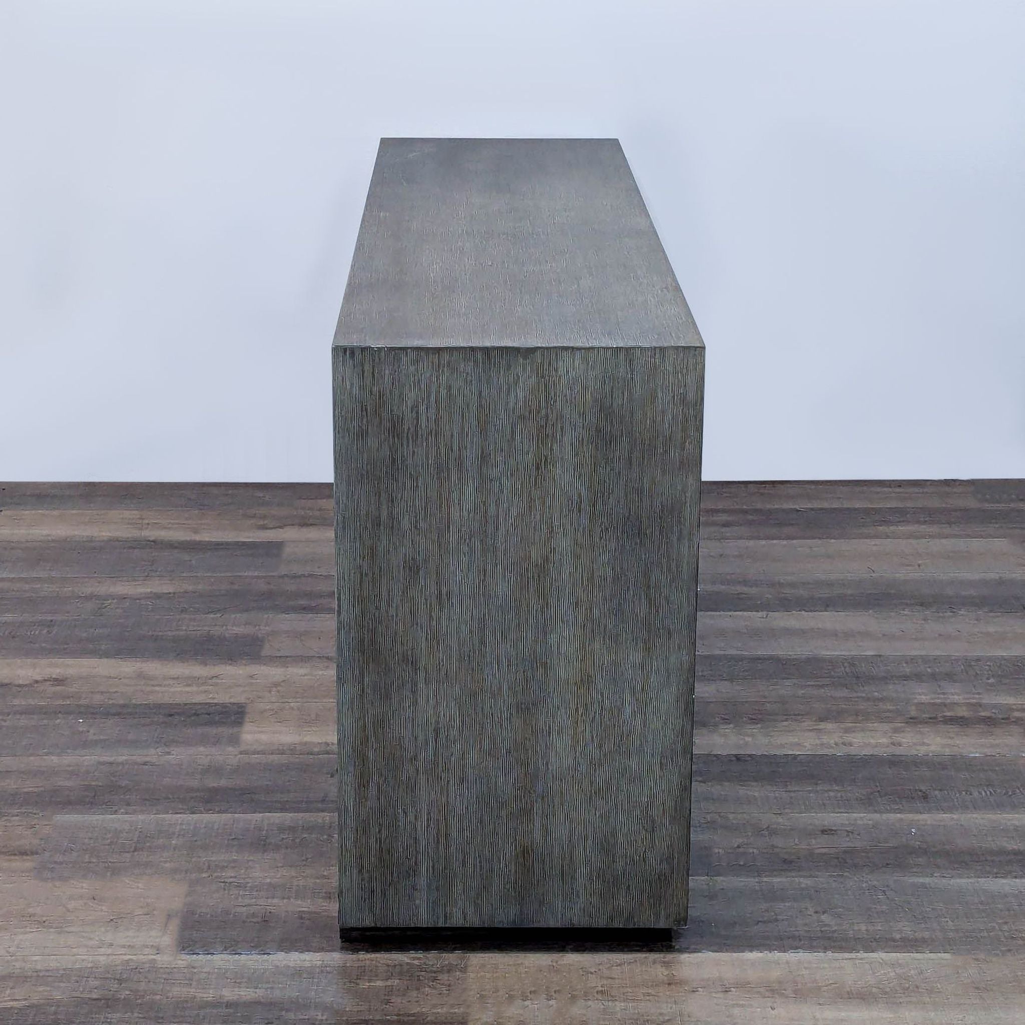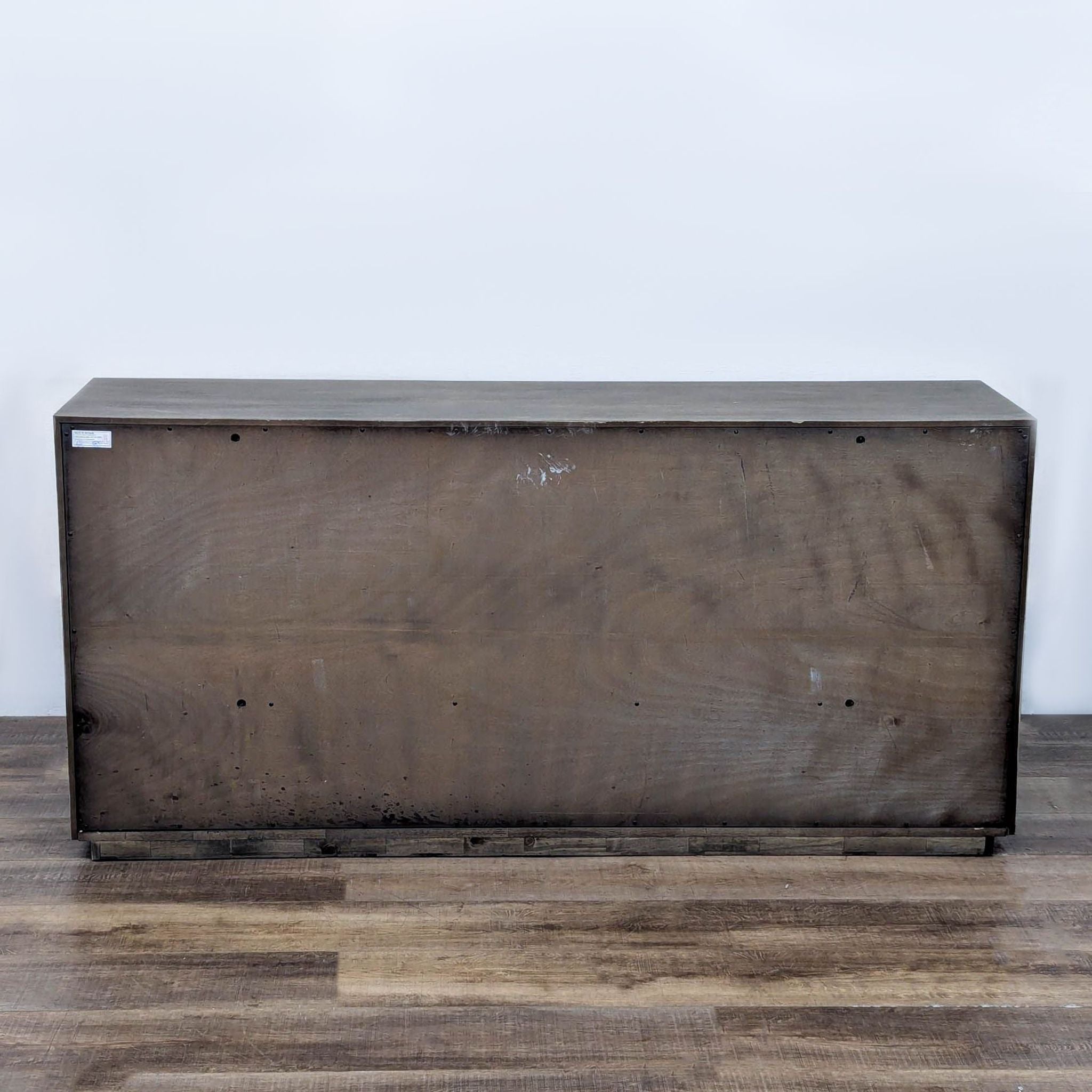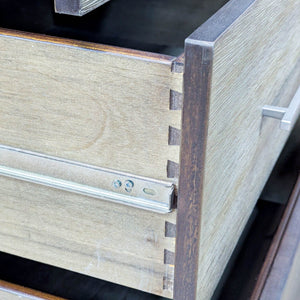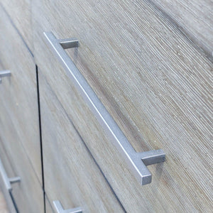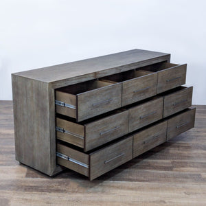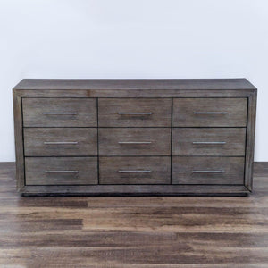 this 9-drawer dresser by Wade Logan combines clean lines, quality construction, and tons of storage with 9 felt lined drawers with dovetail joinery and chrome bar style pulls. Finished in a neutral weathered gray-brown.