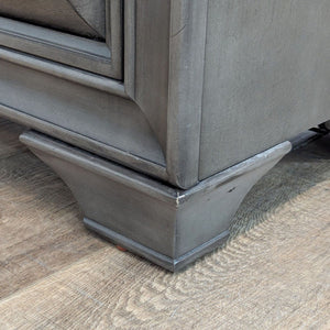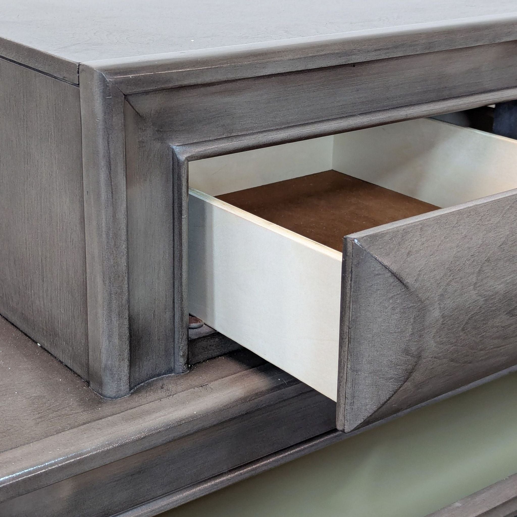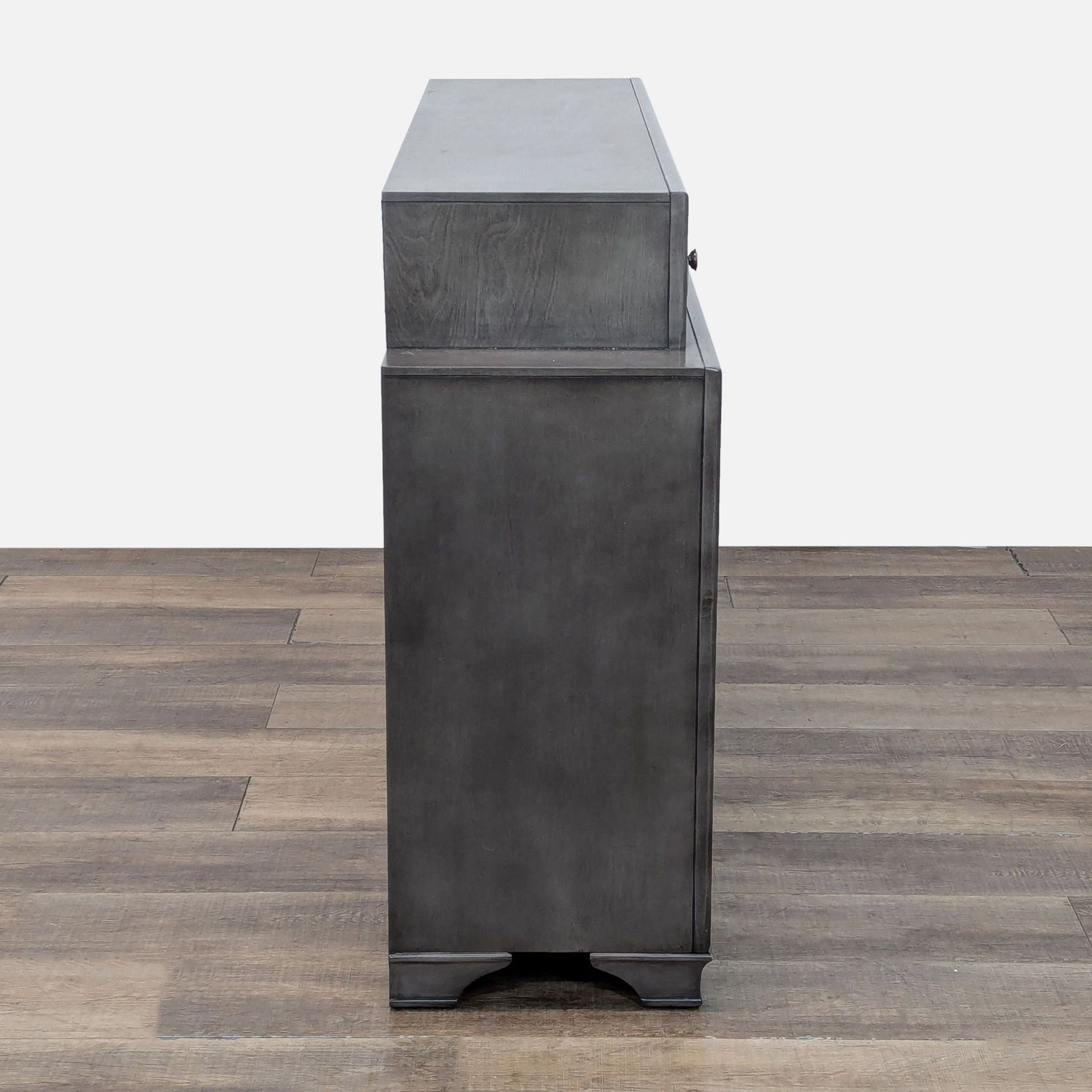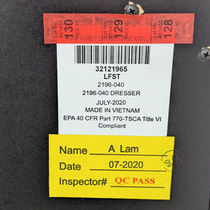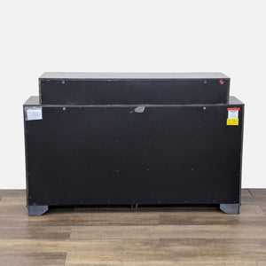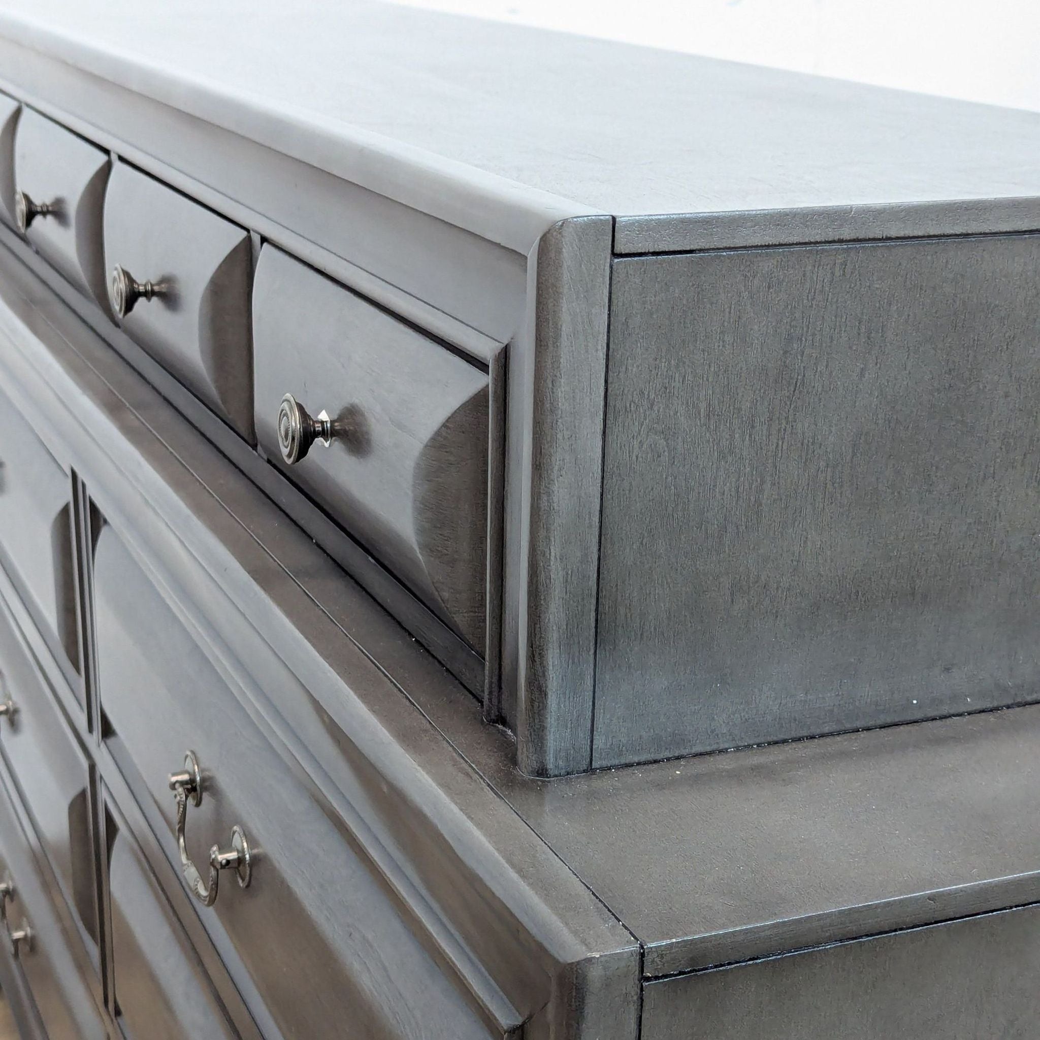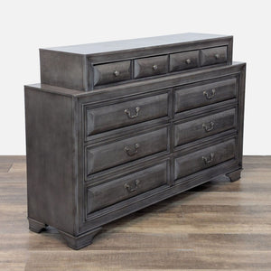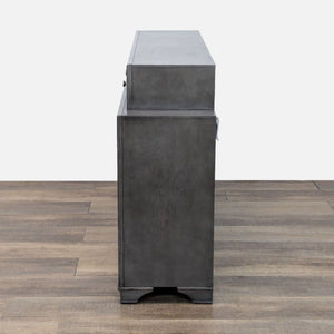 The dresser is crafted from solid wood and wood veneers, with durable English dovetail drawer construction and smooth center metal glides for easy access.