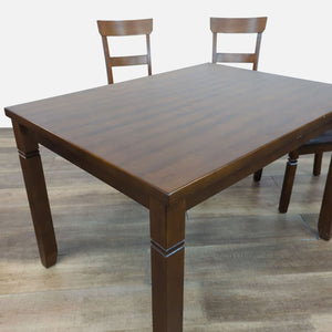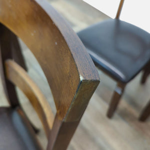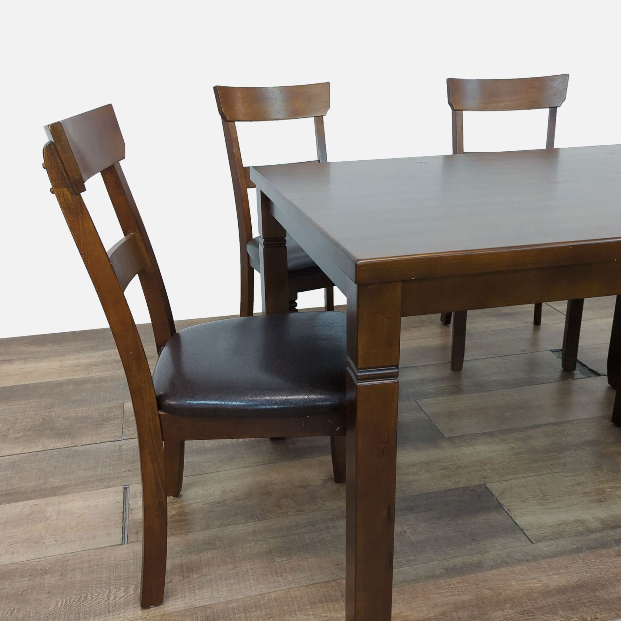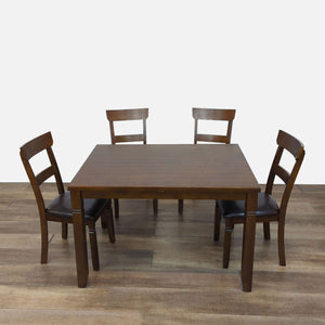 This dining set includes one table and four chairs in espresso finish with rich brown faux leather seats.