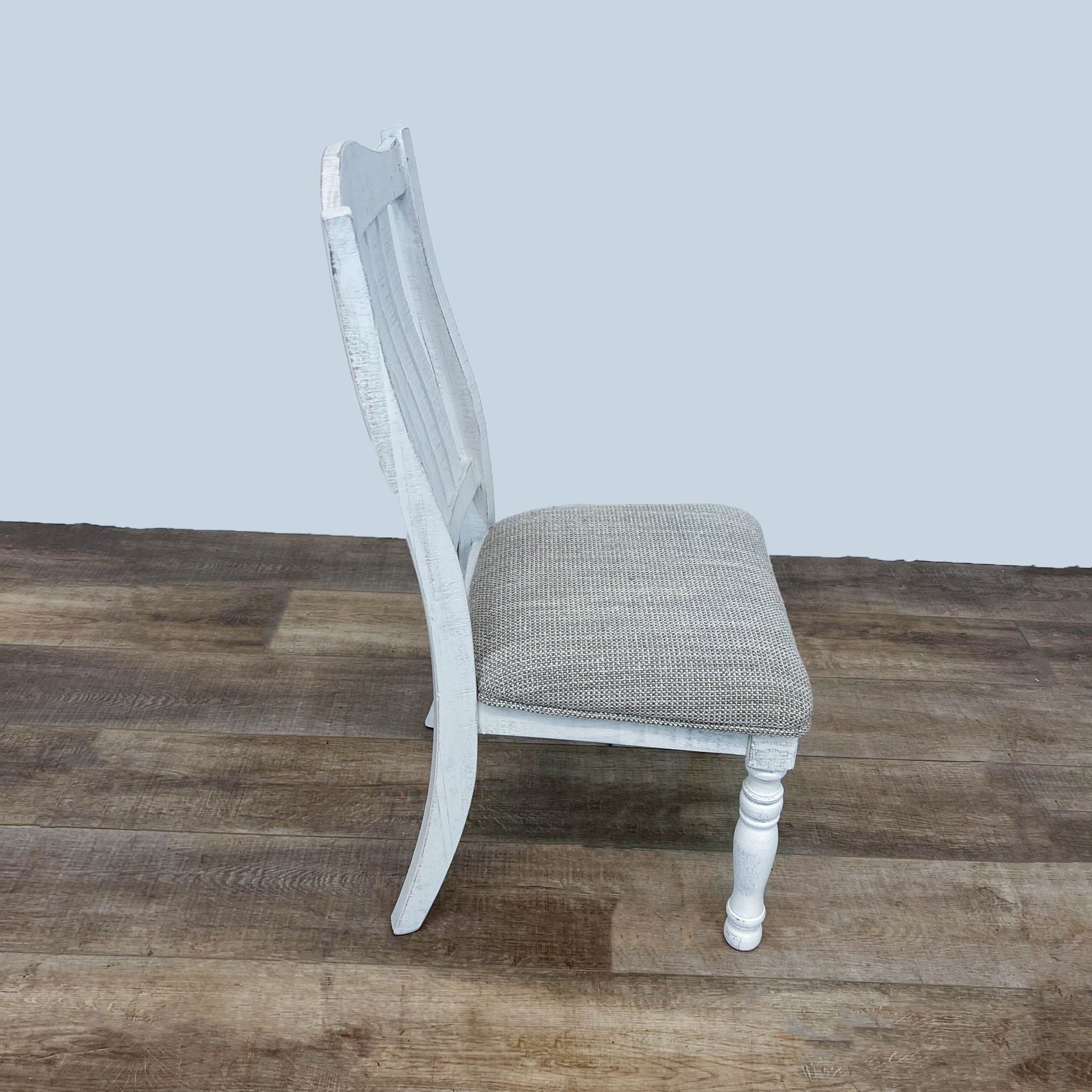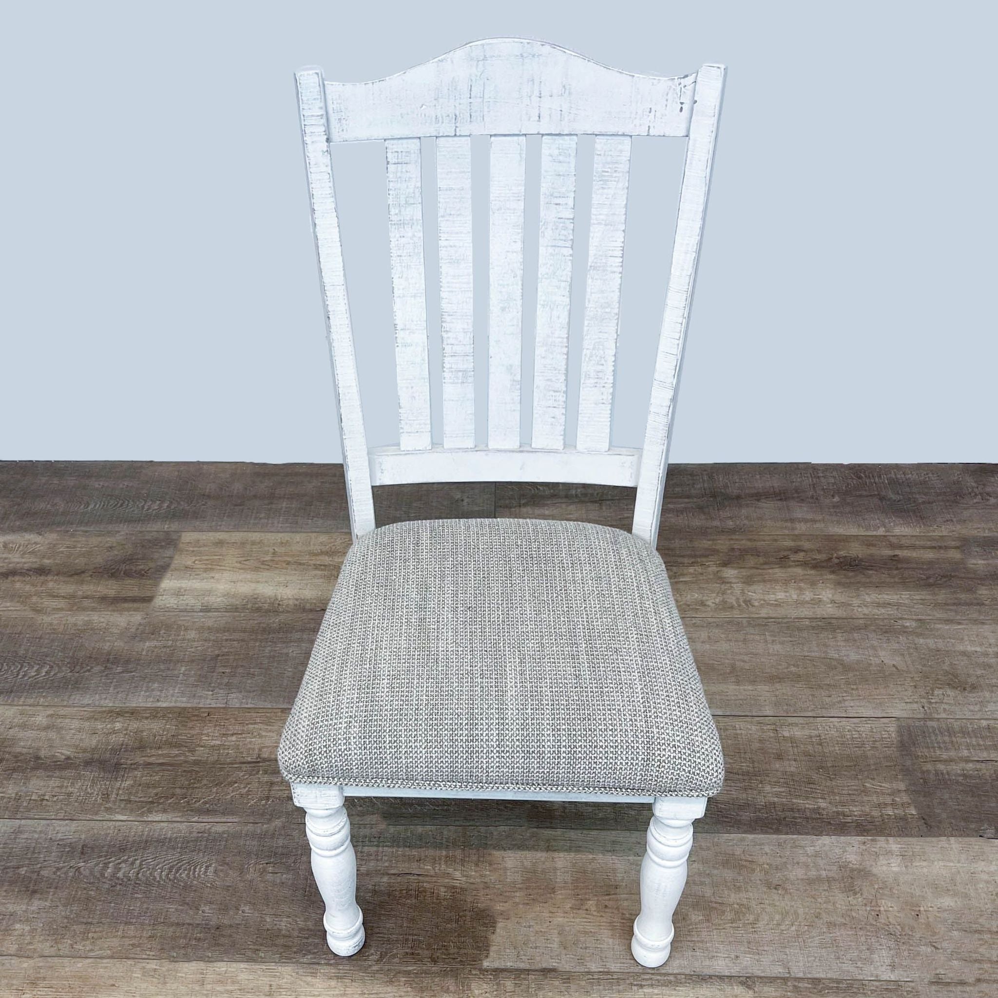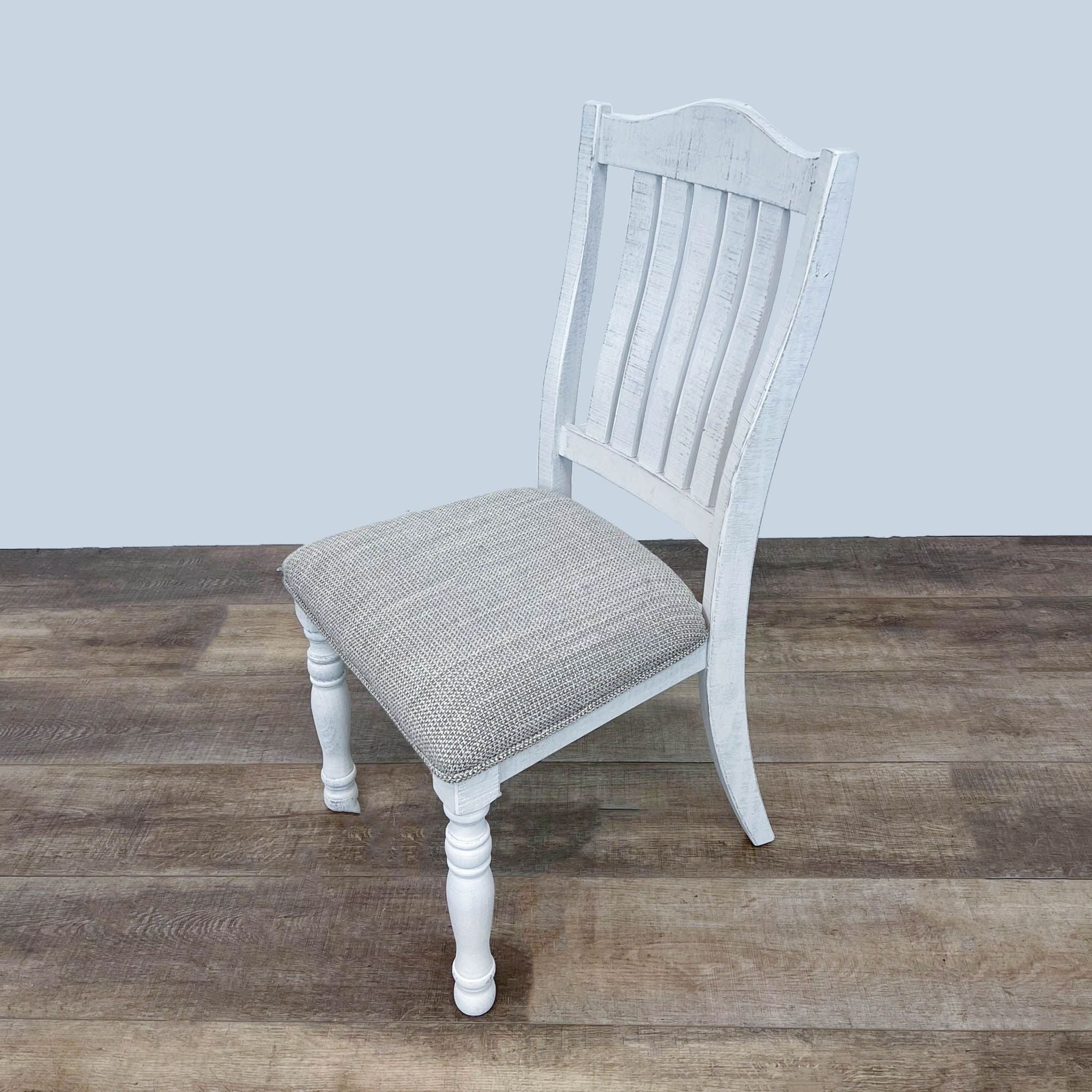 The Havalance 7-Piece Dining Set from Ashley Furniture boasts modern farmhouse style with a distressed, vintage-style blended with weathered neutrals for an utterly charming effect. The table features robust legs for a substantial look while the bent slat back design and cushioned upholstered seat of the dining chairs cater to the aesthetic.