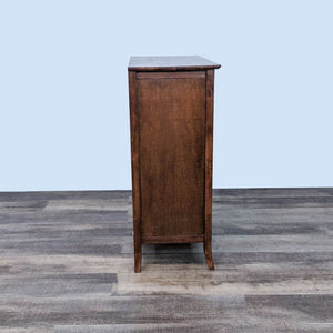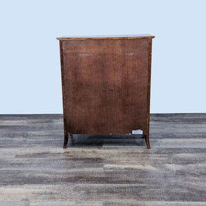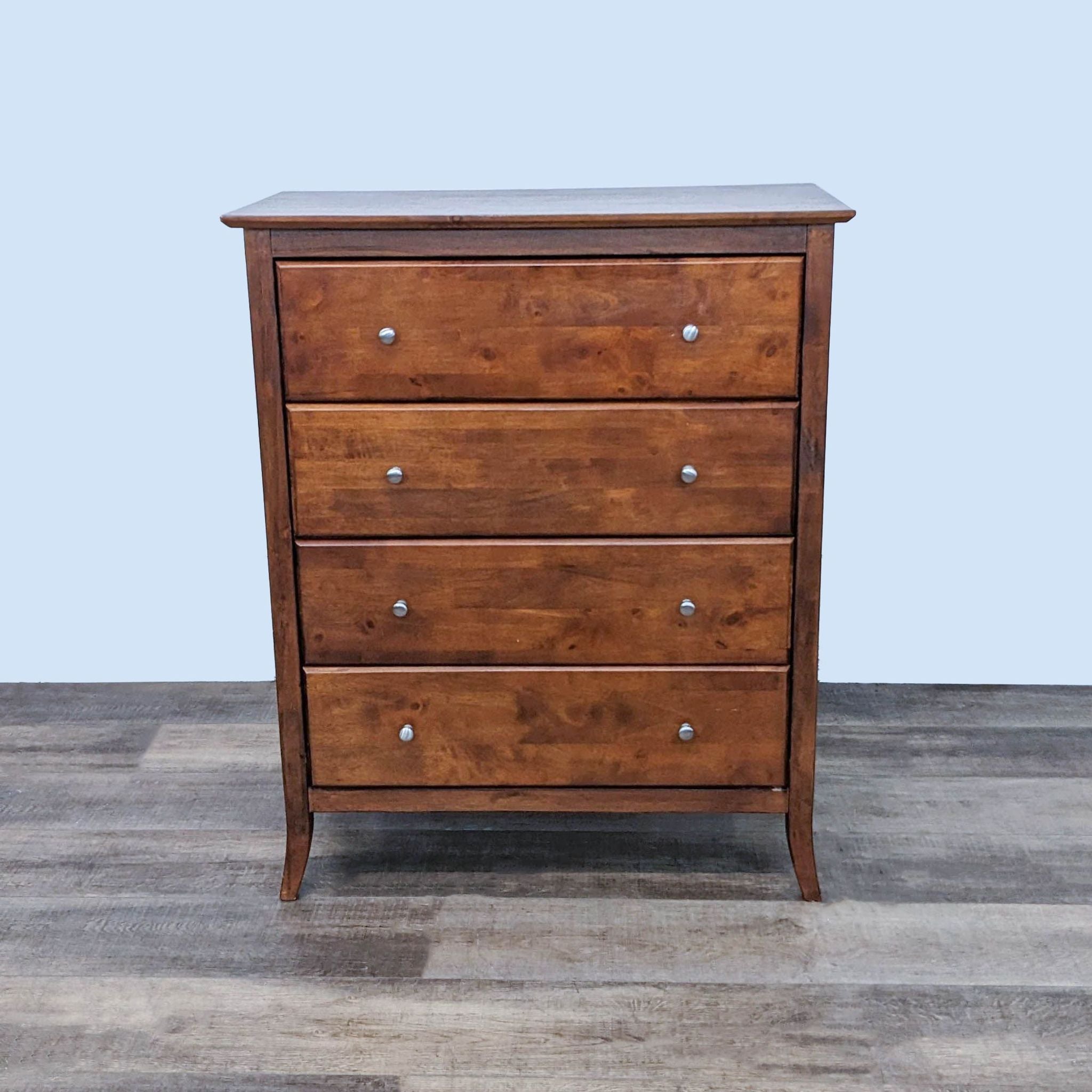This transitional dresser features clean lines and four drawers with metal glides and silver knobs.