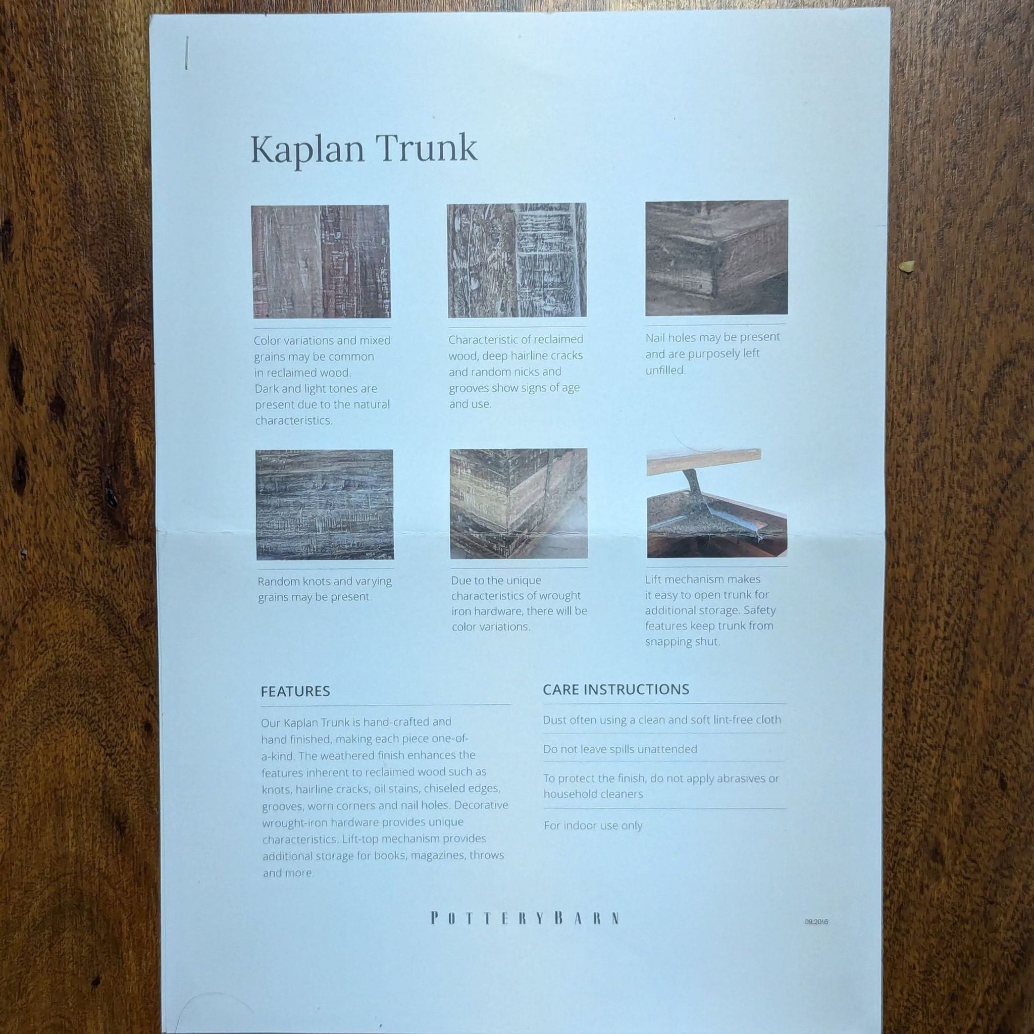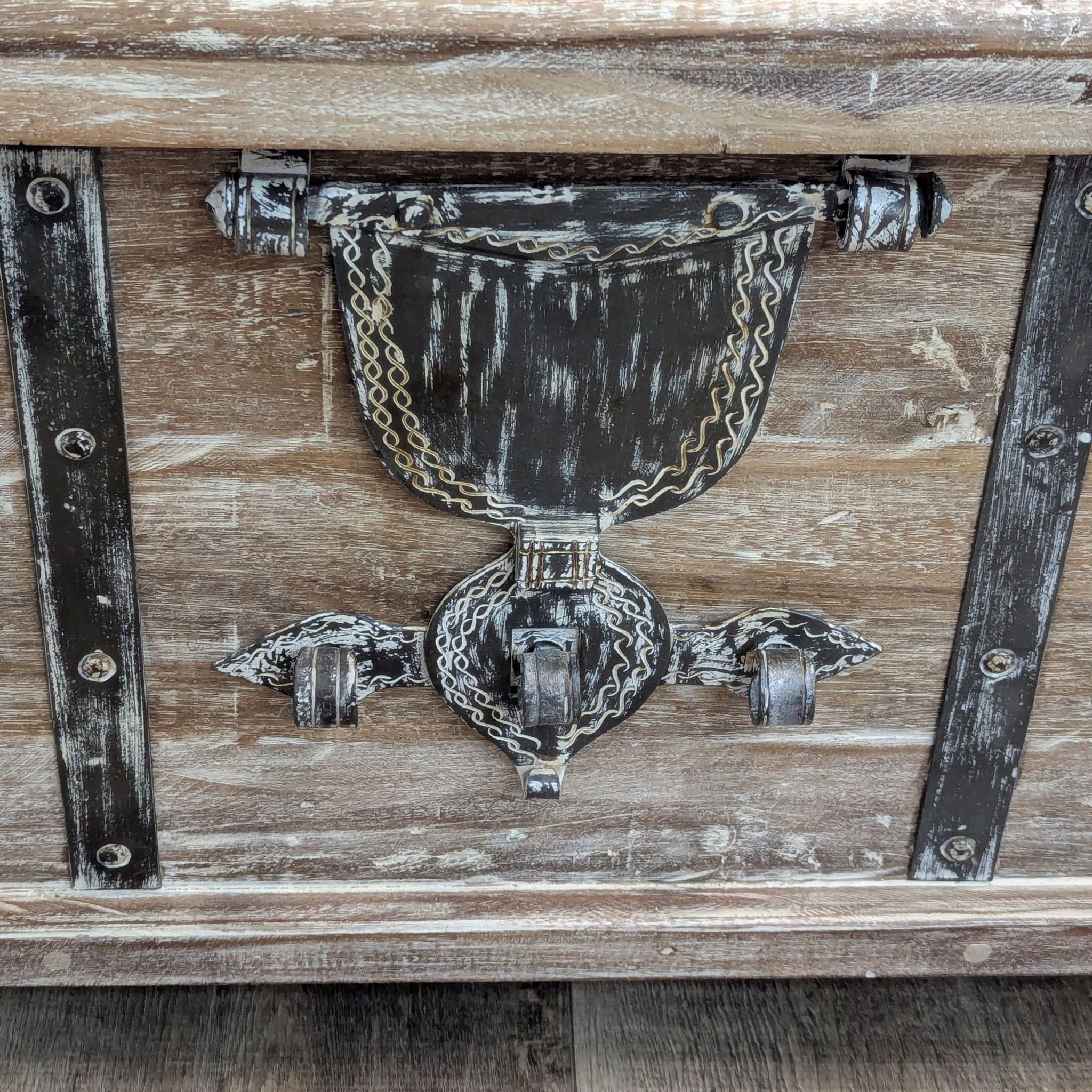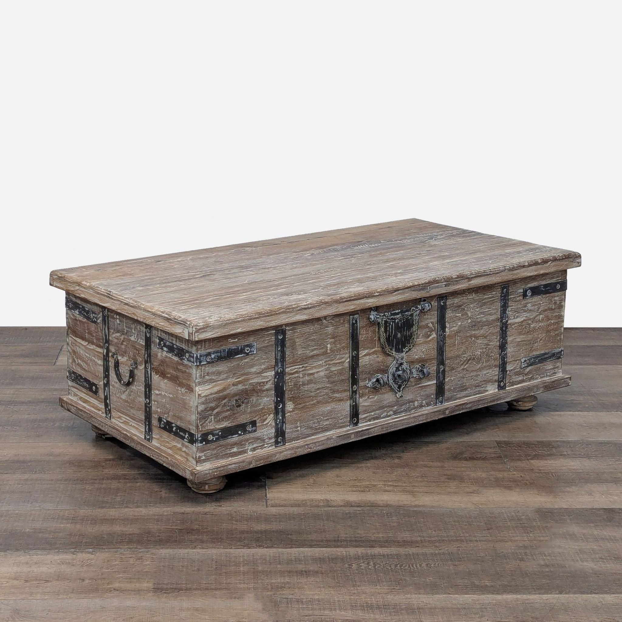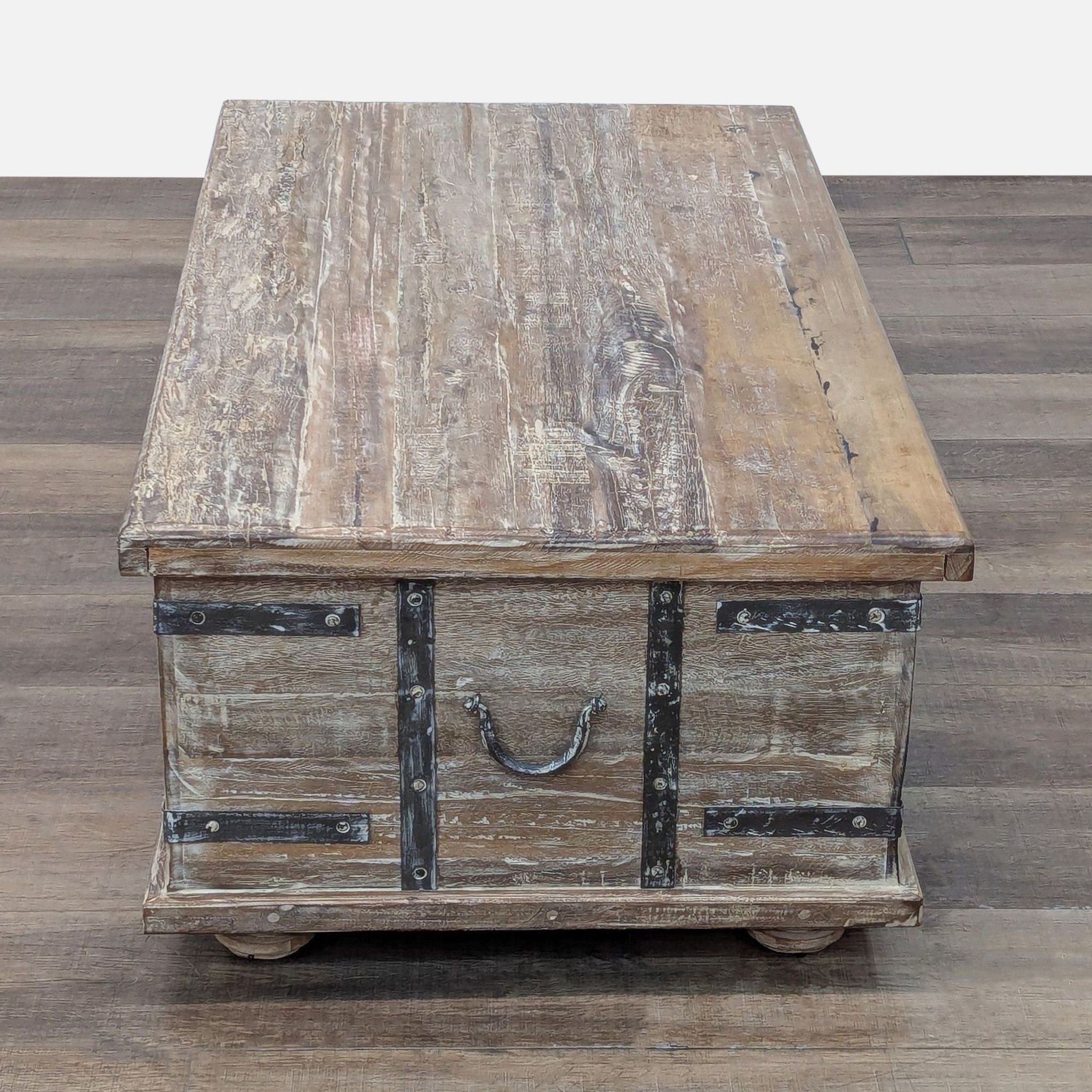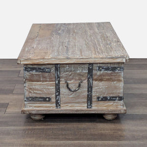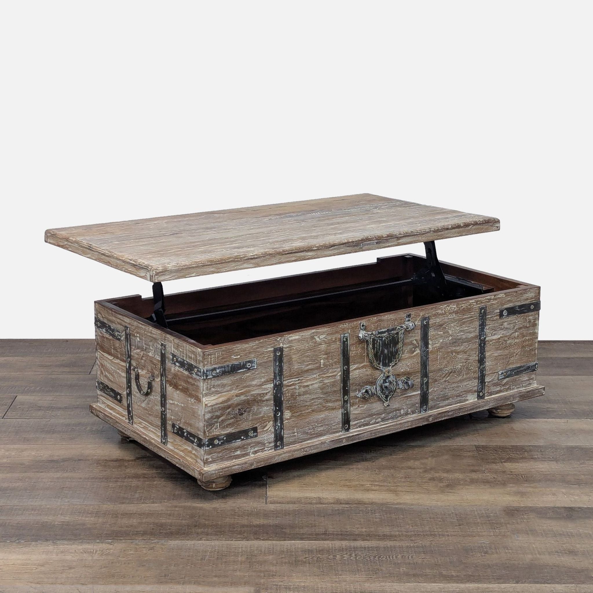 Lift-top table constructed of solid reclaimed wood with wrought iron hardware. The table is hand-crafted & hand-finished.