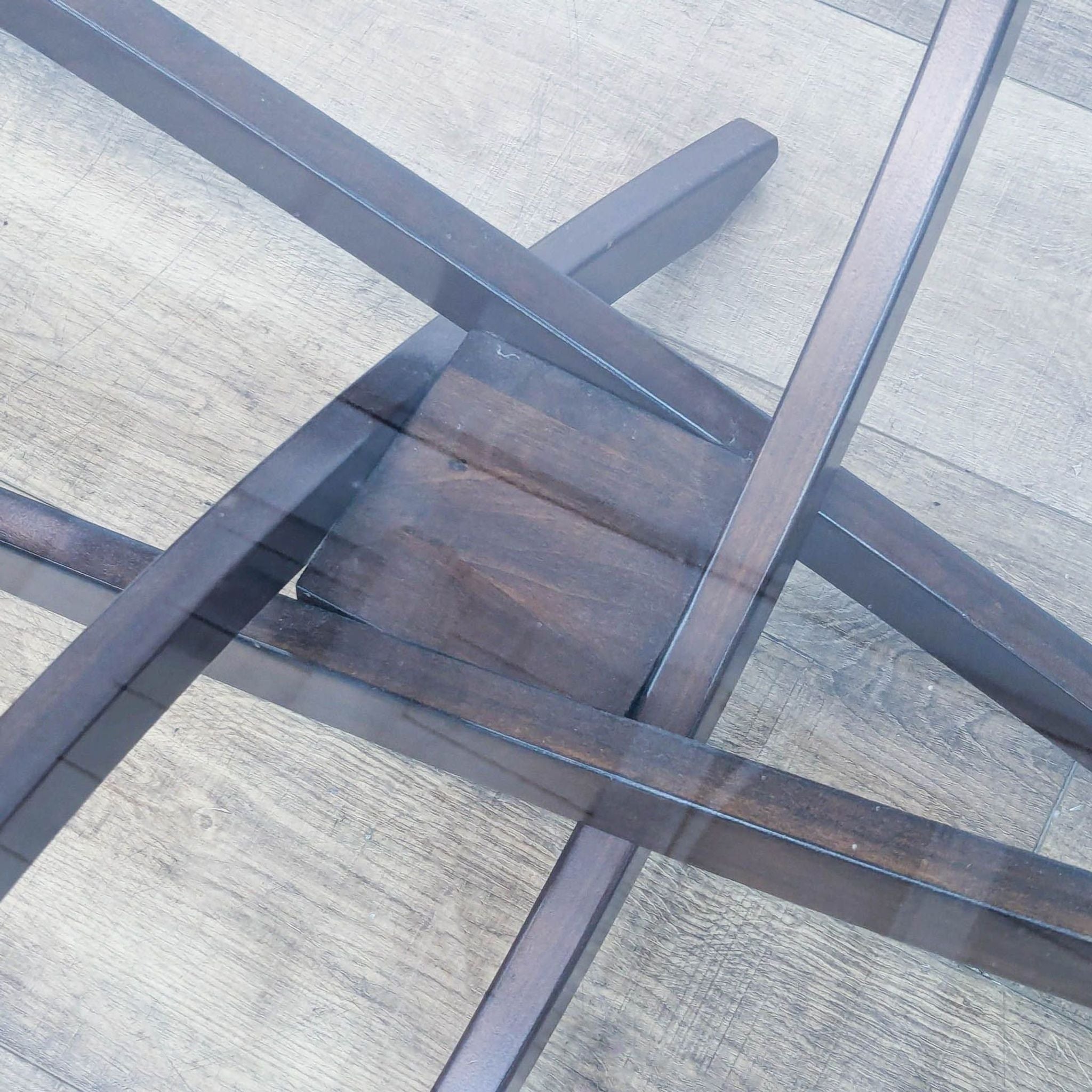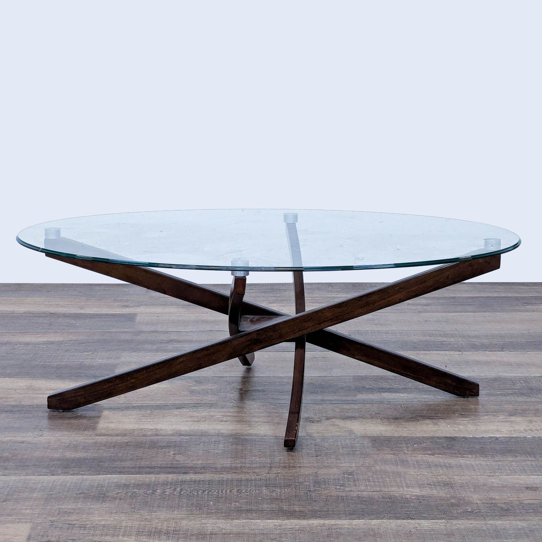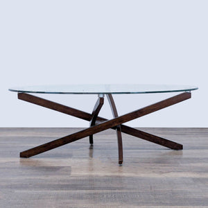The table is inspired by the vintage Mid-Century starburst motifs. The oval tempered glass tabletop is suspended atop a strut base in an espresso finish.