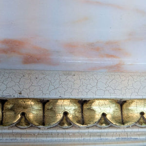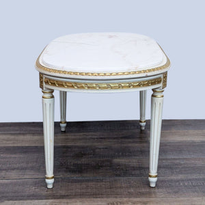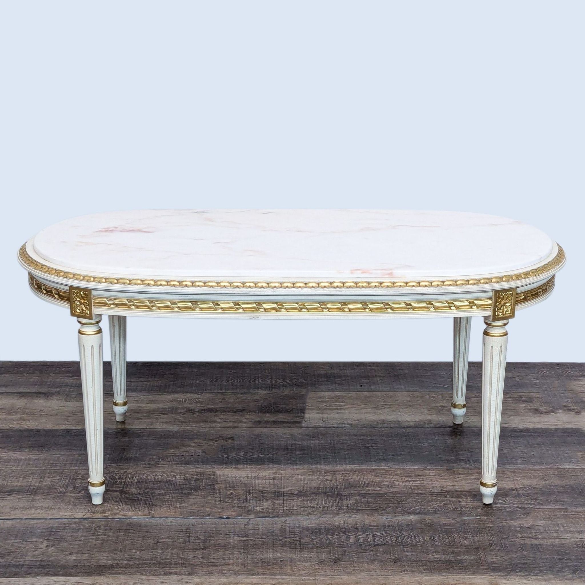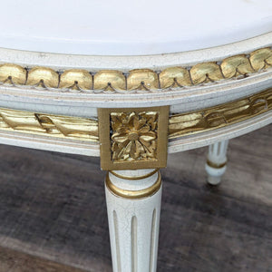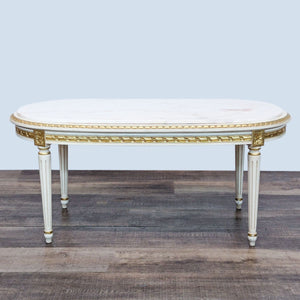 Painted French style oval marble-top table, with foliate decorated apron above fluted tapered legs