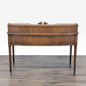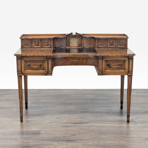 This classic wooden desk features multiple drawers for storage and a built-in clock for added charm. The desk has sturdy legs and plenty of workspace, making it ideal for home or office use. Its elegant design and practical layout make it a perfect addition to any room.