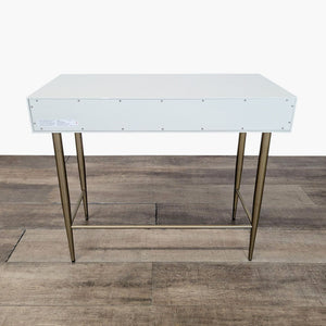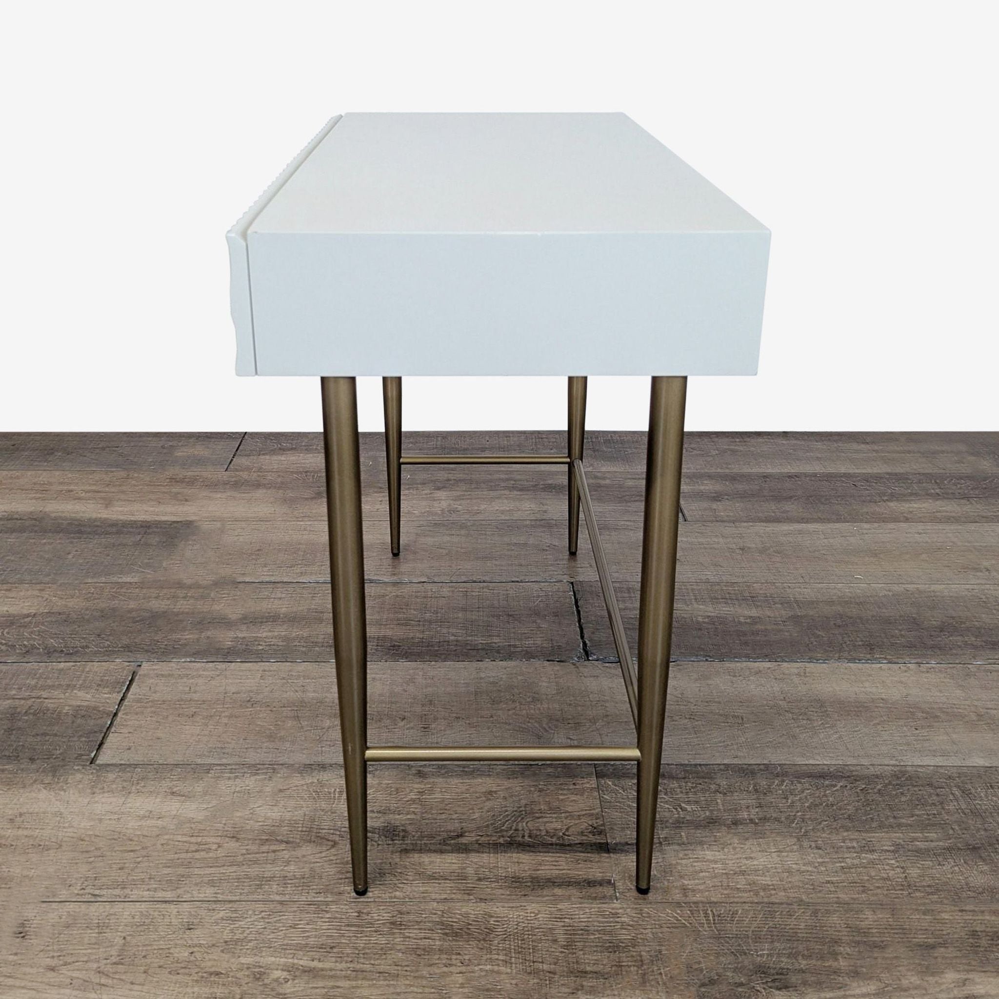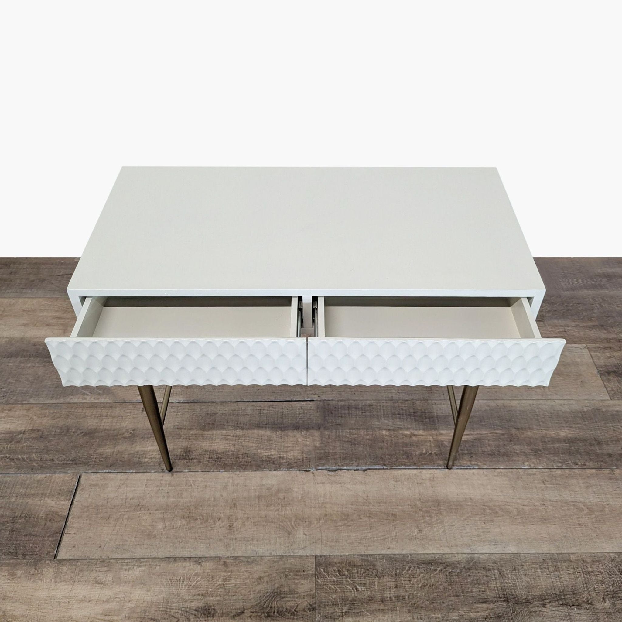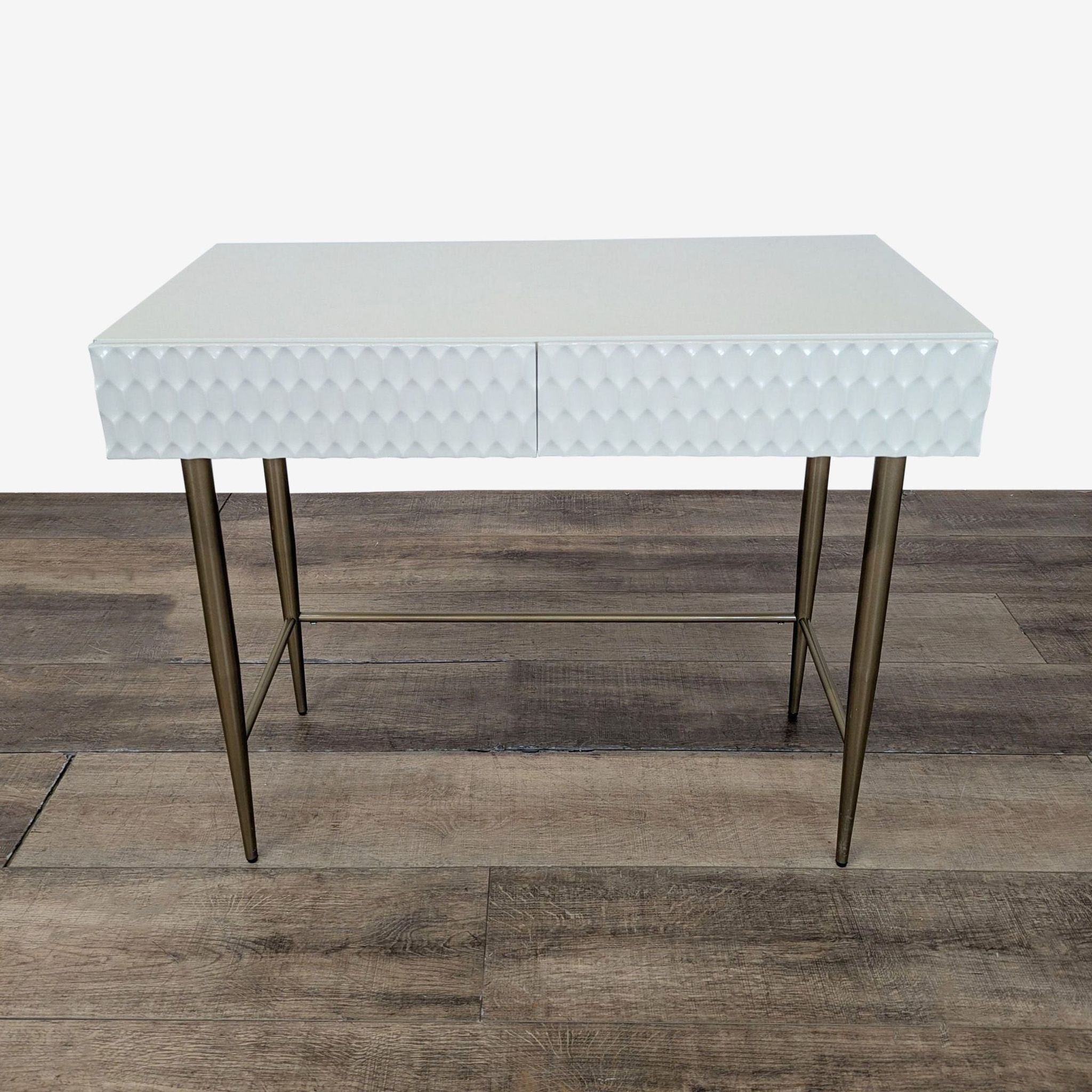 Features geo-textured drawer fronts and metal legs with an antique brass finish.