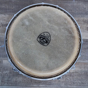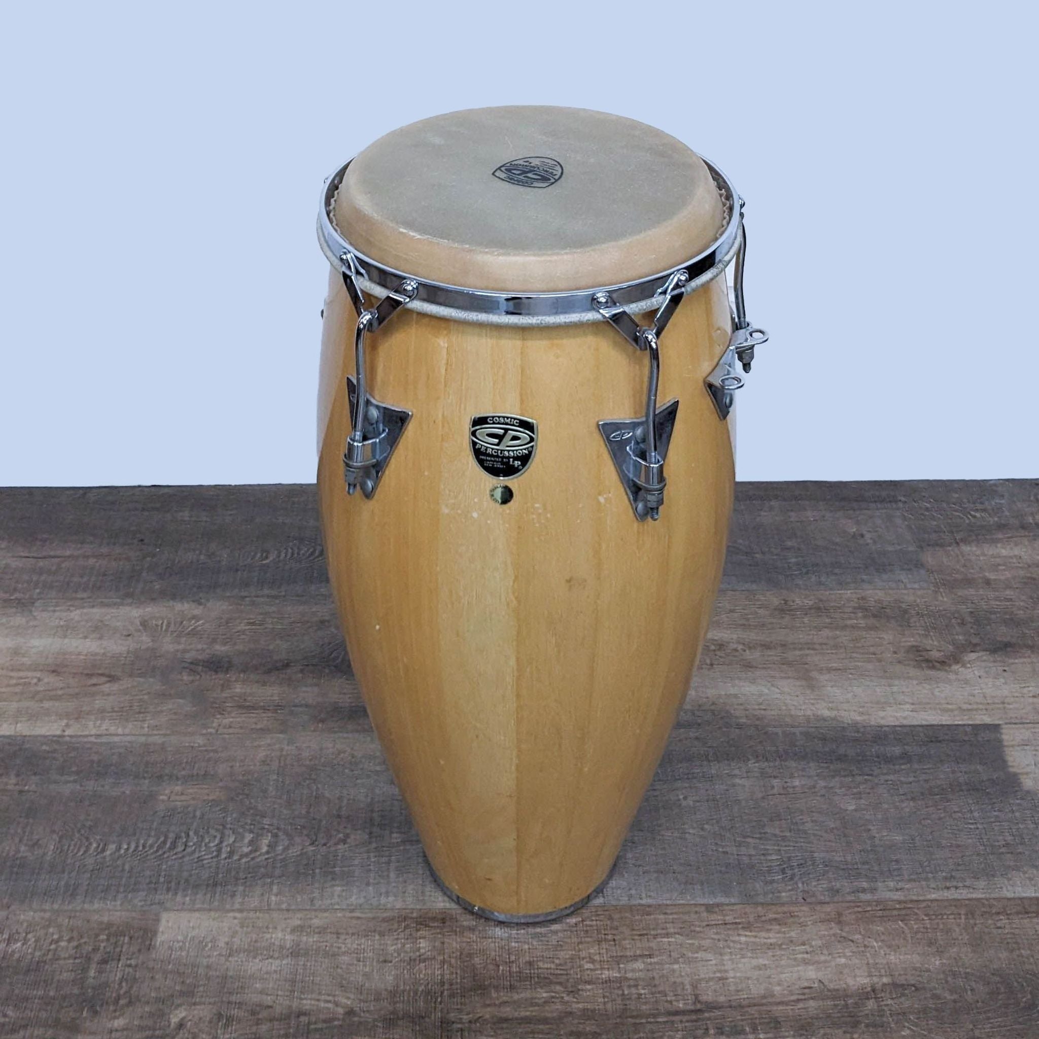 For sale is a beautifully matched pair of wooden conga drums, perfect for both aspiring and seasoned percussionists. Each conga features quality natural skin drumheads and sleek chrome tuning hardware for precise sound adjustment. The shell's warm wooden finish not only provides a classic aesthetic but also enhances the resonance and richness of tone. The green stickers signify an untouched set ready for new rhythms. Whether on stage or in a studio, these congas are sure to be a dependable addition to your musical ensemble.