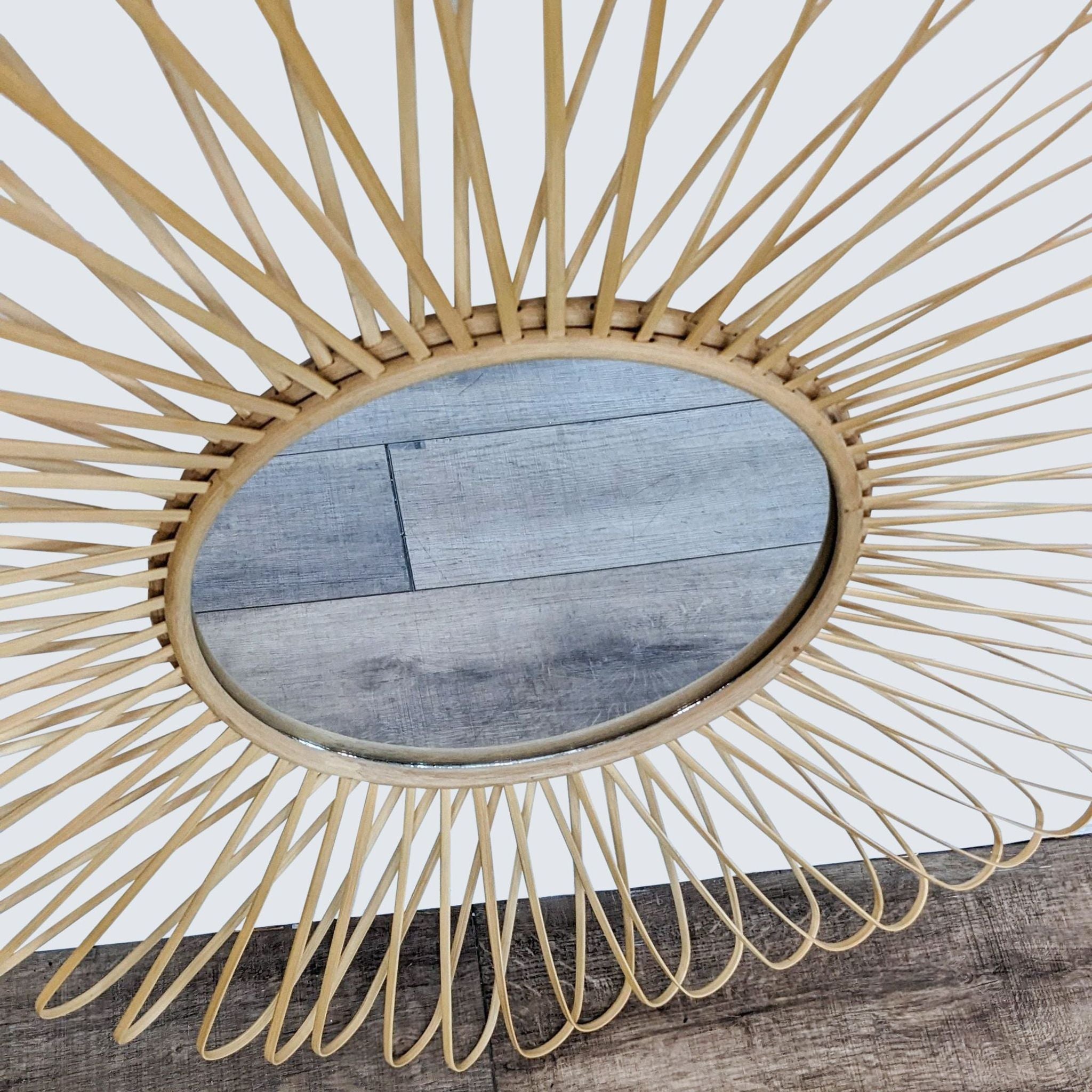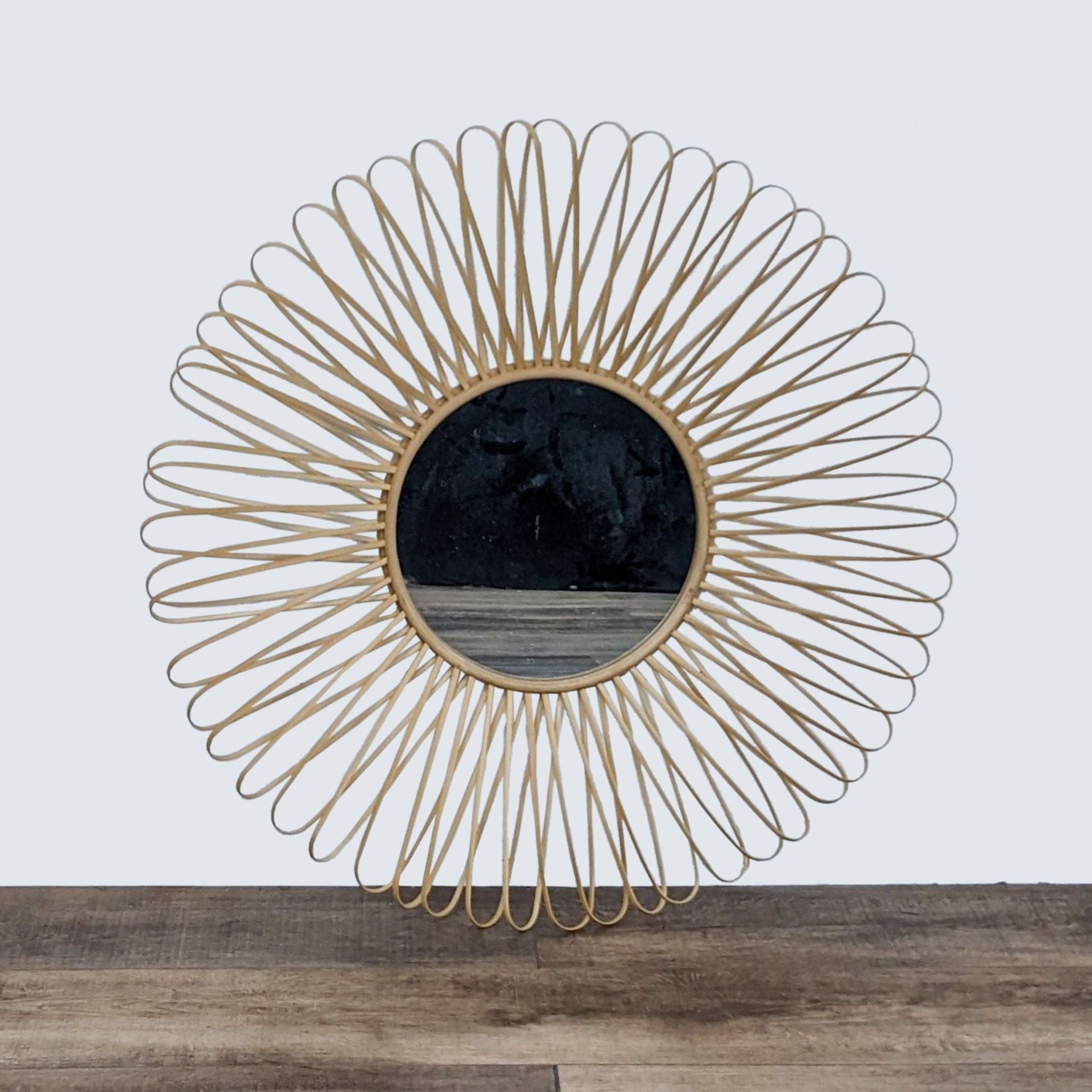 The Mick wall mirror by CB2 features natural bands of rattan and bamboo that twist and loop around a 14" center mirror.