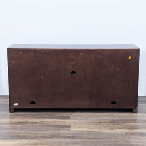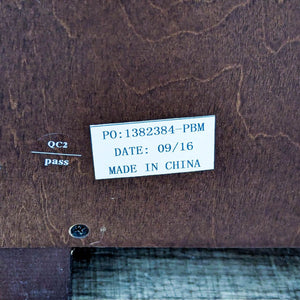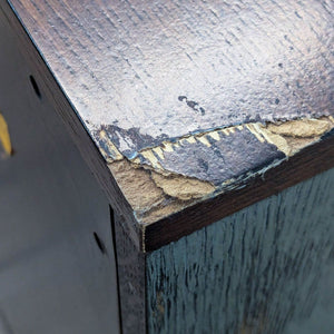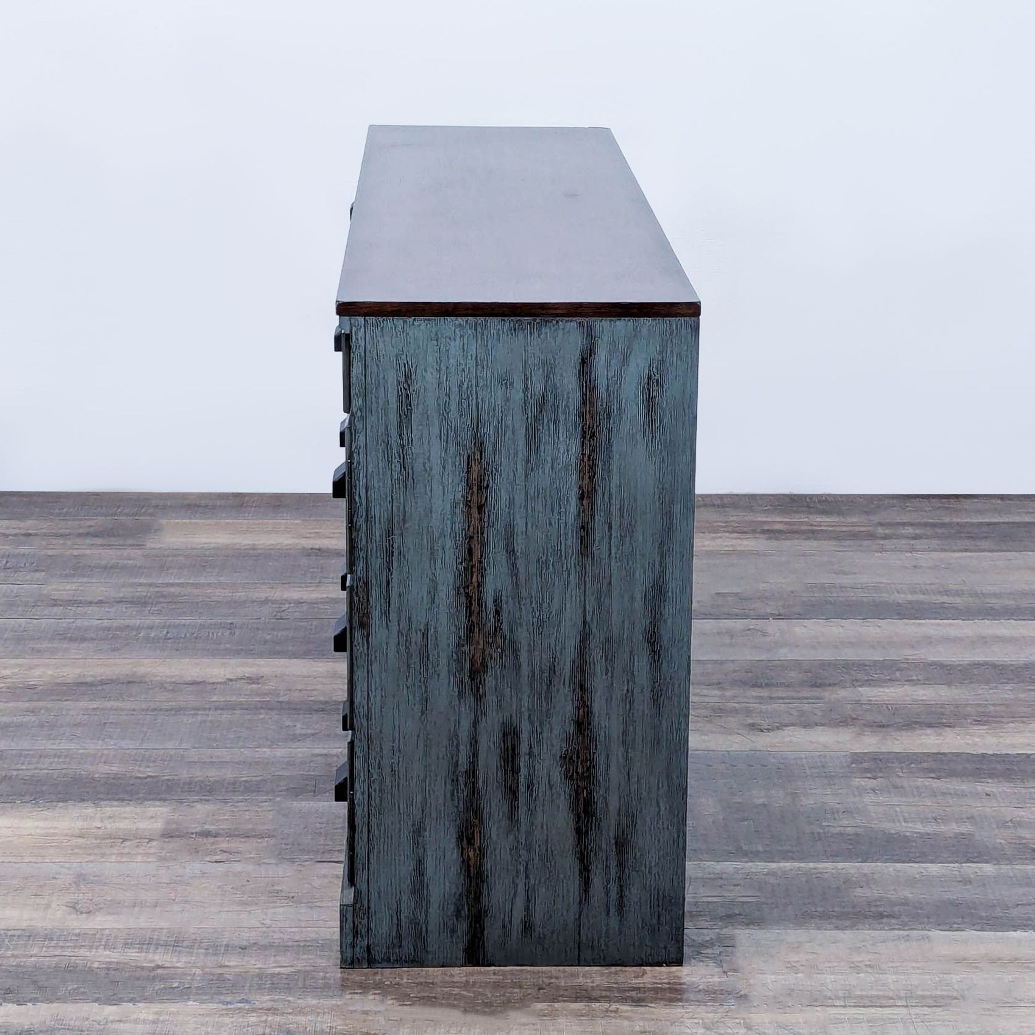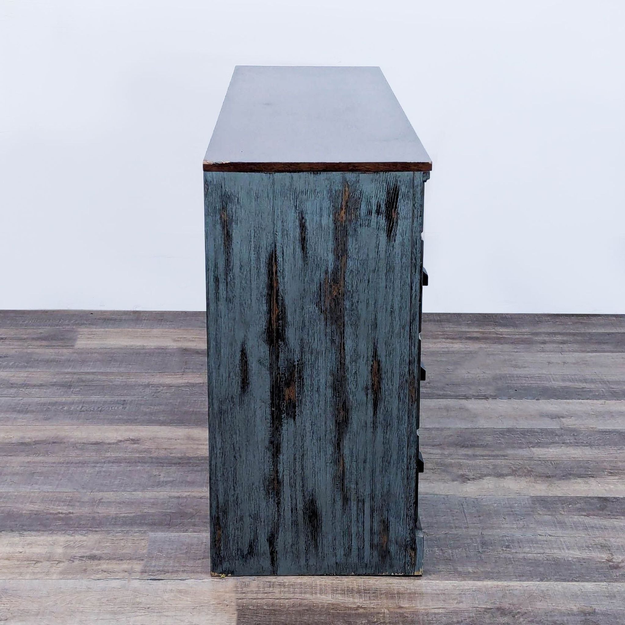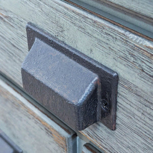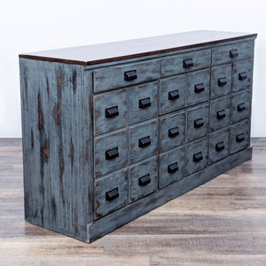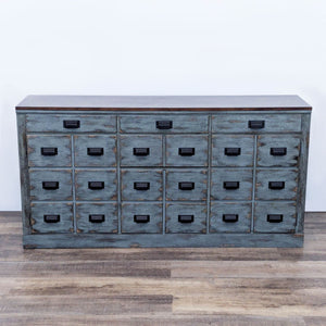 The console has a solid hardwood frame and is finished in a distressed deep sage green base with espresso-stained wood top and interior. The apothecary-style façade has three fully functional top drawers. It has a center drop-down cabinet with black metal hinges and a side-mounted stay. There is a large lower drawer beneath the drop-down that opens independently. There are two large side cabinets behind faux drawer fronts with fixed interior shelves and circular cable cutouts in each compartment for wire management. Black metal hardware is featured throughout the piece.