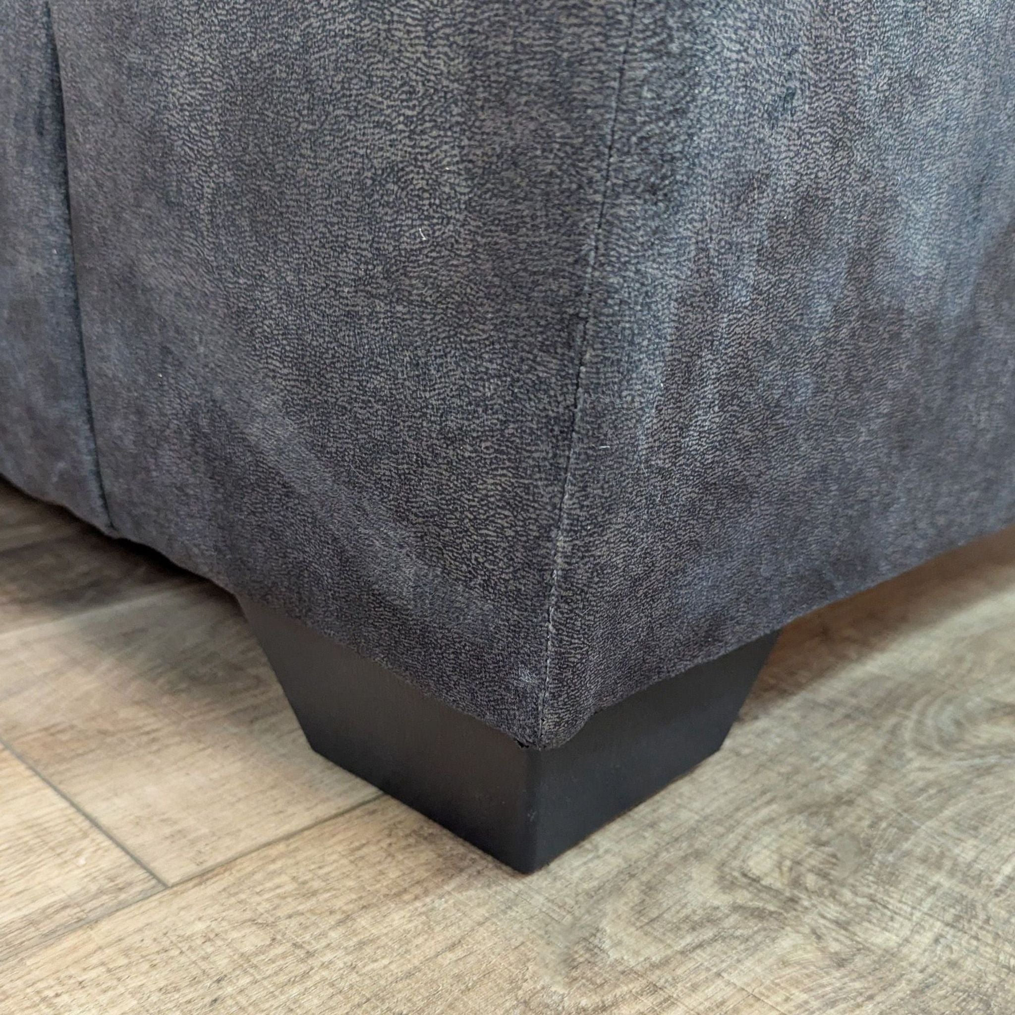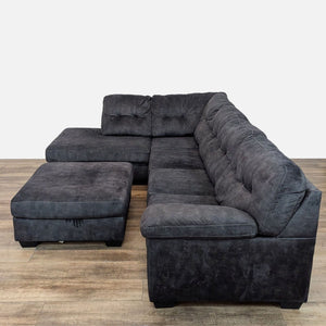 Features tufted box cushioning and thick pillow top armrests with chaise and matching oversized ottoman.