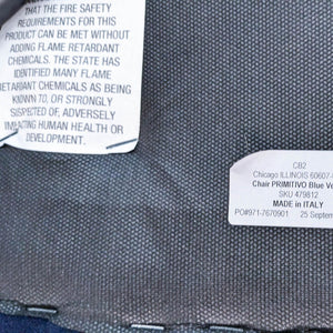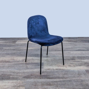 The Italian made Primativo side chair by CB2 features a black steel frame with a clean silhouette topped by a cushy ergonomic seat upholstered in navy blue velvet.
