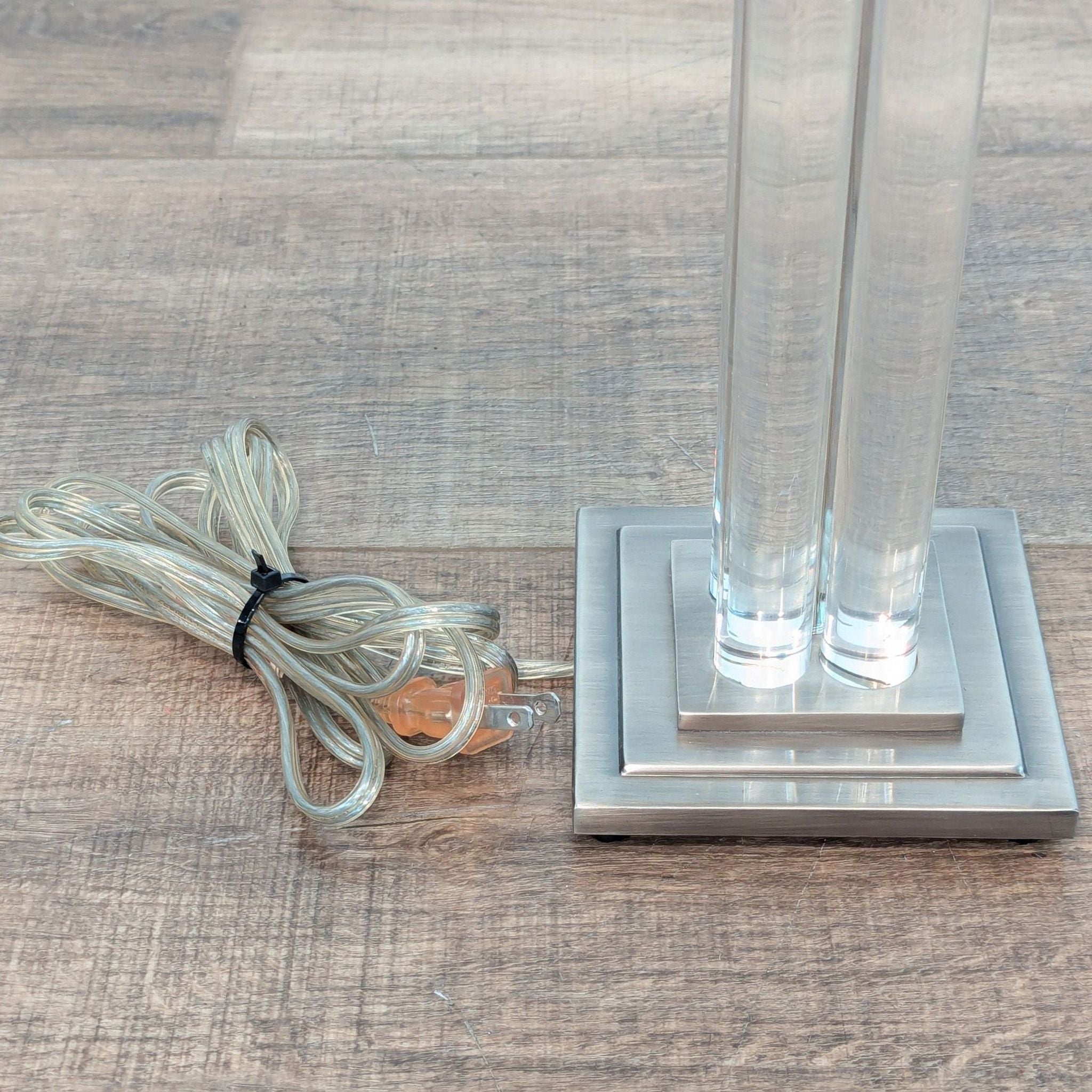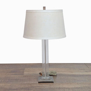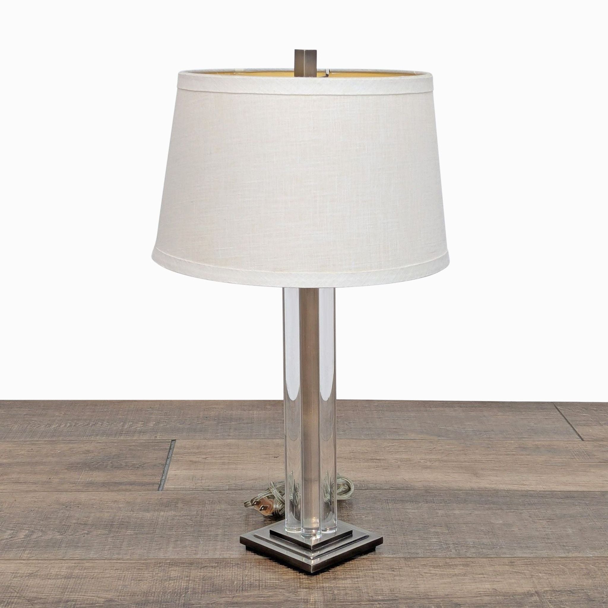 Featured four acrylic columns on a chrome base topped with a linen drum shade.