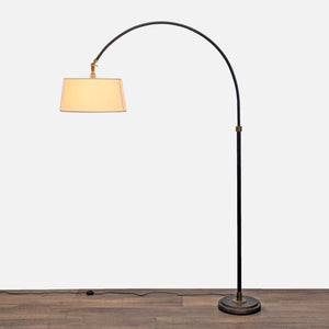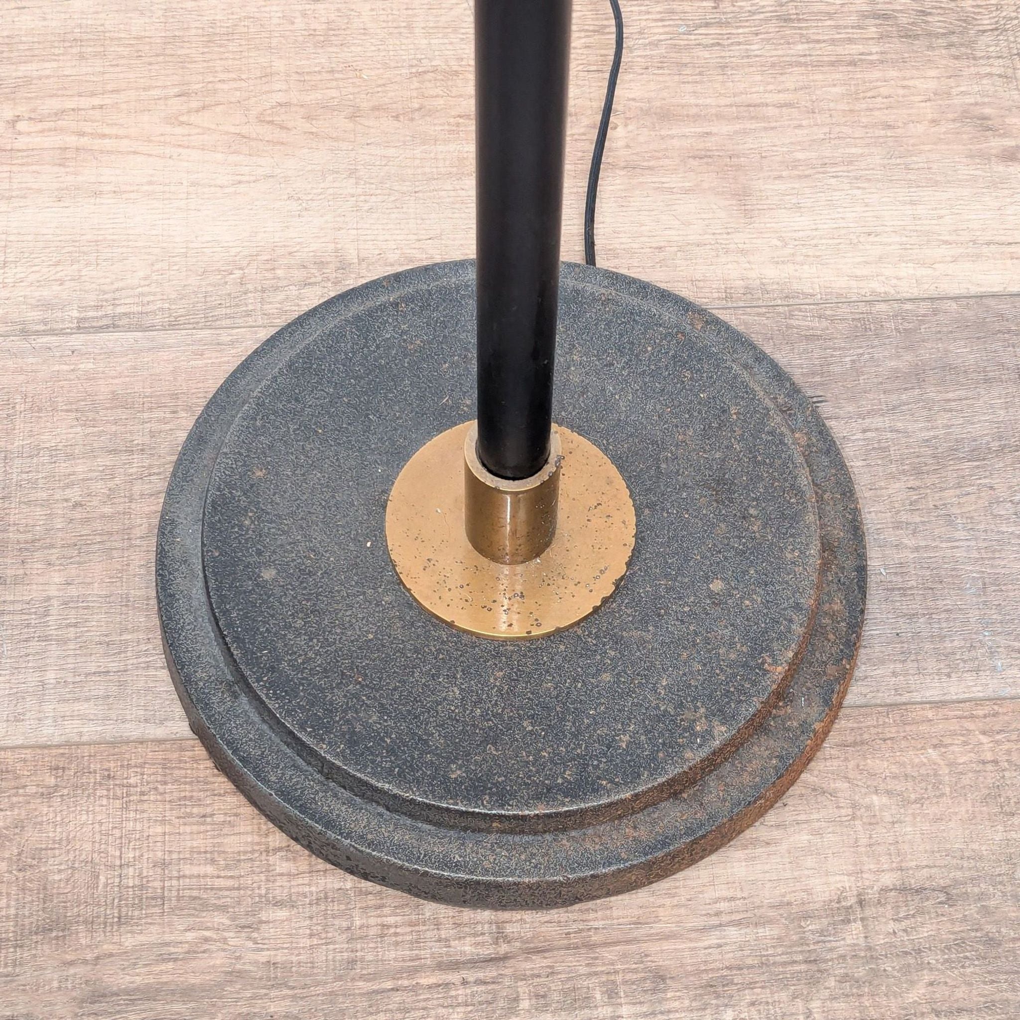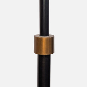 Crafted from hand-finished aged steel with antiqued brass accents. Features a pivoting head and a diffuser on the shade to filter light. The base is weighted for stability.