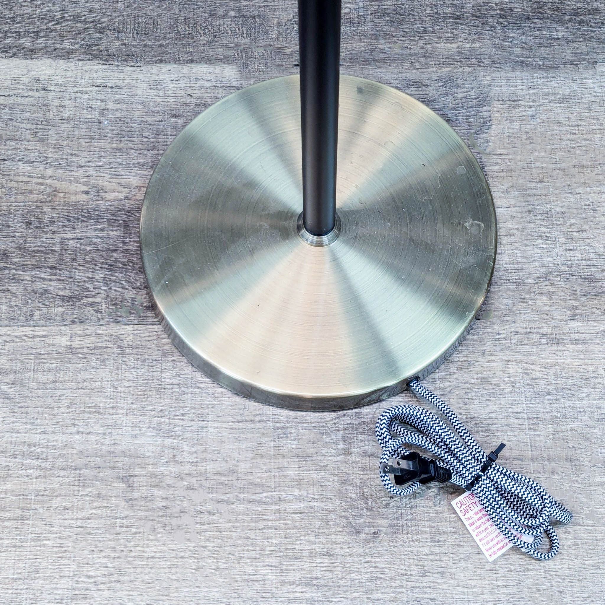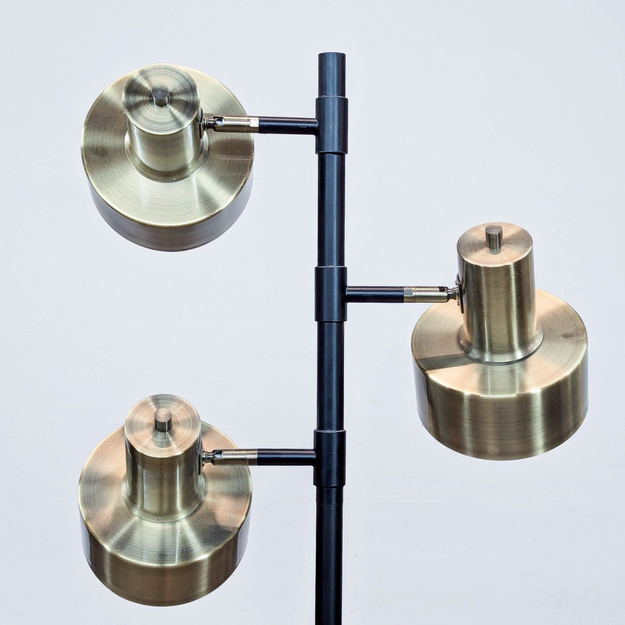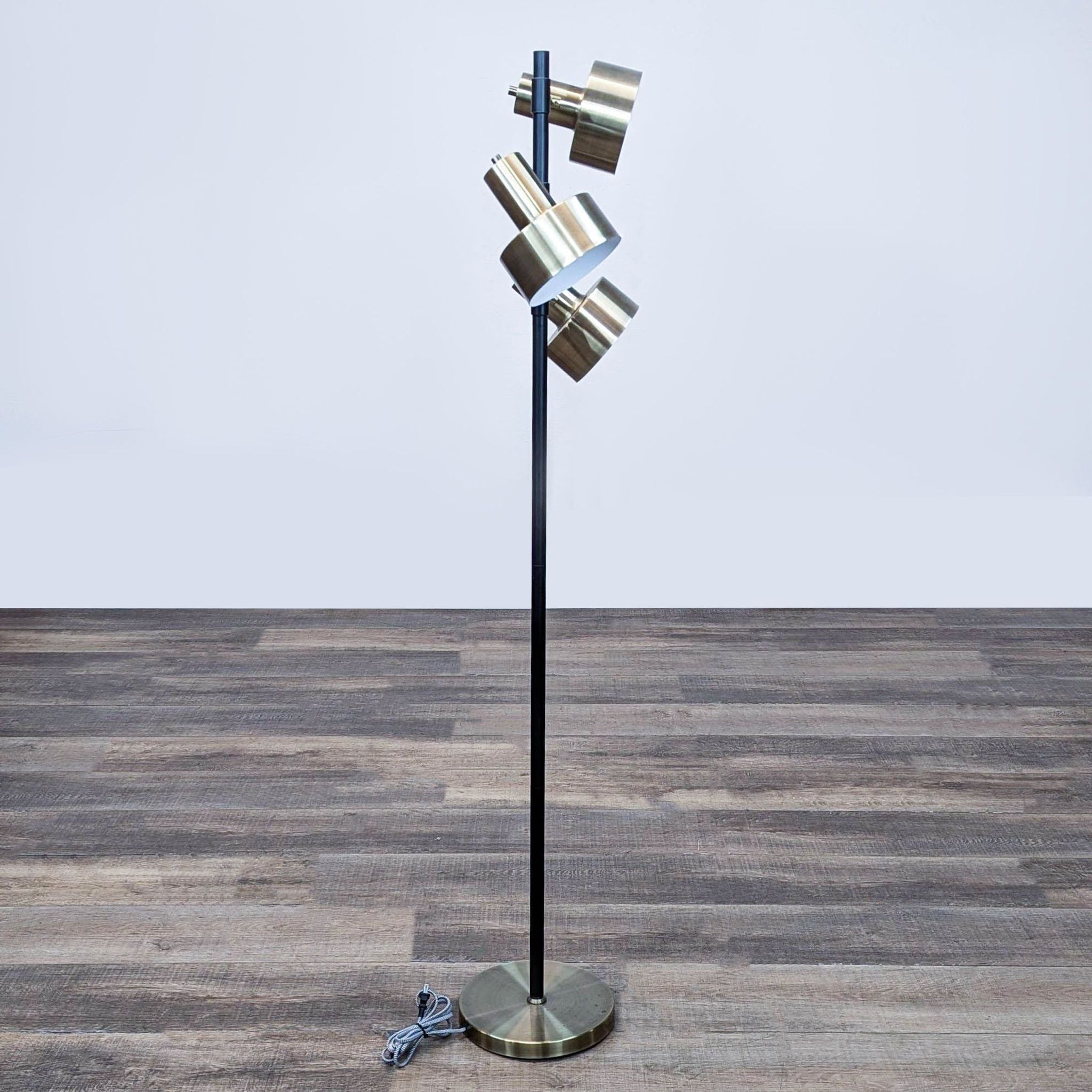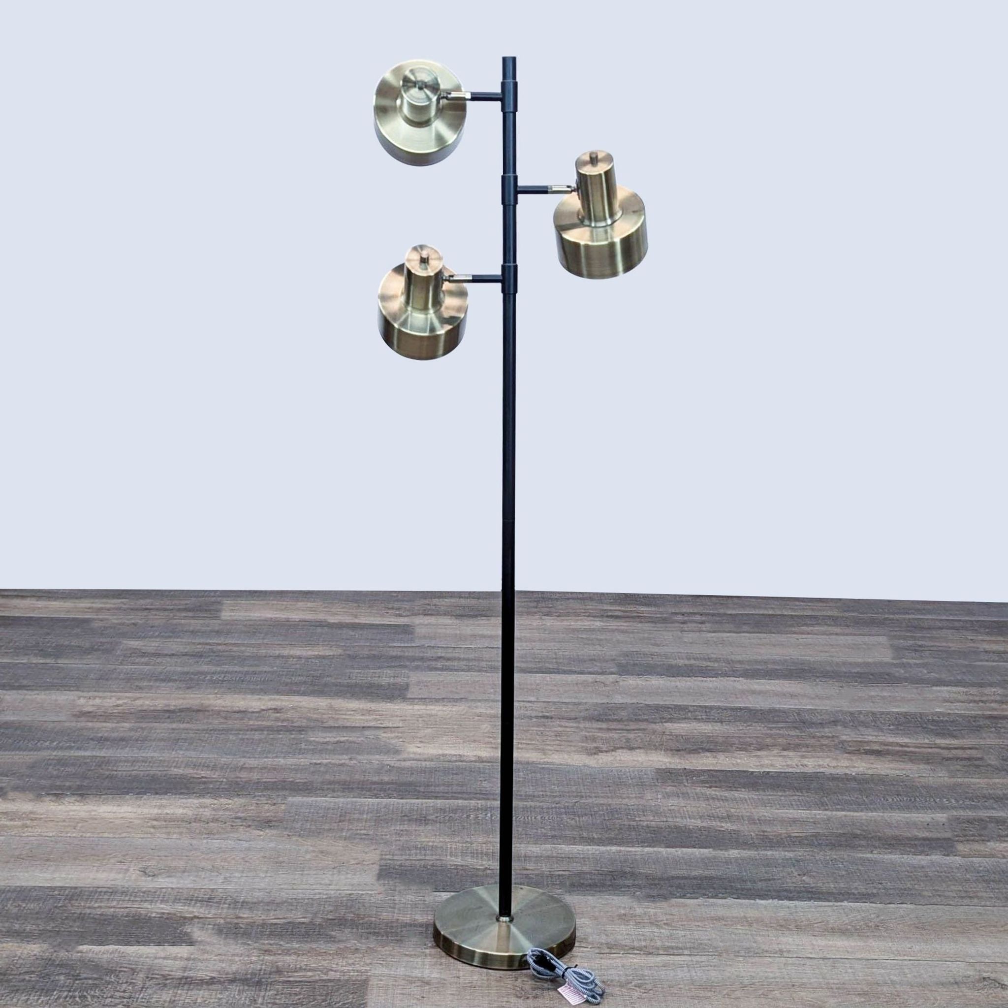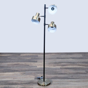 Pottery Barn floor lamp featuring a sleek black pole and brushed brass adjustable heads.