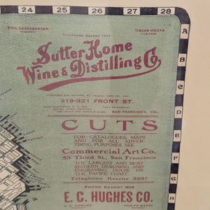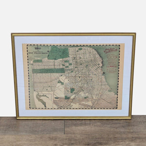 This is a framed vintage map of the City and County of San Francisco by H.A. Candrian. Reproduction of 1909 San Francisco map that shows streets, parks, military installations, and other landmarks. Parks and public areas are highlighted in green.