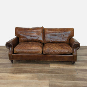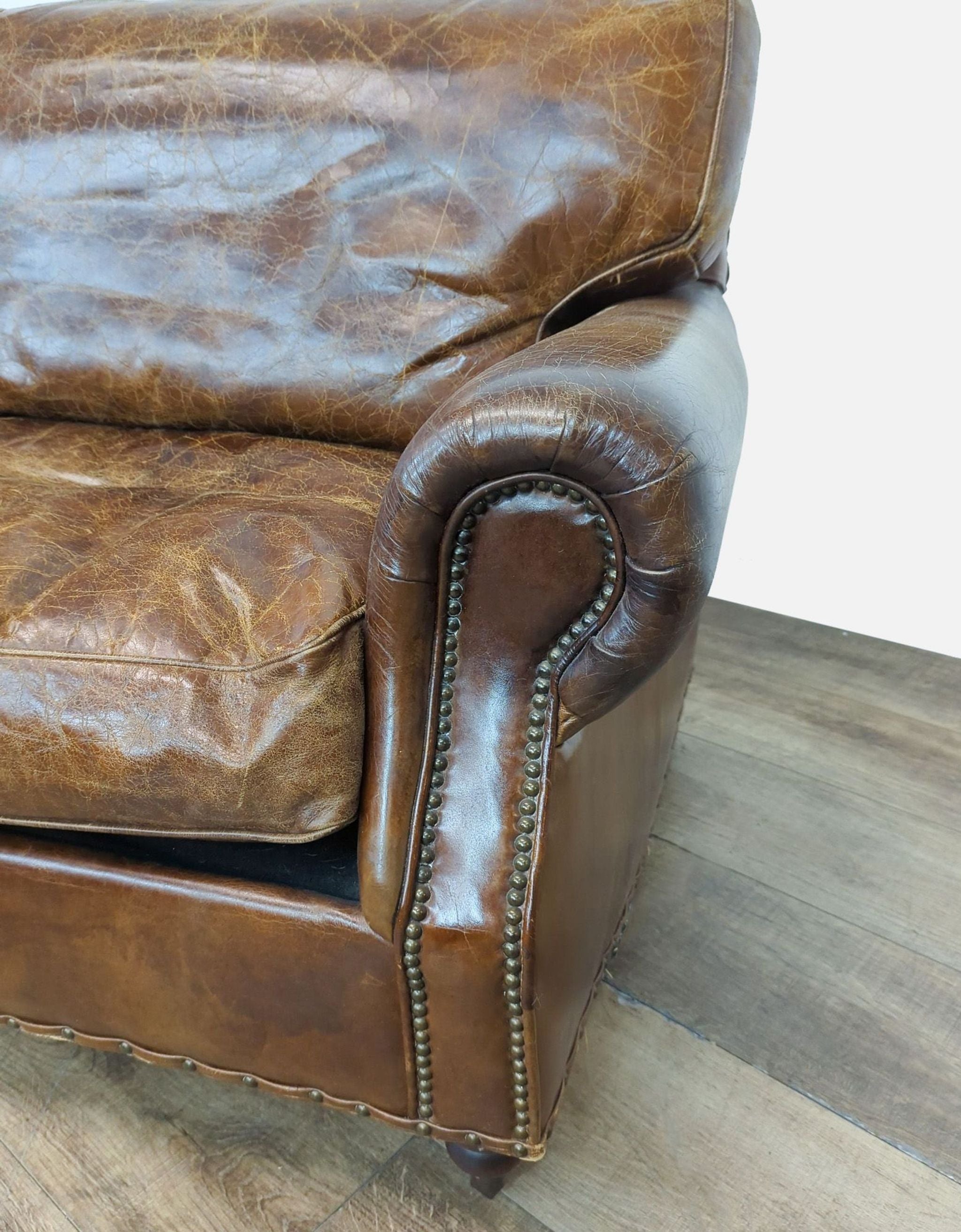 Distressed leather with nailhead trim, rolled arms and turned wood feet.