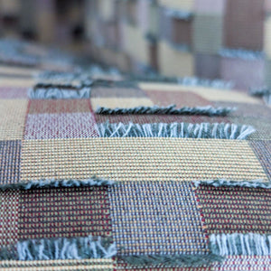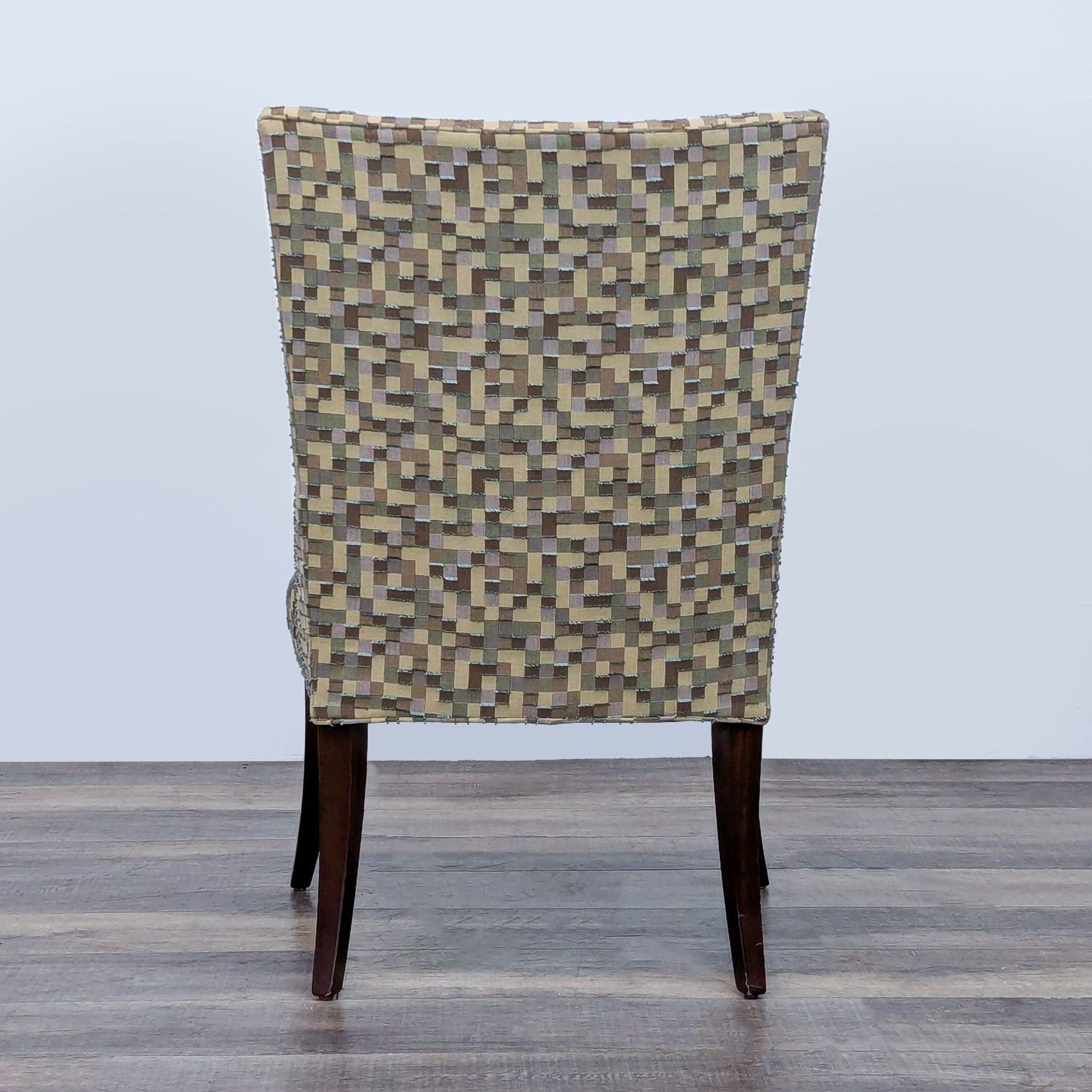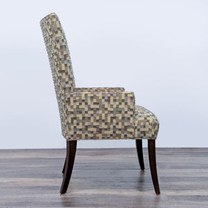 Dining or accent chair featuring a high back and armrests, covered in a multi-toned mosaic patterned fabric and dark wood legs.
