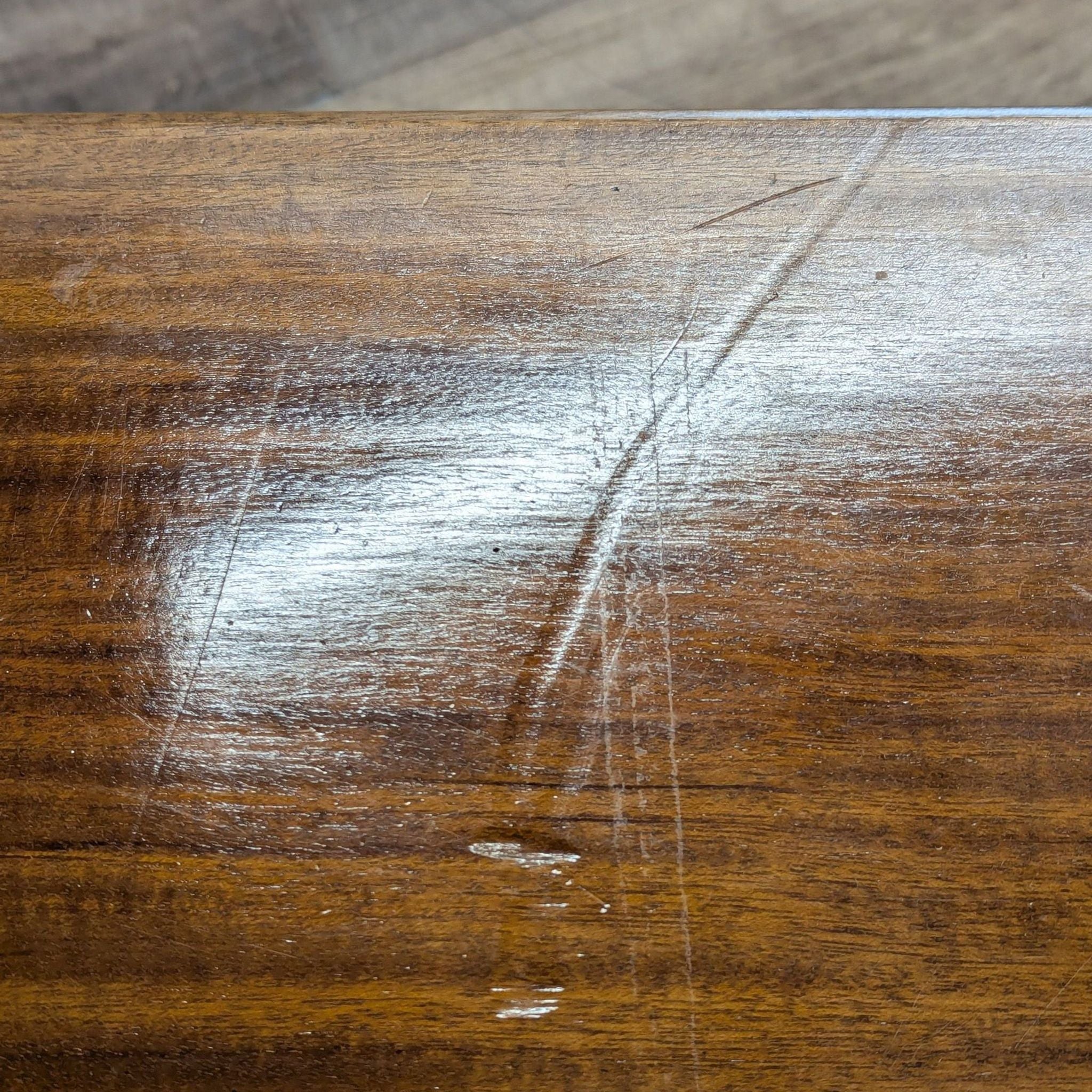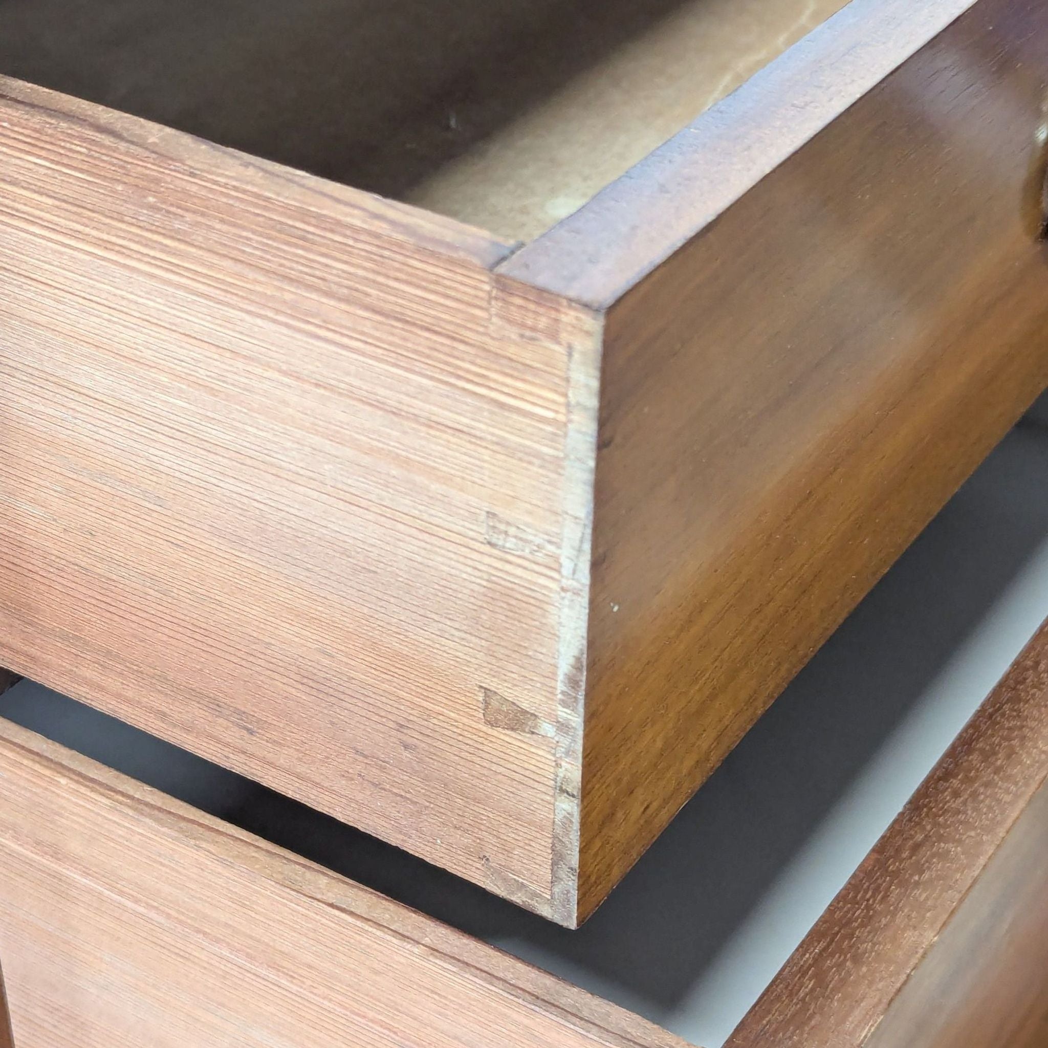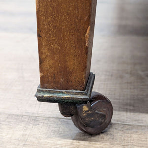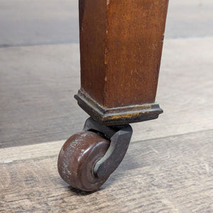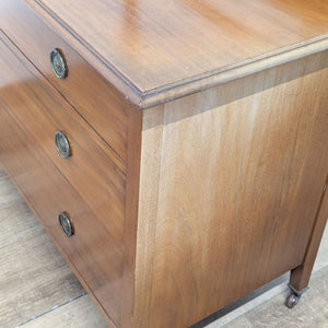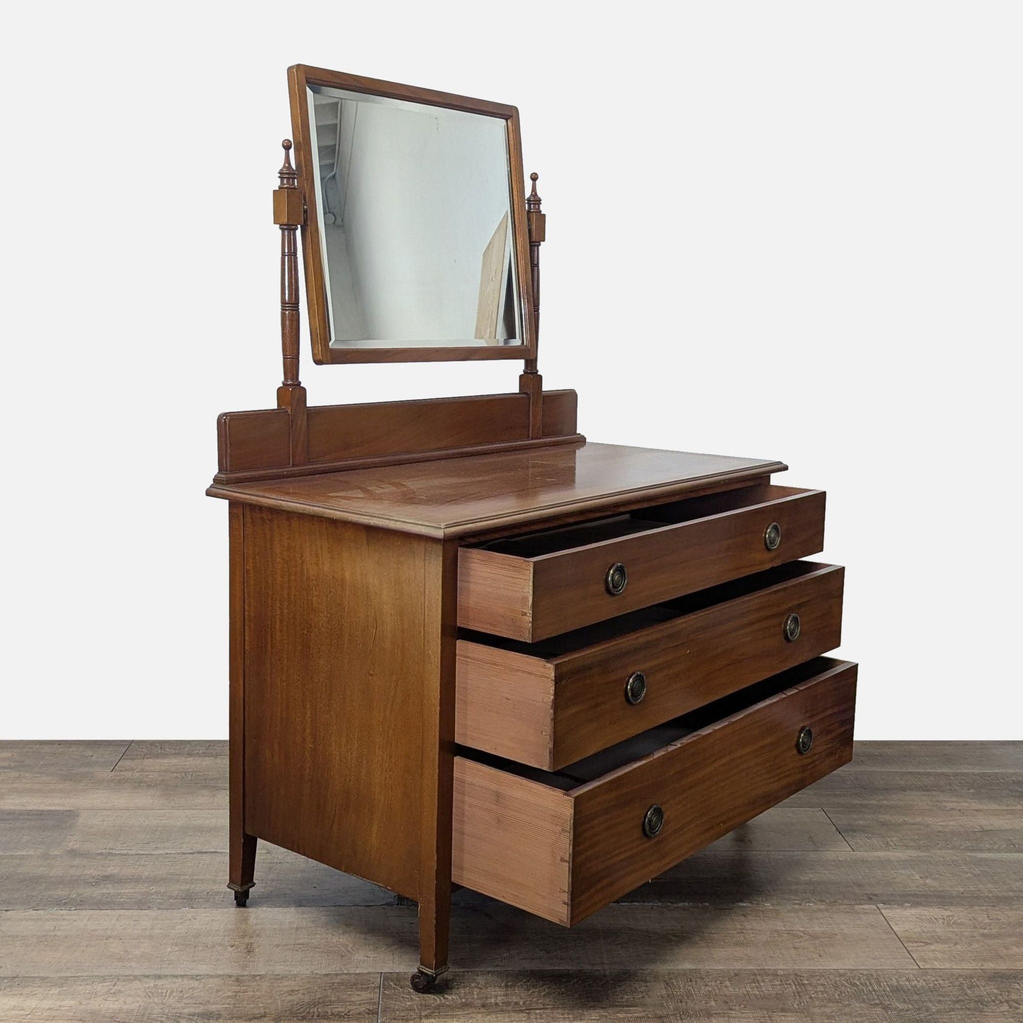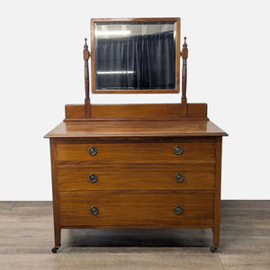 Features an adjustable swing mirror supported by two turned posts, three long drawers with dovetail joinery, brass ring pulls on the drawers, and small casters on the legs for mobility.