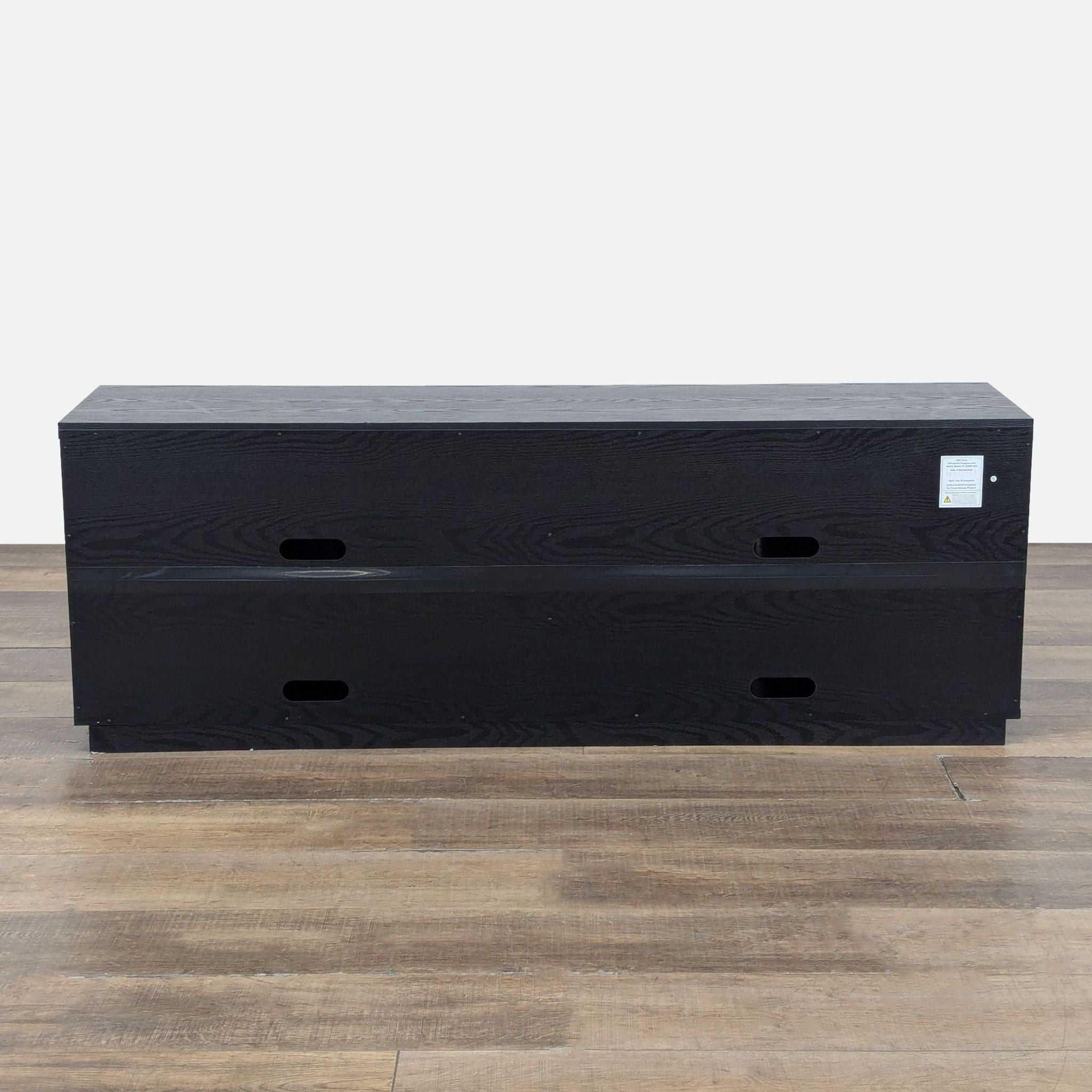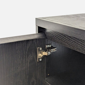 Modern contemporary design constructed of sturdy MDF materials in a handcrafted black grain finish. The cabinet features 4 beveled doors with enclosed cabinets and 4-shelves for storage.