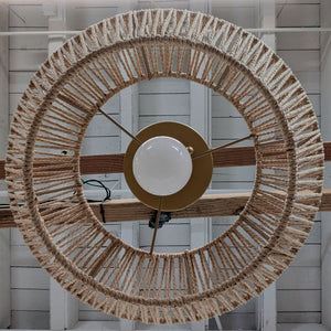 Semi-flush mount light with hemp rope woven shade and gold tone mount.