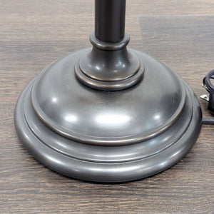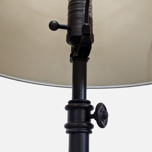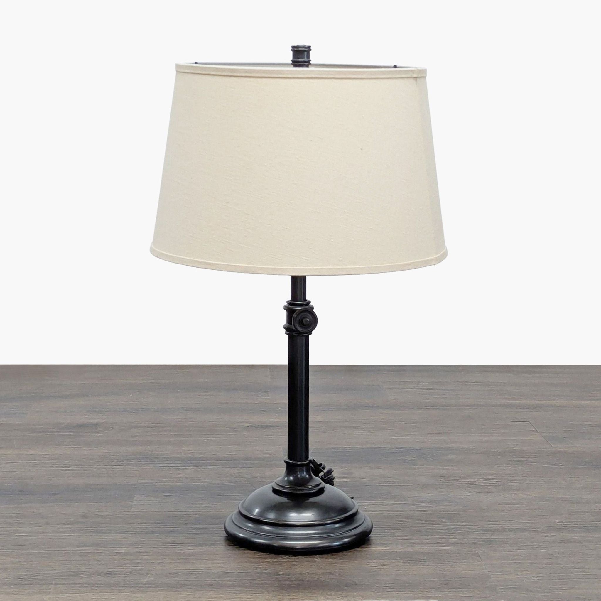 This classic table lamp features a sturdy metal base with a dark finish and an adjustable height mechanism for convenience. The beige fabric shade provides a warm, soft light that is perfect for reading or adding ambiance to any room. Ideal for desks, bedside tables, or living spaces.