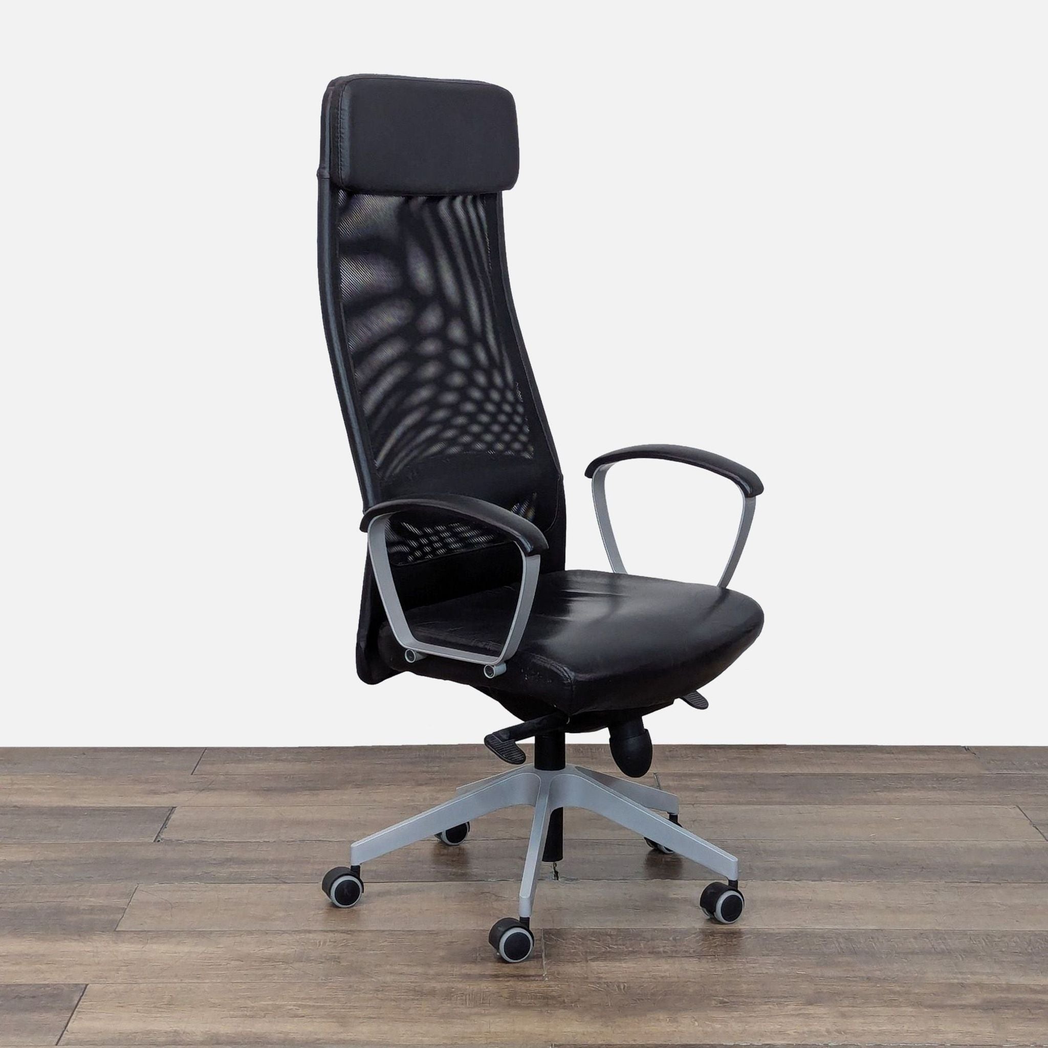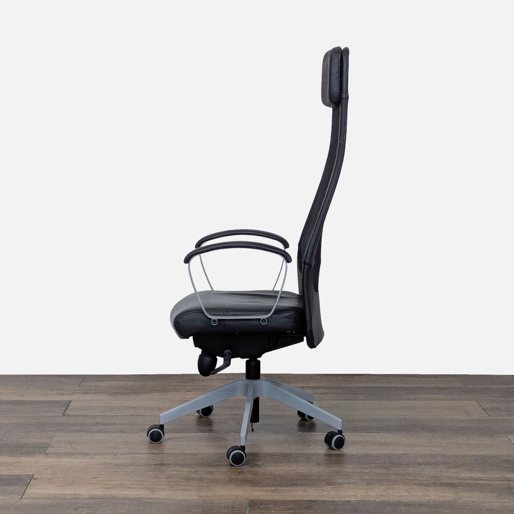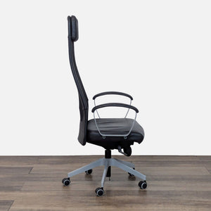 Ergonomic office chair with high back, caster wheels and padded armrests.
