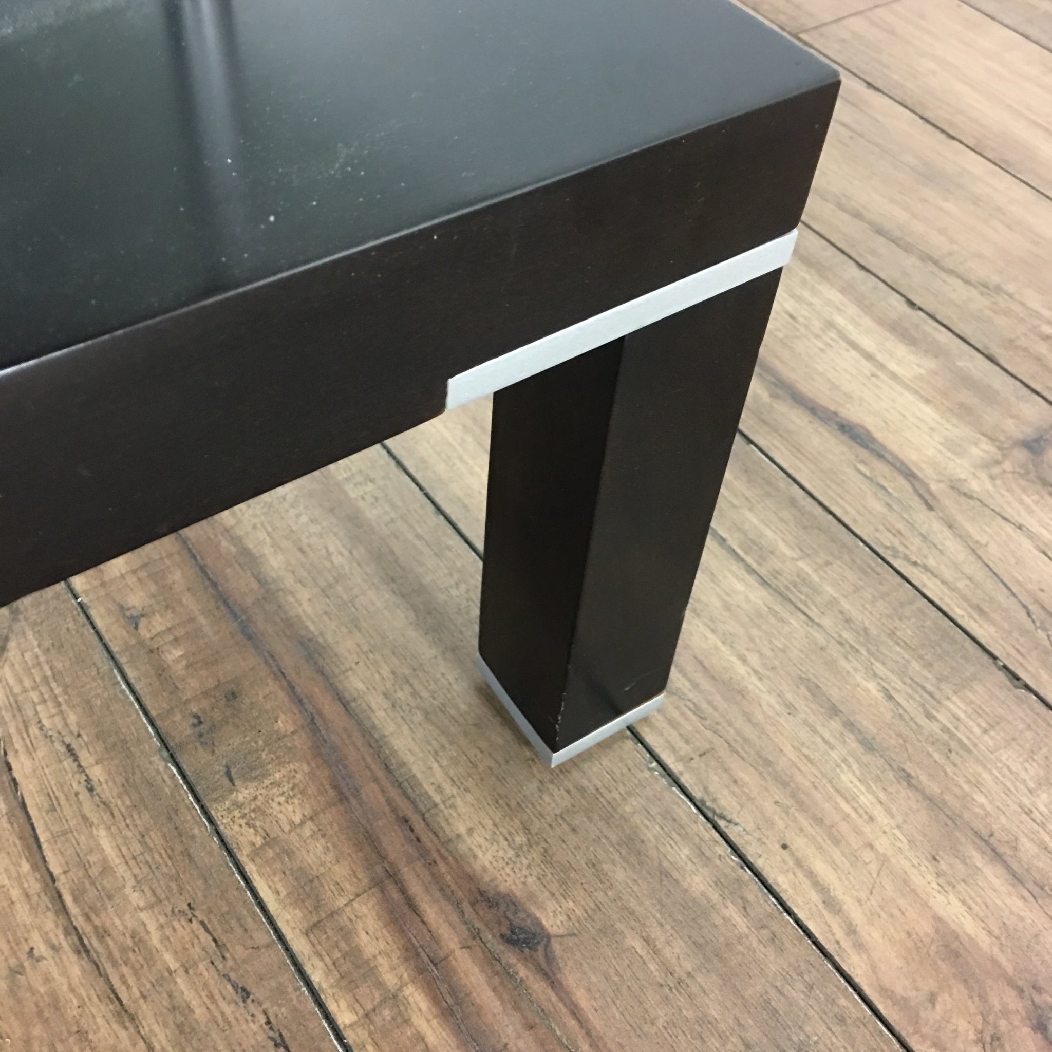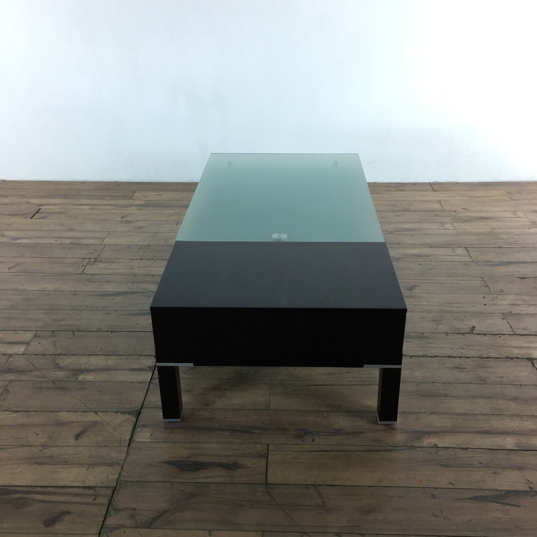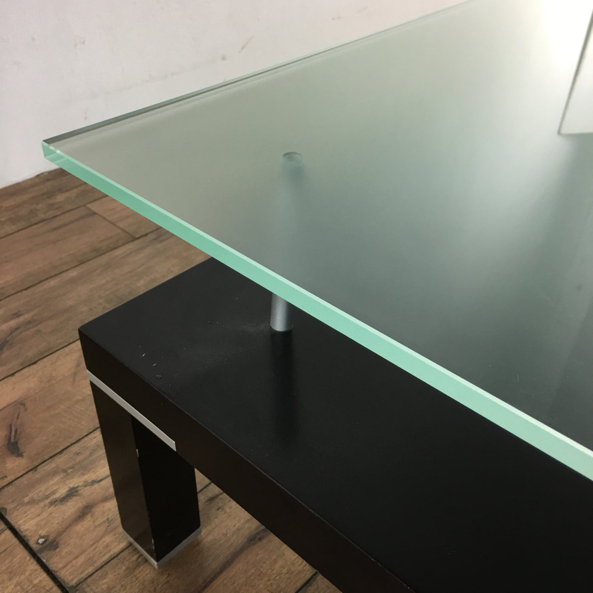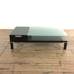 Contemporary table with 2 drawers, opaque glass, and chrome fittings