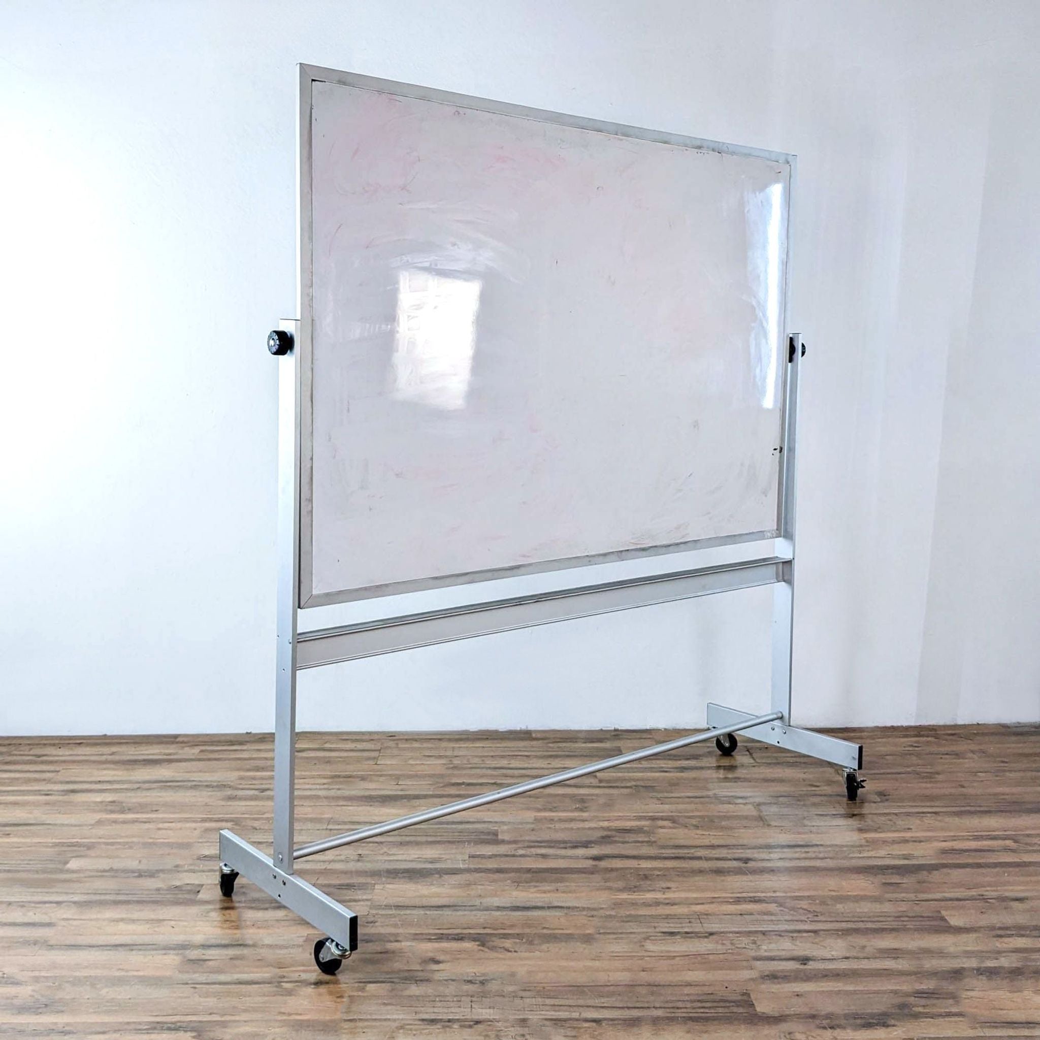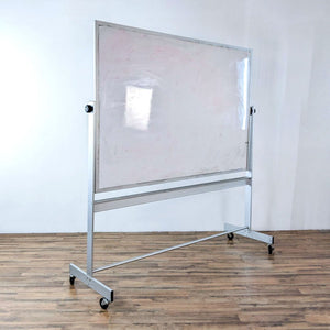 Pivoting portable dry erase board with tray to hold markers and eraser.