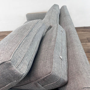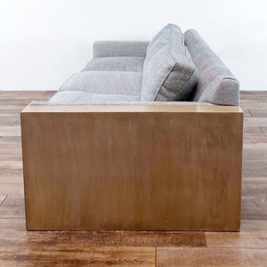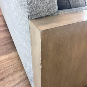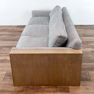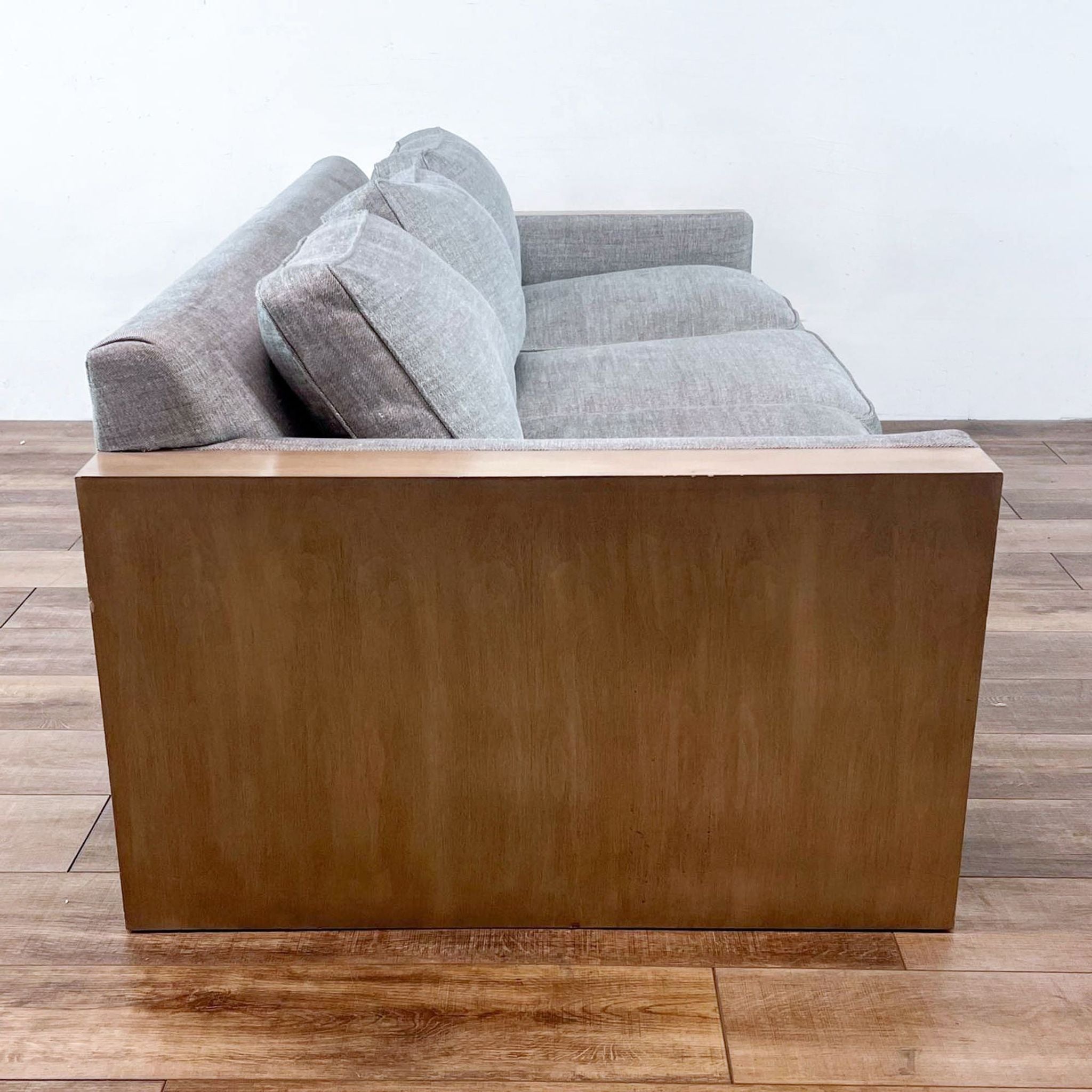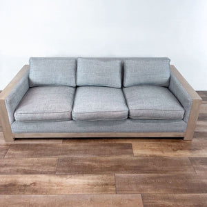 Gray Fabric Designer Sofa With Clean Lines And Wood Frame Detailing Around Arms And Sofa Front