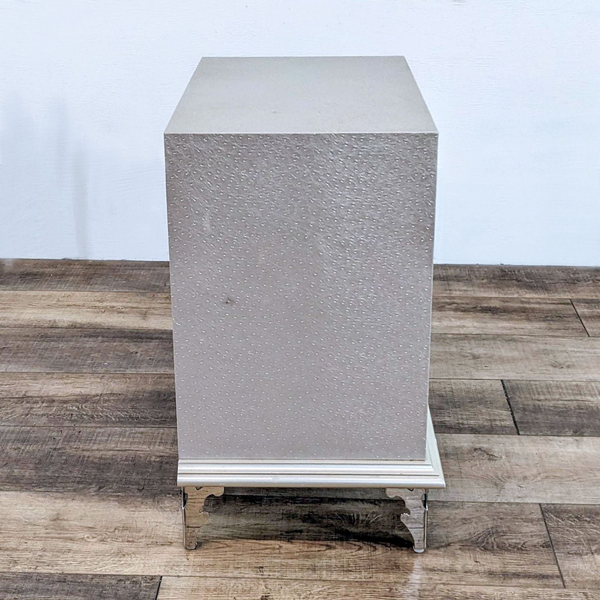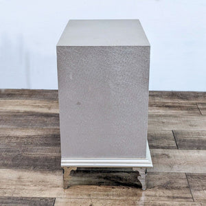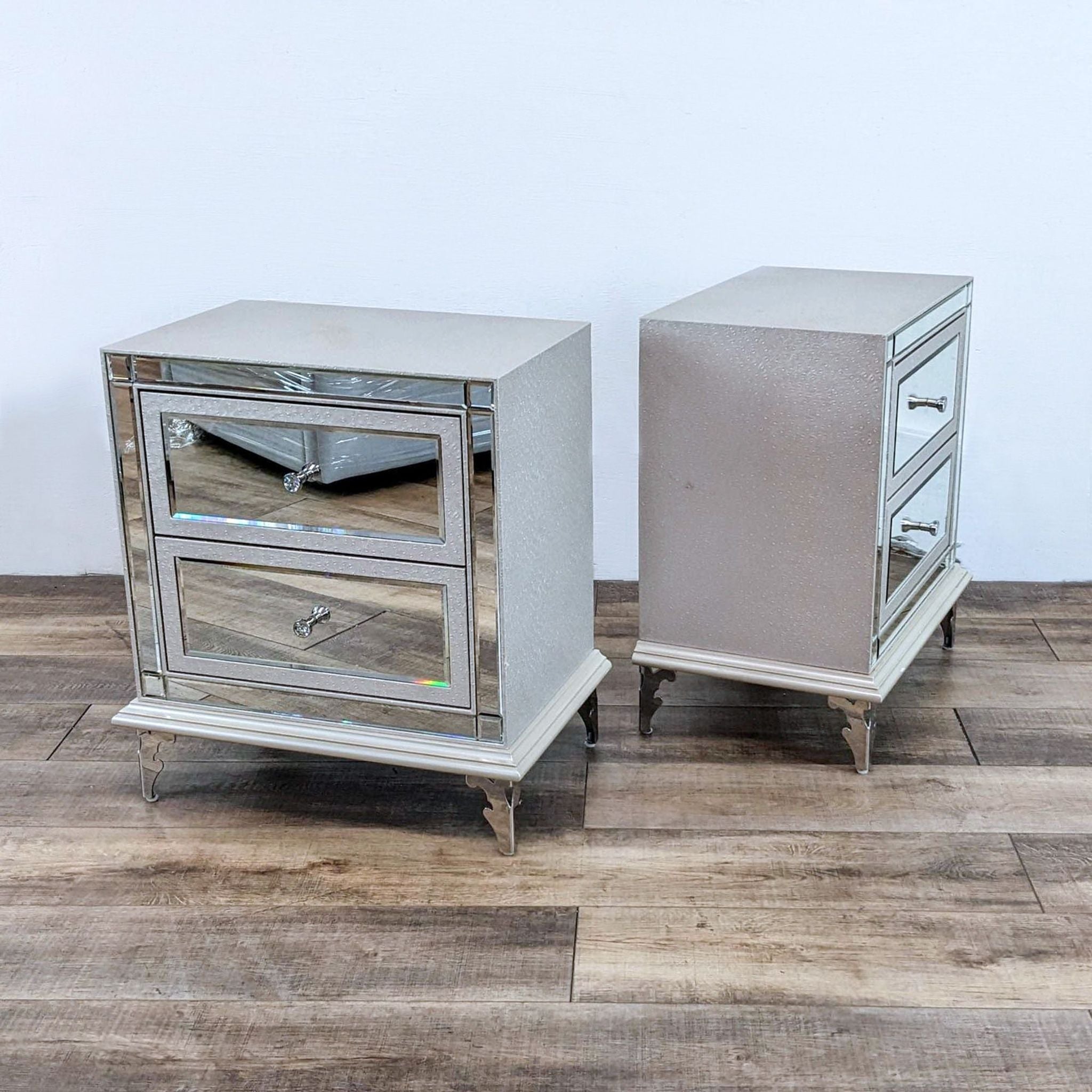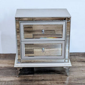 Nightstand features mirrored drawer fronts and chrome knobs with crystal inset. The piece is fully upholstered with high quality textured vinyl, and framed with beveled mirror glass.