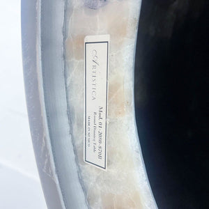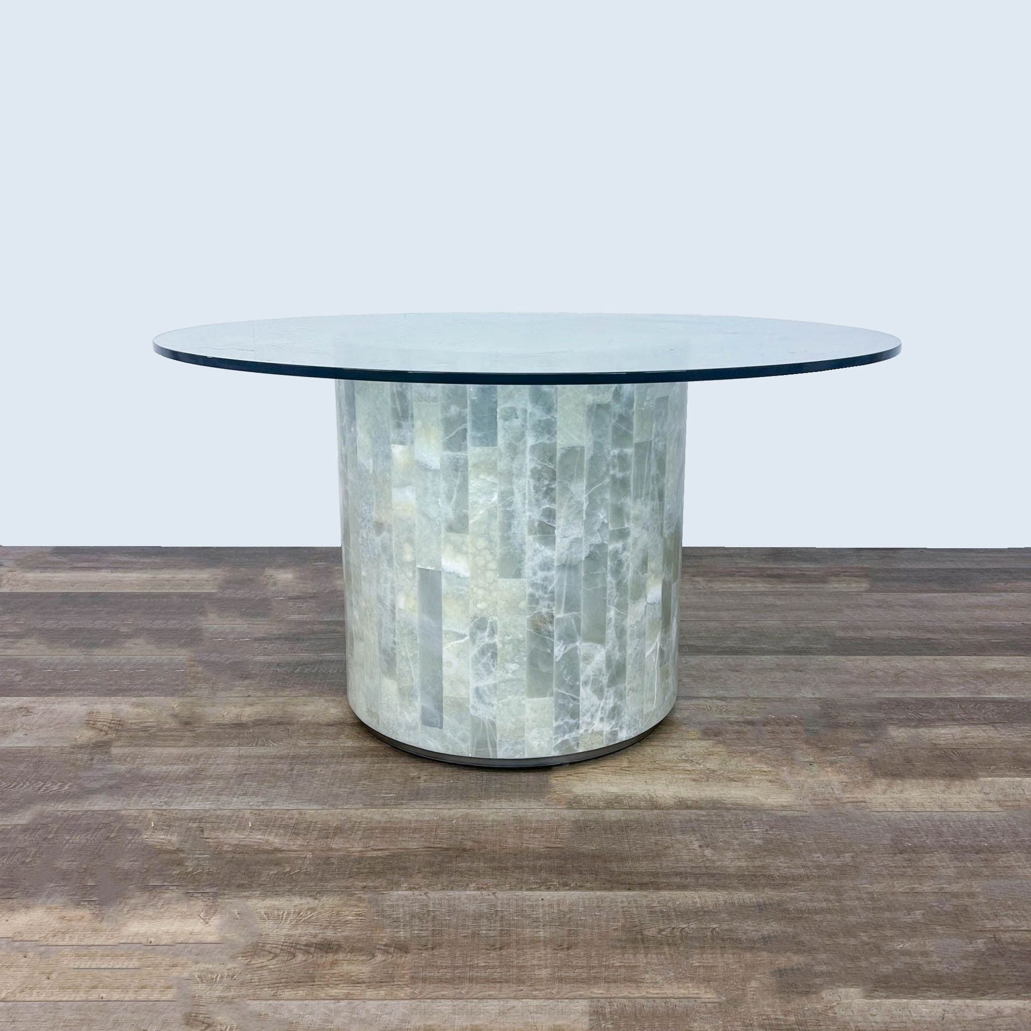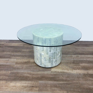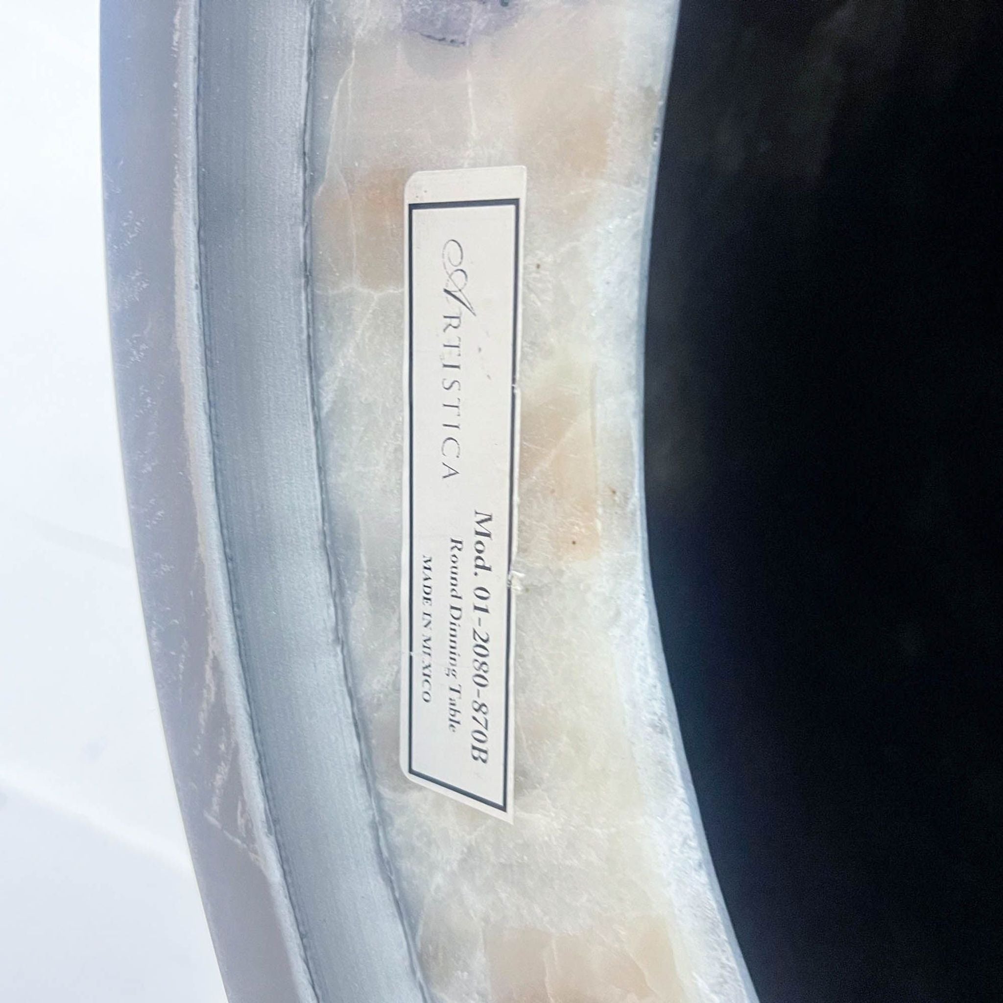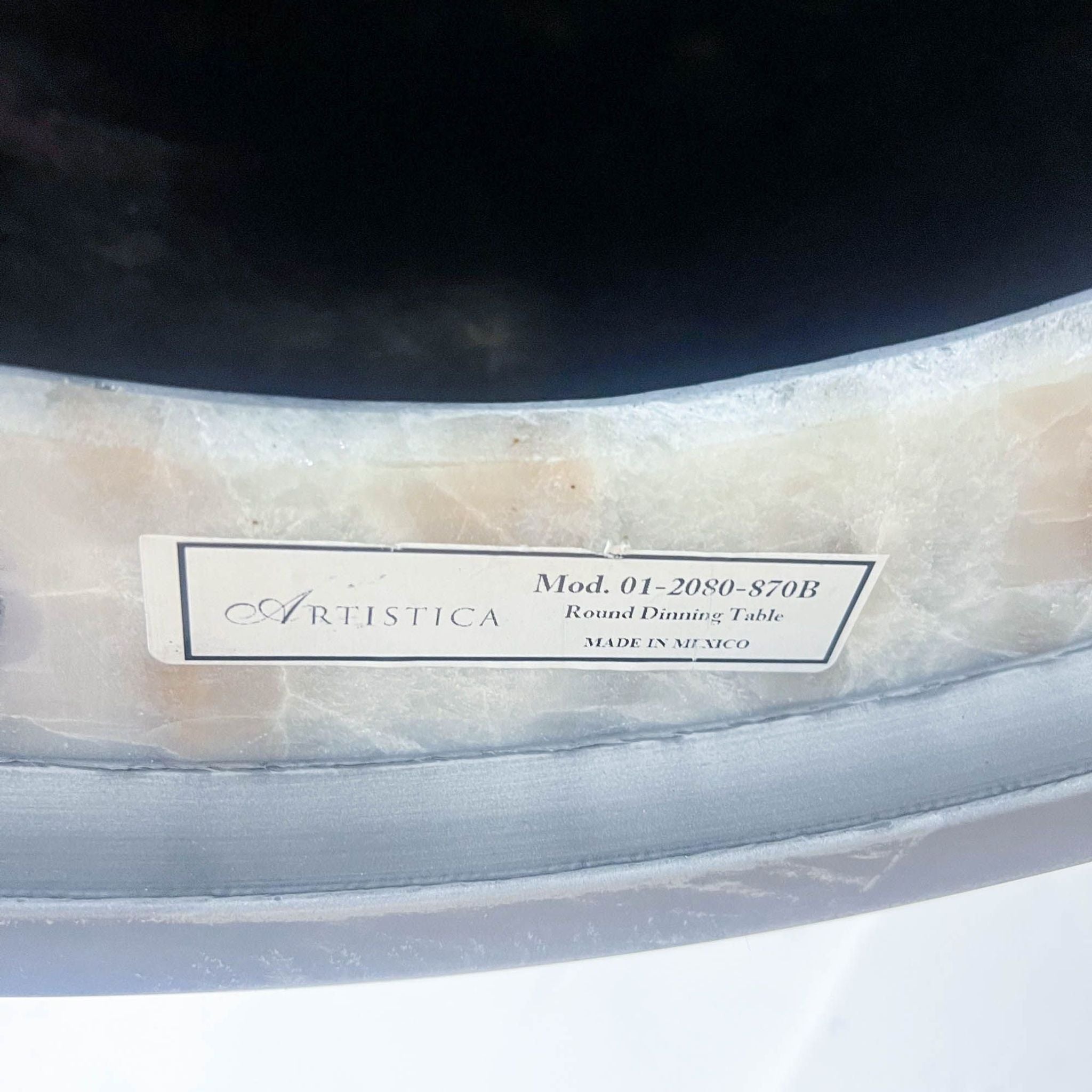 This 5-Piece Dining Set from Artistica features a travertine stone drum base with a thick tempered glass top and includes four high back upholstered chairs with wood legs.