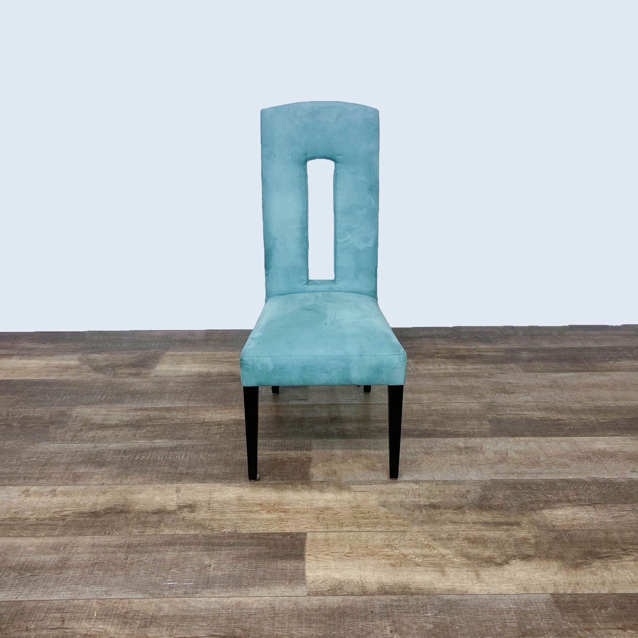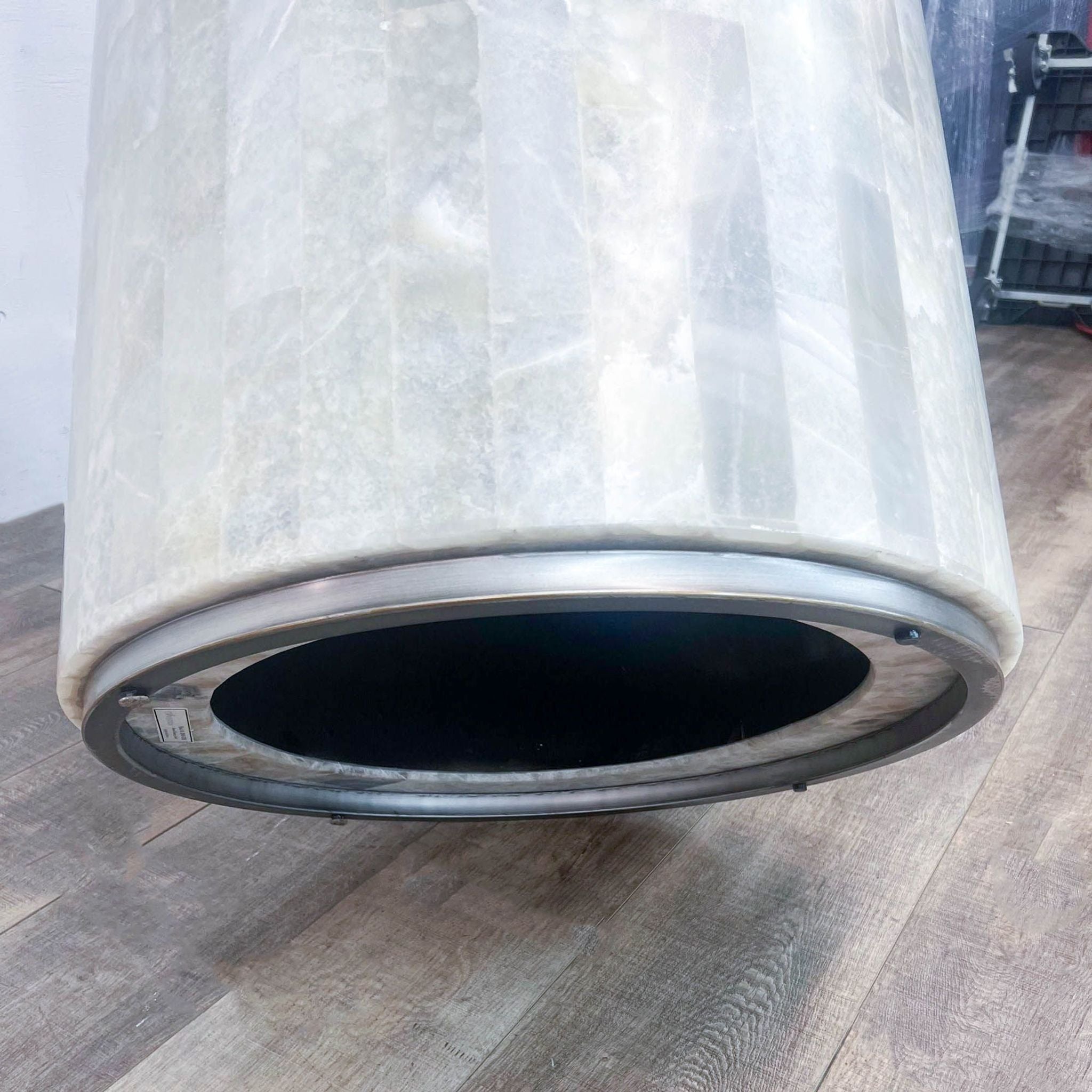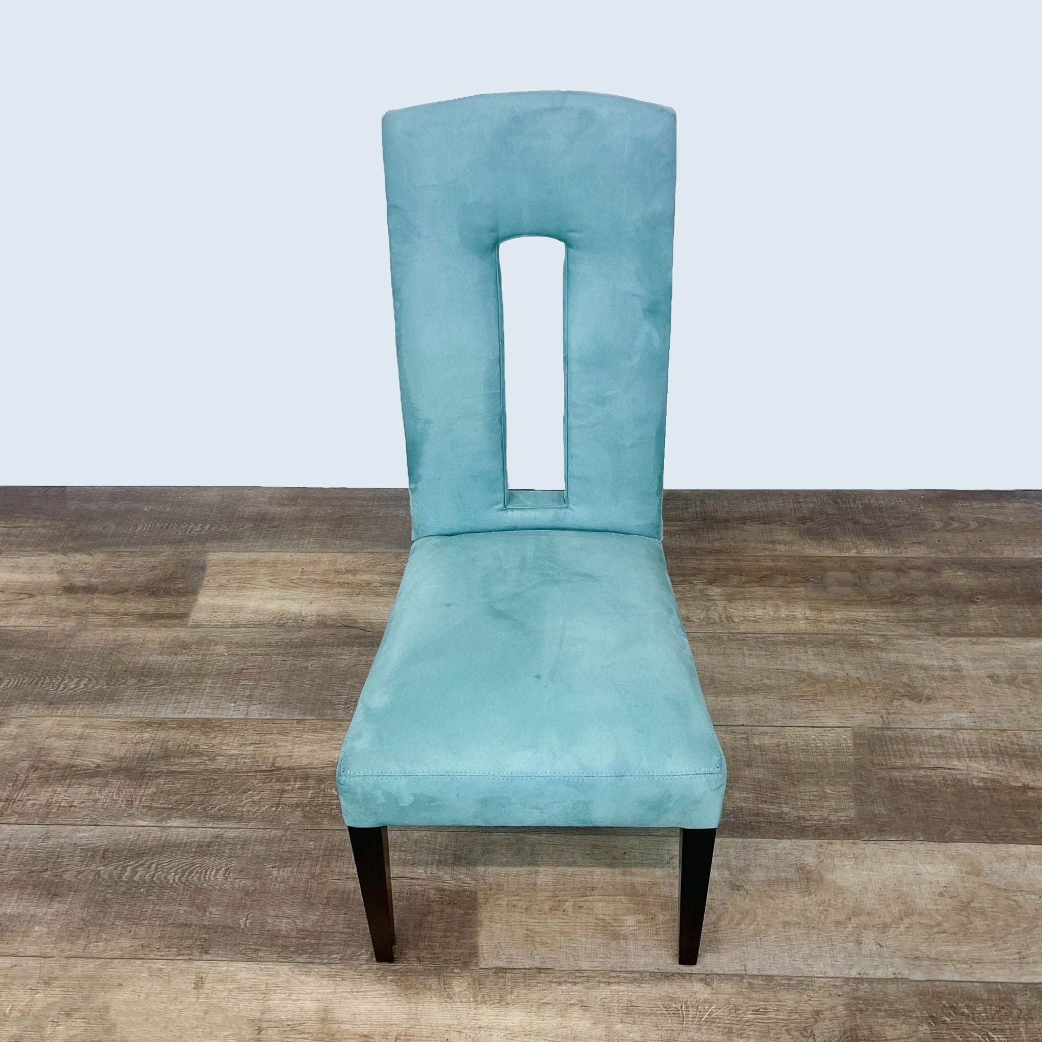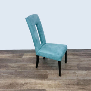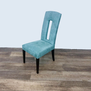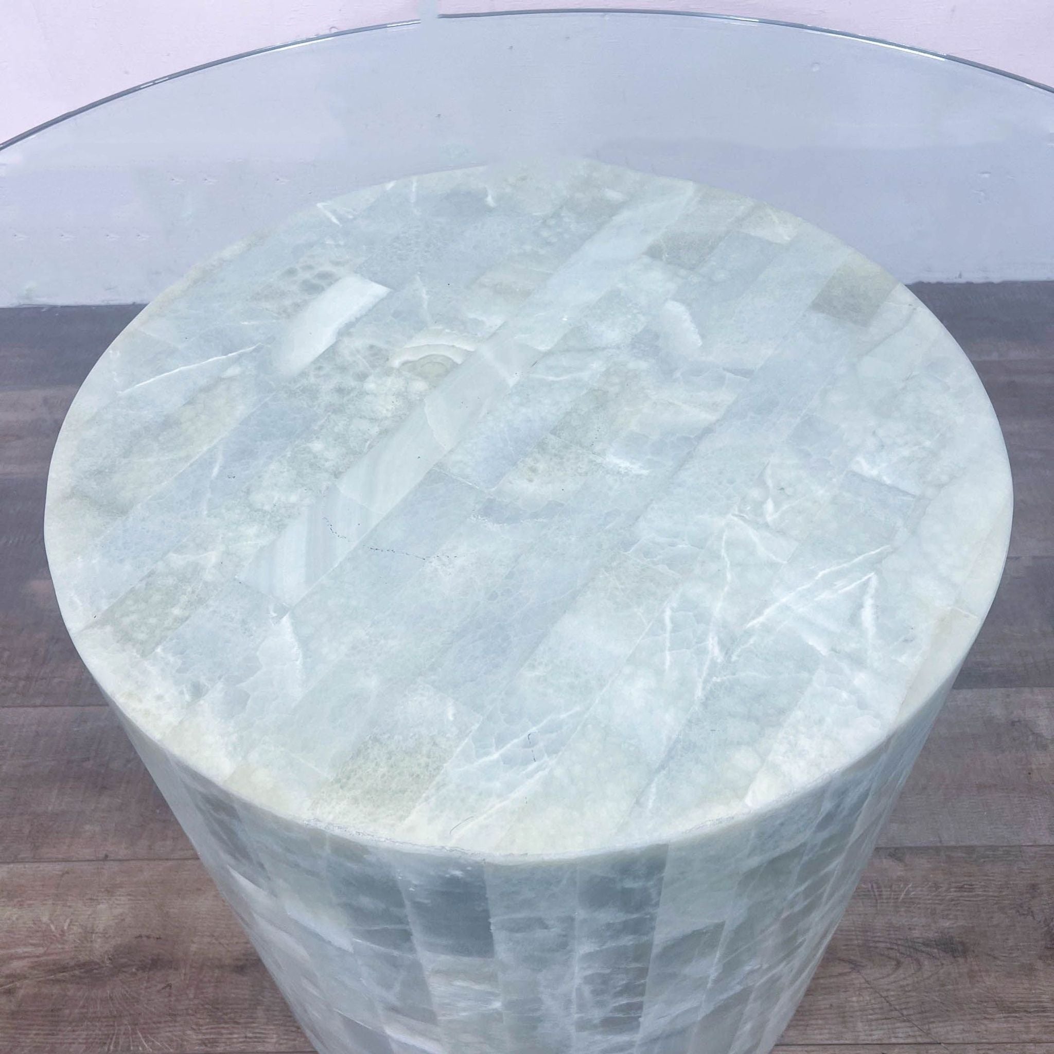 This 5-Piece Dining Set from Artistica features a travertine stone drum base with a thick tempered glass top and includes four high back upholstered chairs with wood legs.