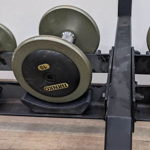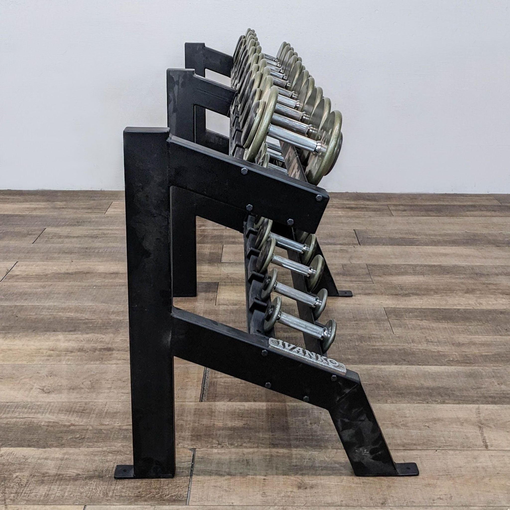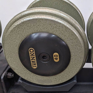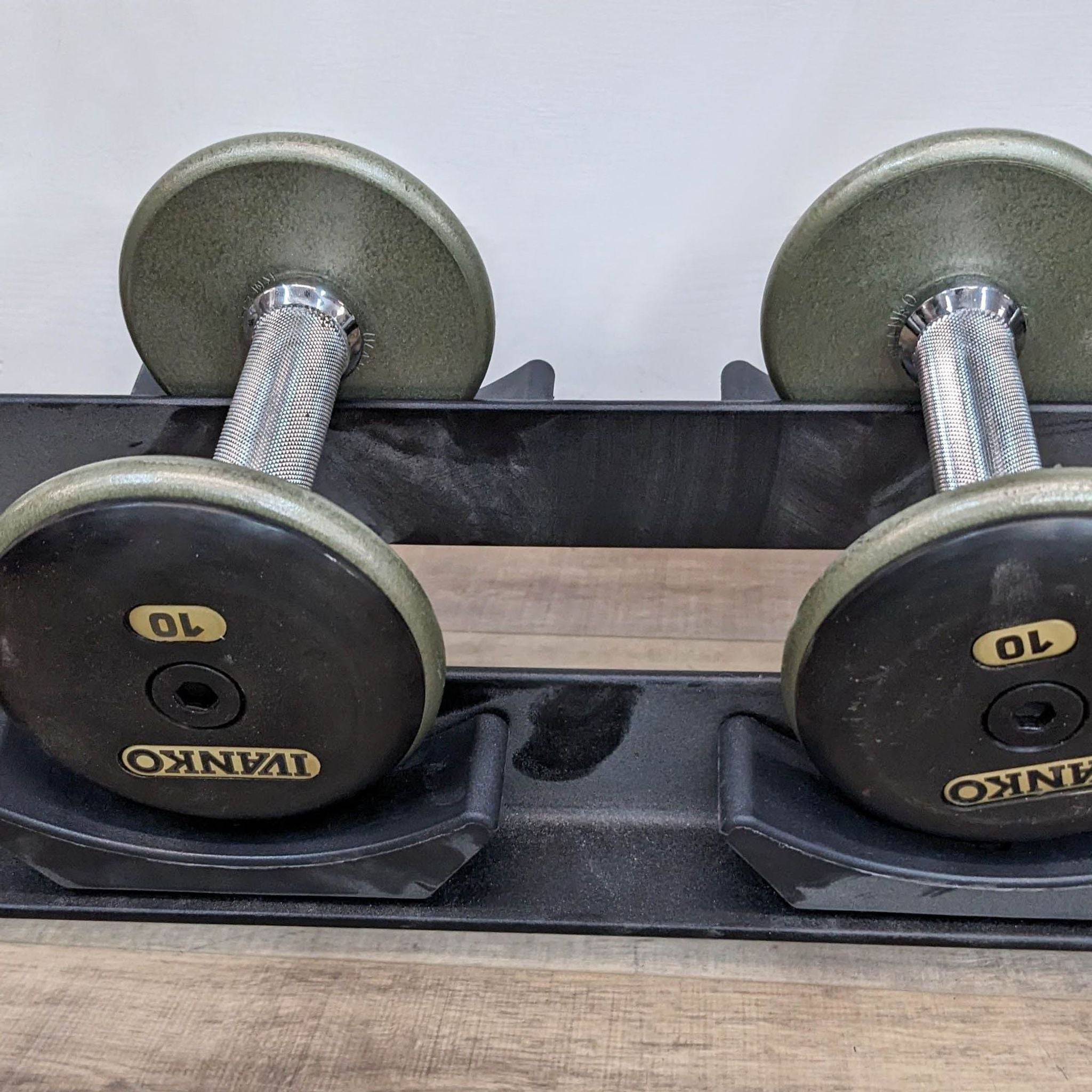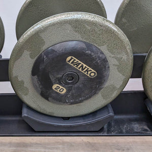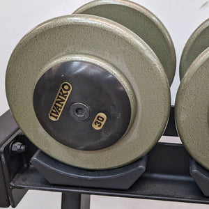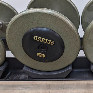 Set includes: * one 5-50 lbs. set of Ivanko RM/EP-1.5 dumbbells with black end plates with retail price of $2,417 * one 5-100 lbs. set of Ivanko RM/EP-1.5 dumbbells with black end plates with retail price of $6,668 * two RK-8500-KD double level knock-down dumbbell racks with combined retail price of $2,270.