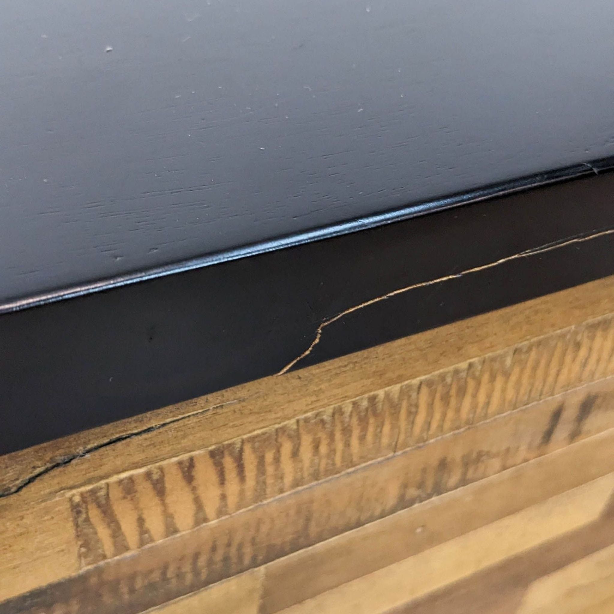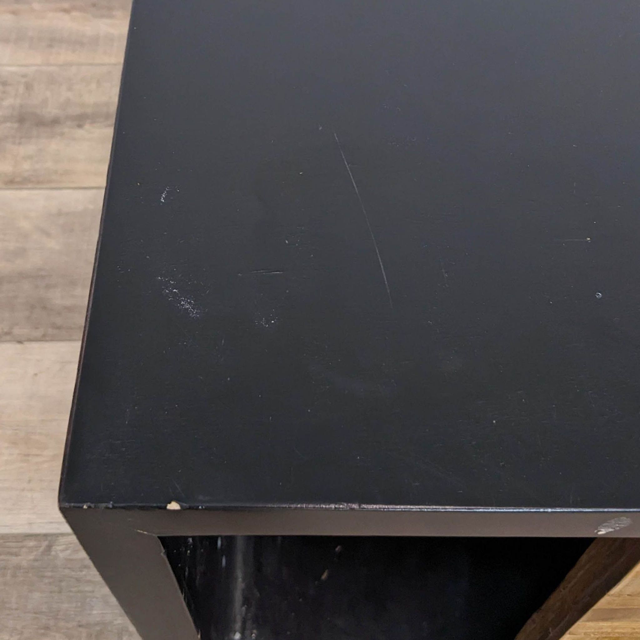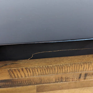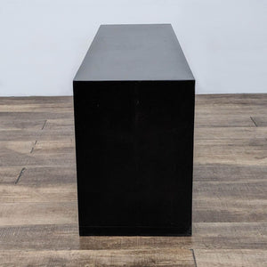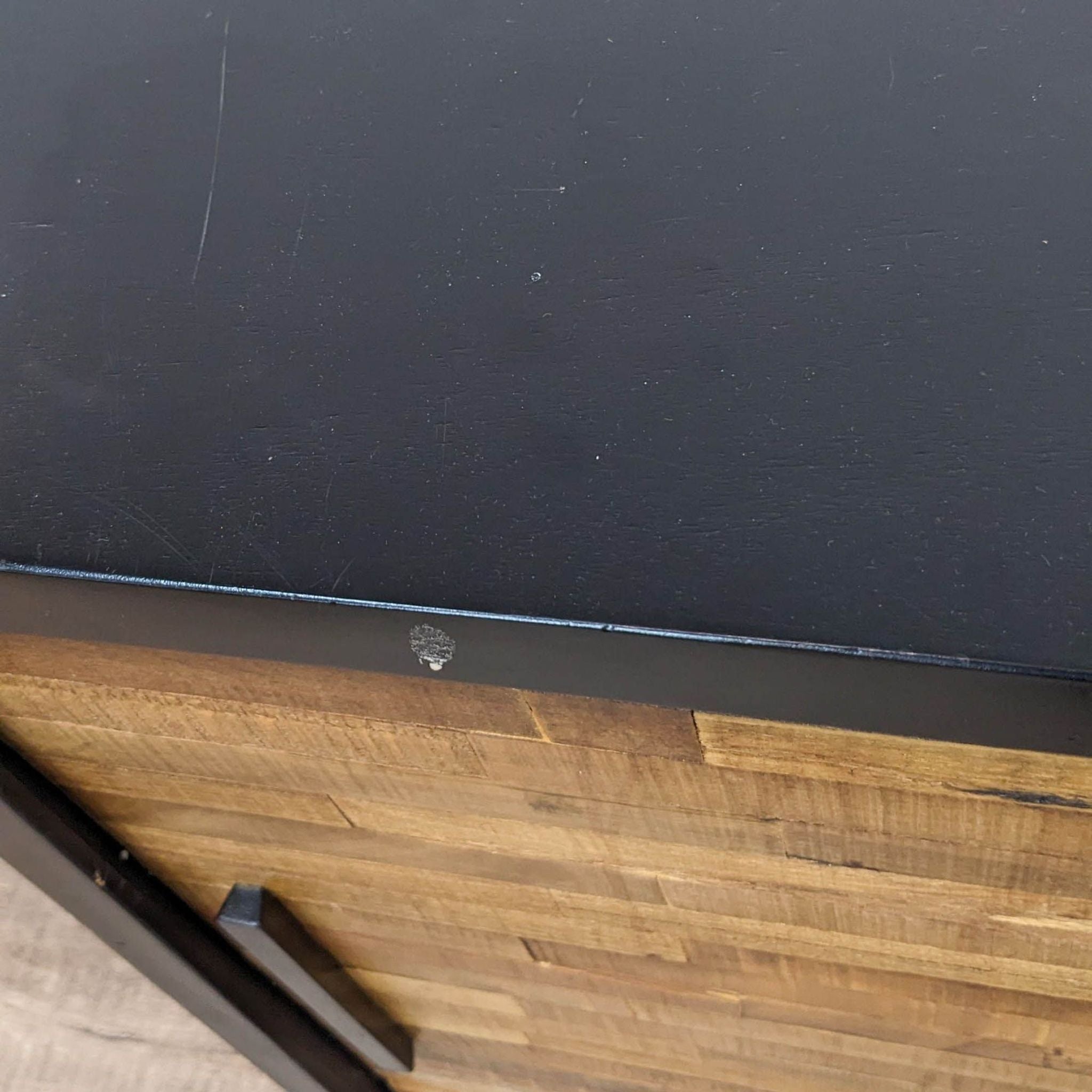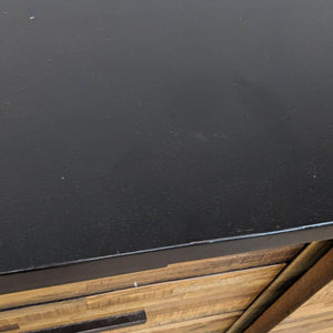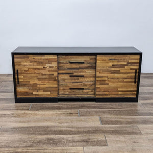 Rough-sawn wood wrapped in a modern black frame with matching hardware. Two sliding doors open to adjustable shelving and three storage drawers.