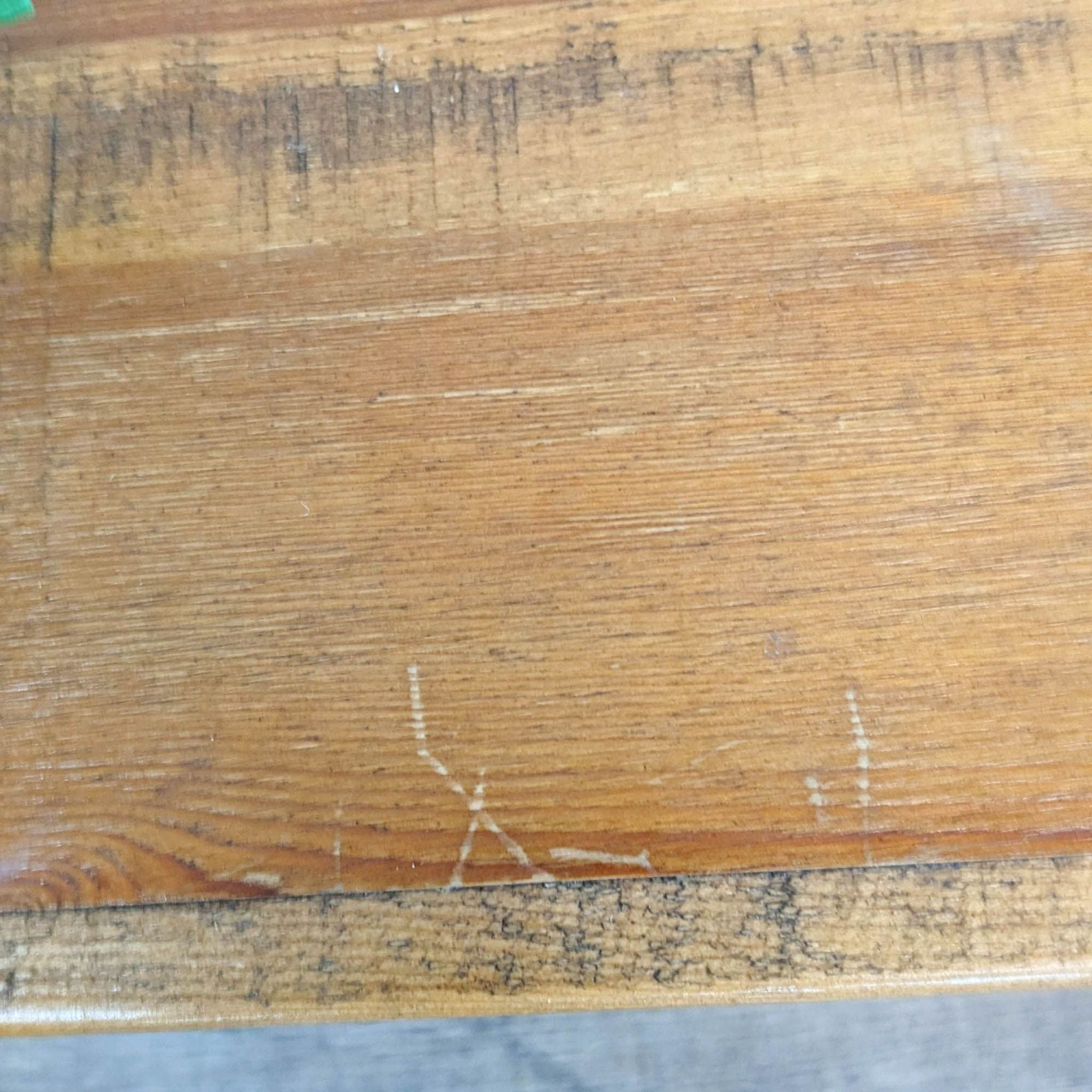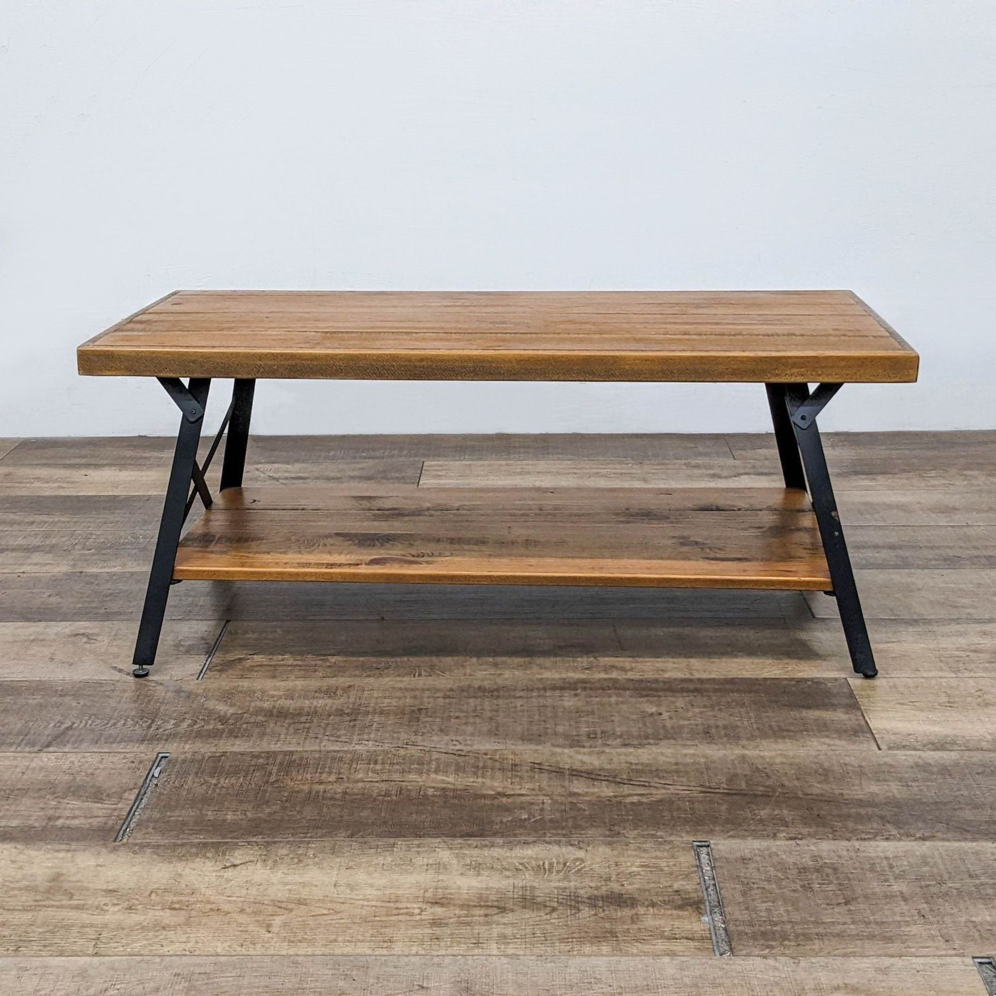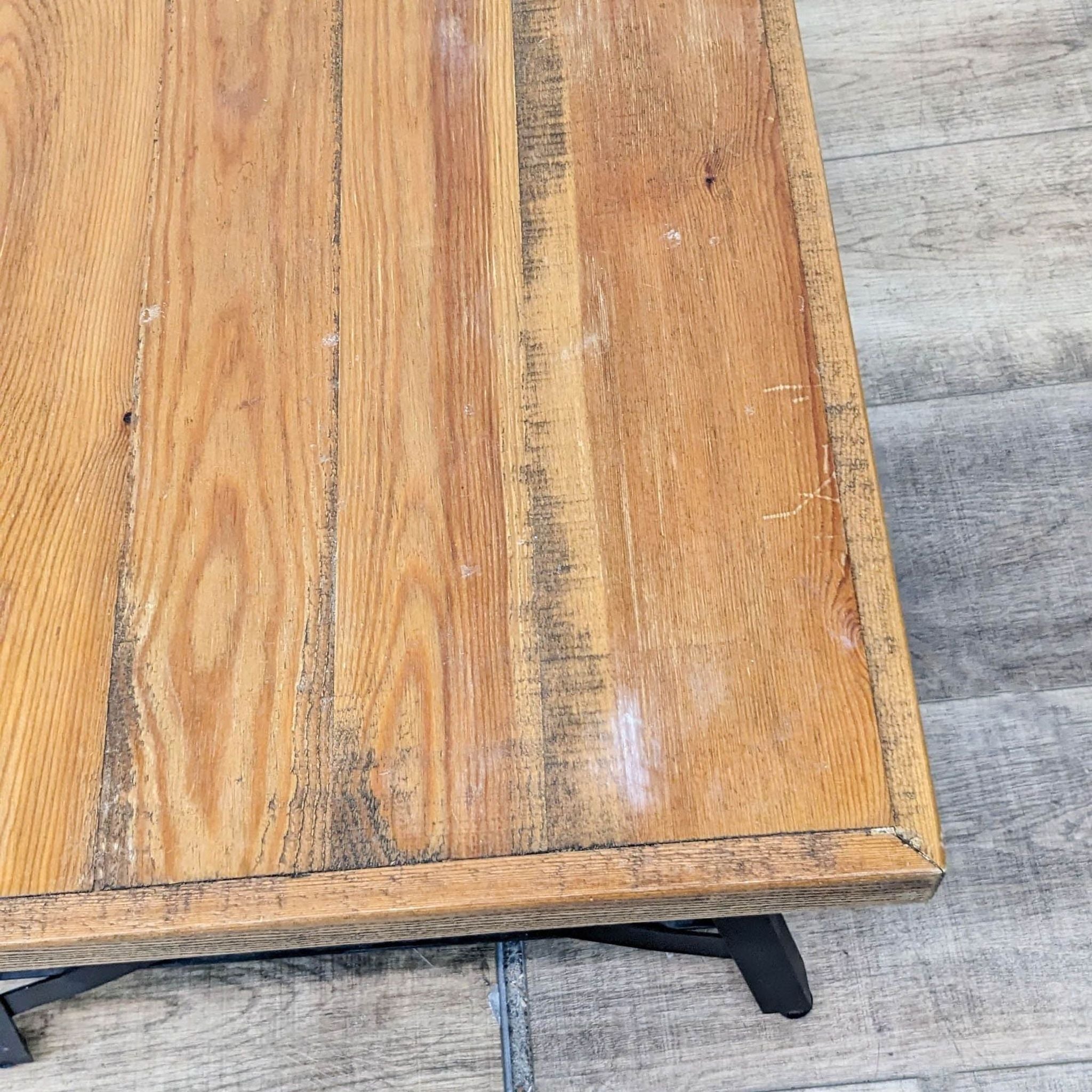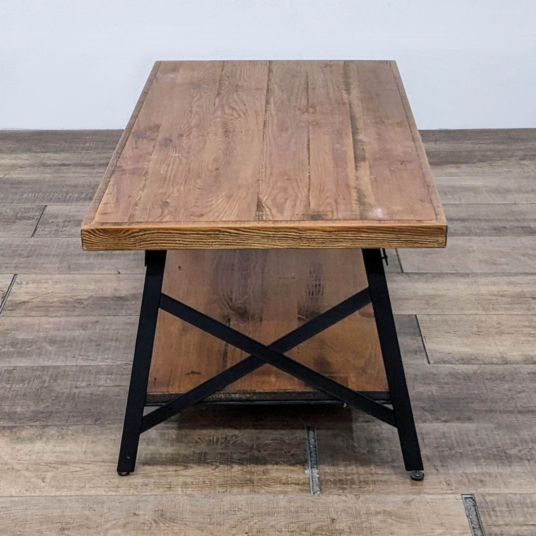 Industrial-style table features a steel frame with x-shaped legs and a planked pine wood tabletop.