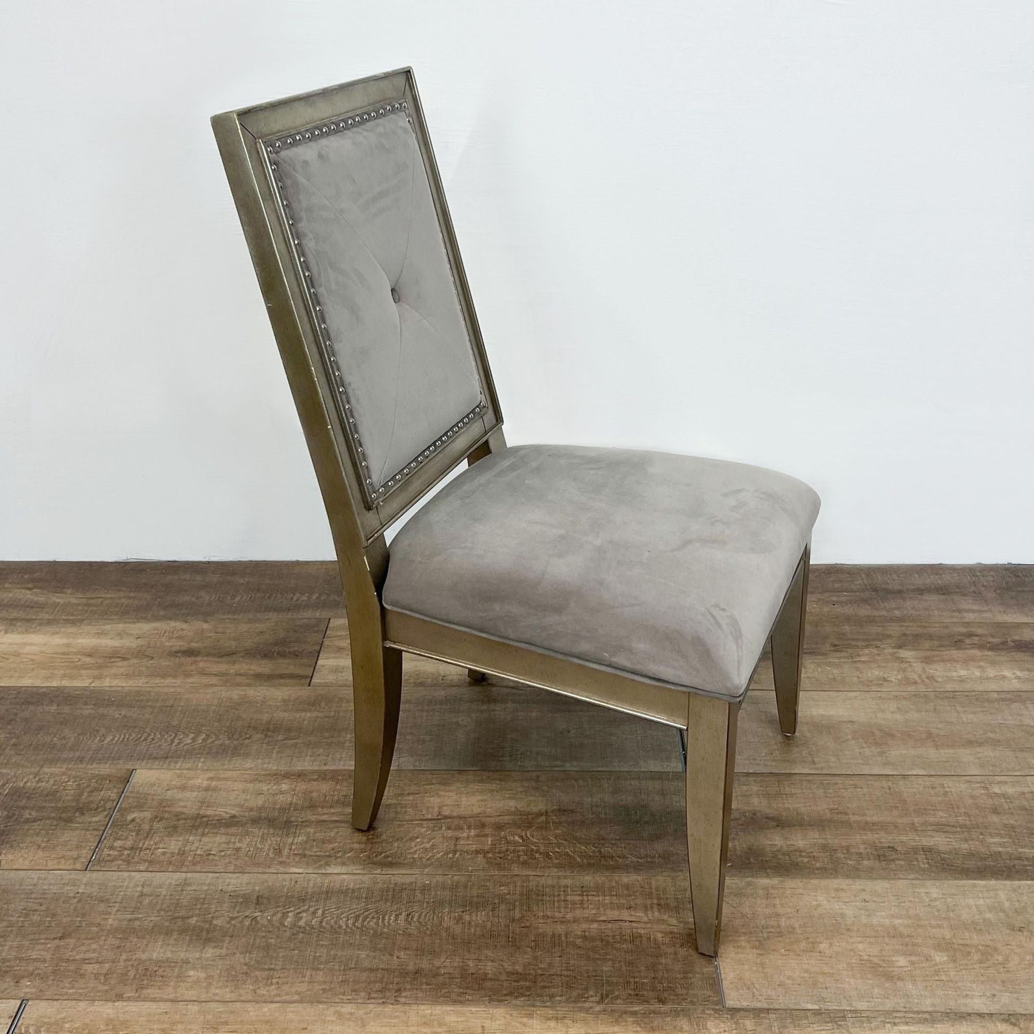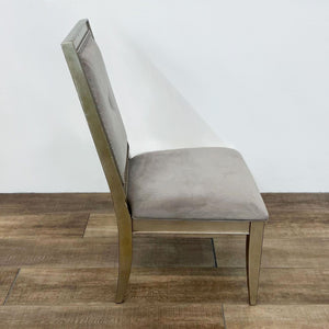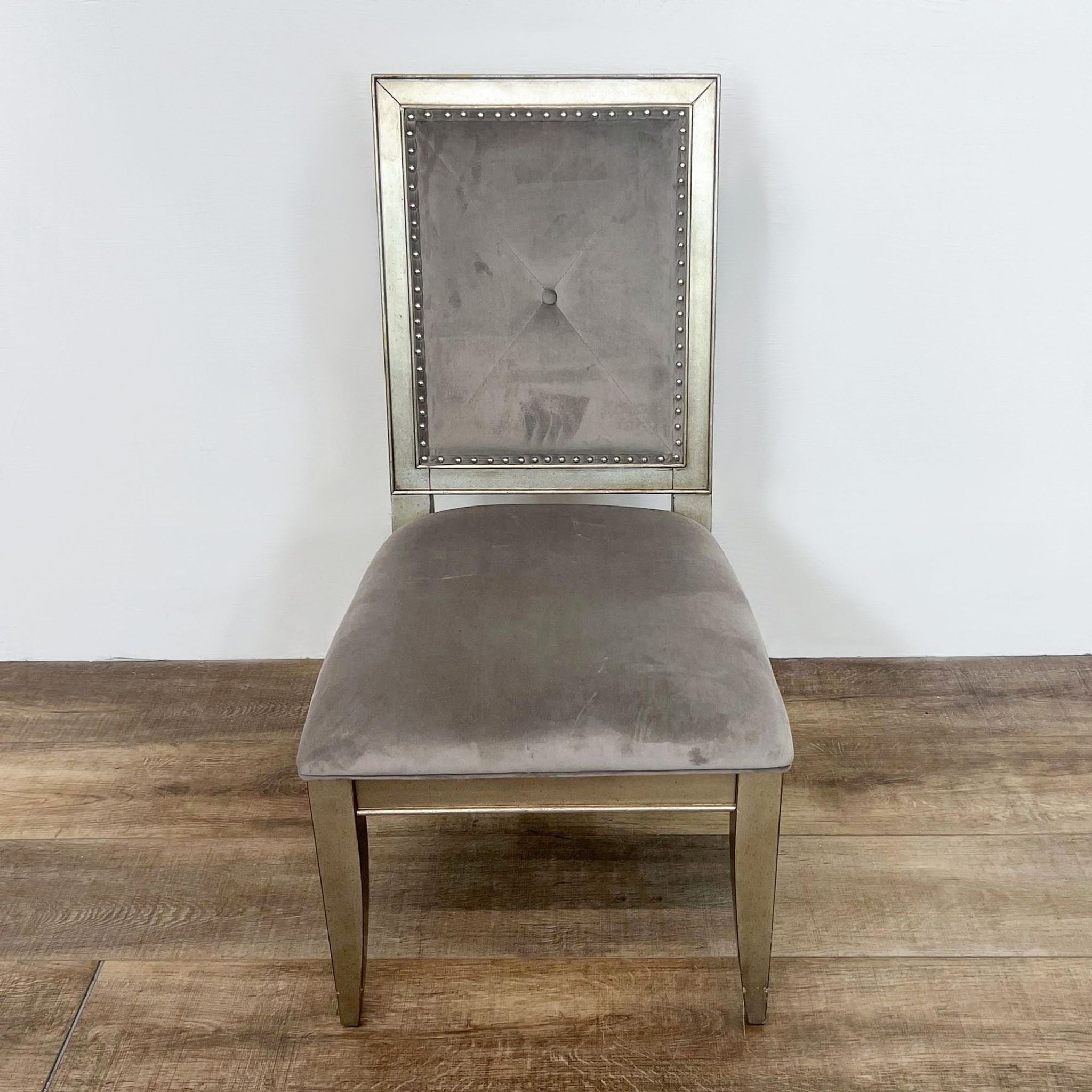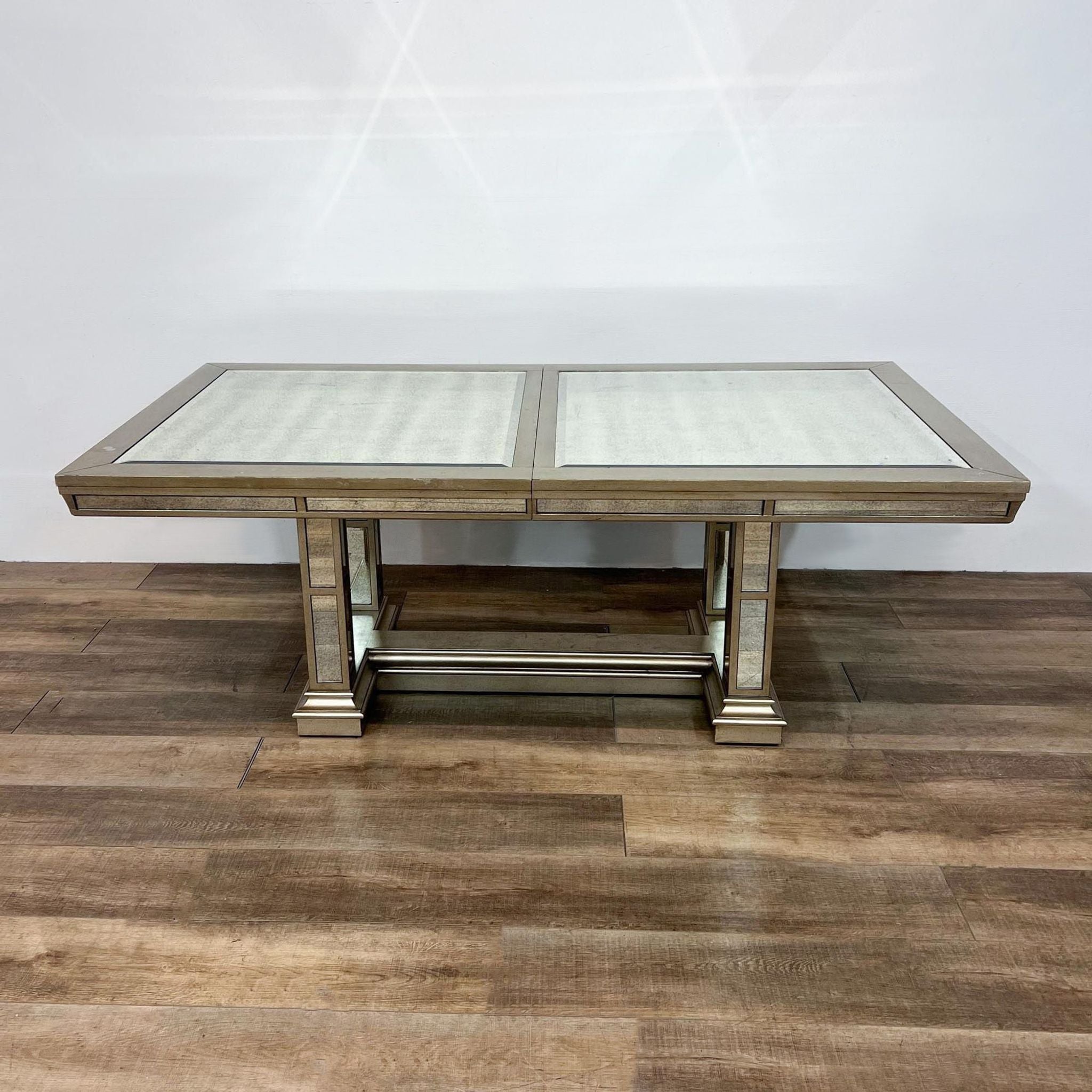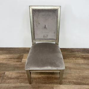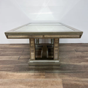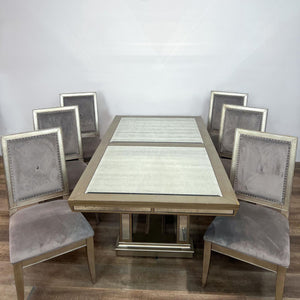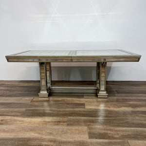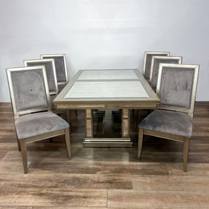 The Ava expandable dining table from Z-Gallerie is constructed from kiln dried hardwoods with lightly antiqued mirror panels along each side that is surrounded by a metallic champagne-finished trim. Included are 6 Ava dining chairs that are diamond tufted in grey velvet upholstery with a single button and finished in antique champagne with silver nailhead trim.