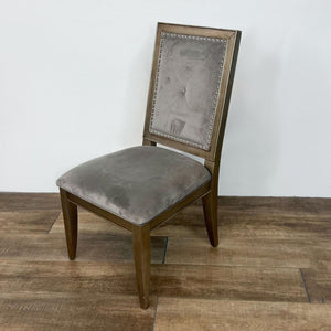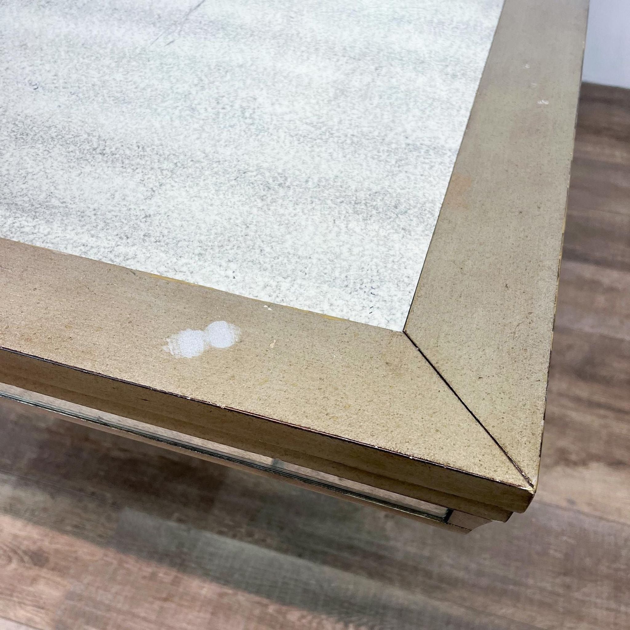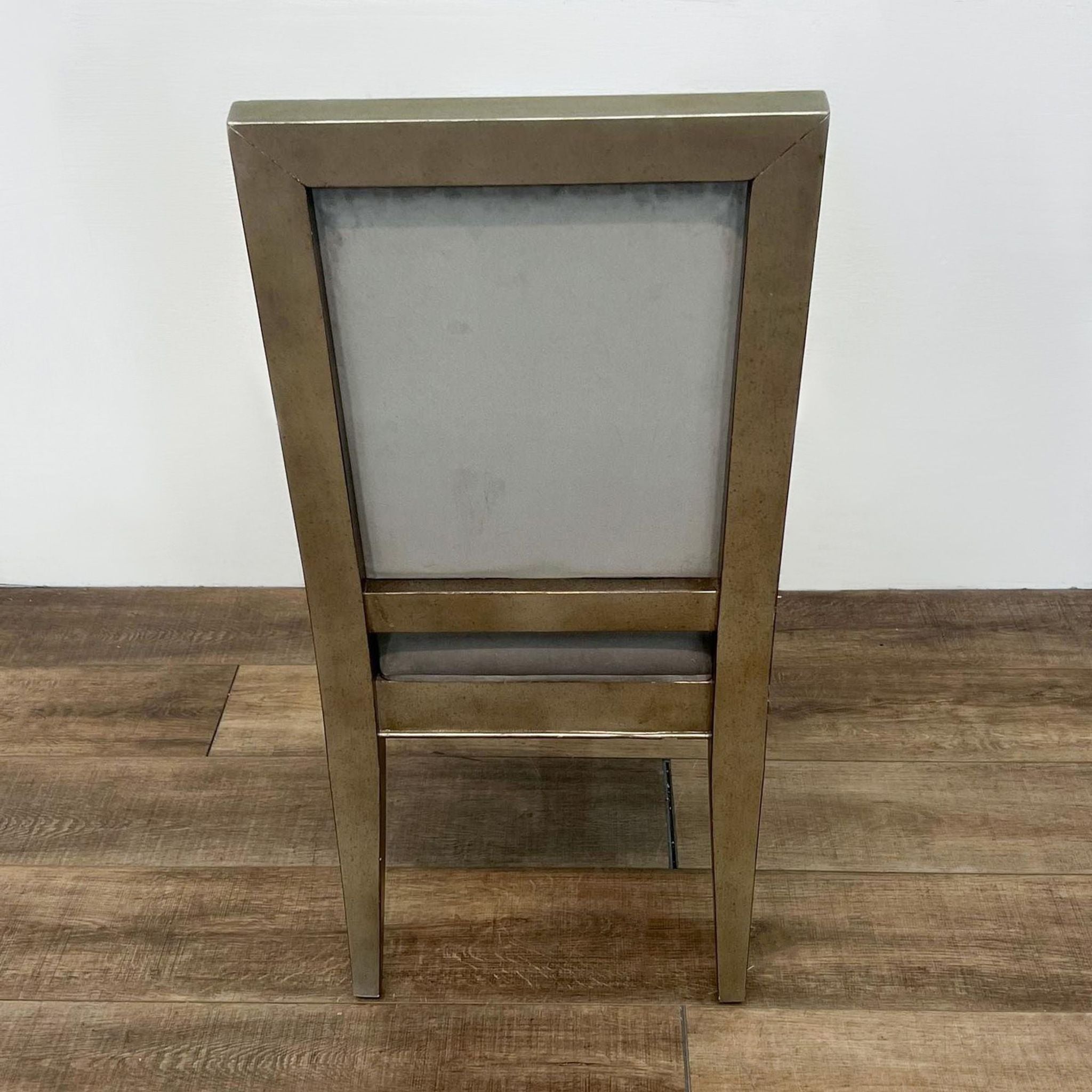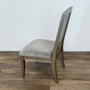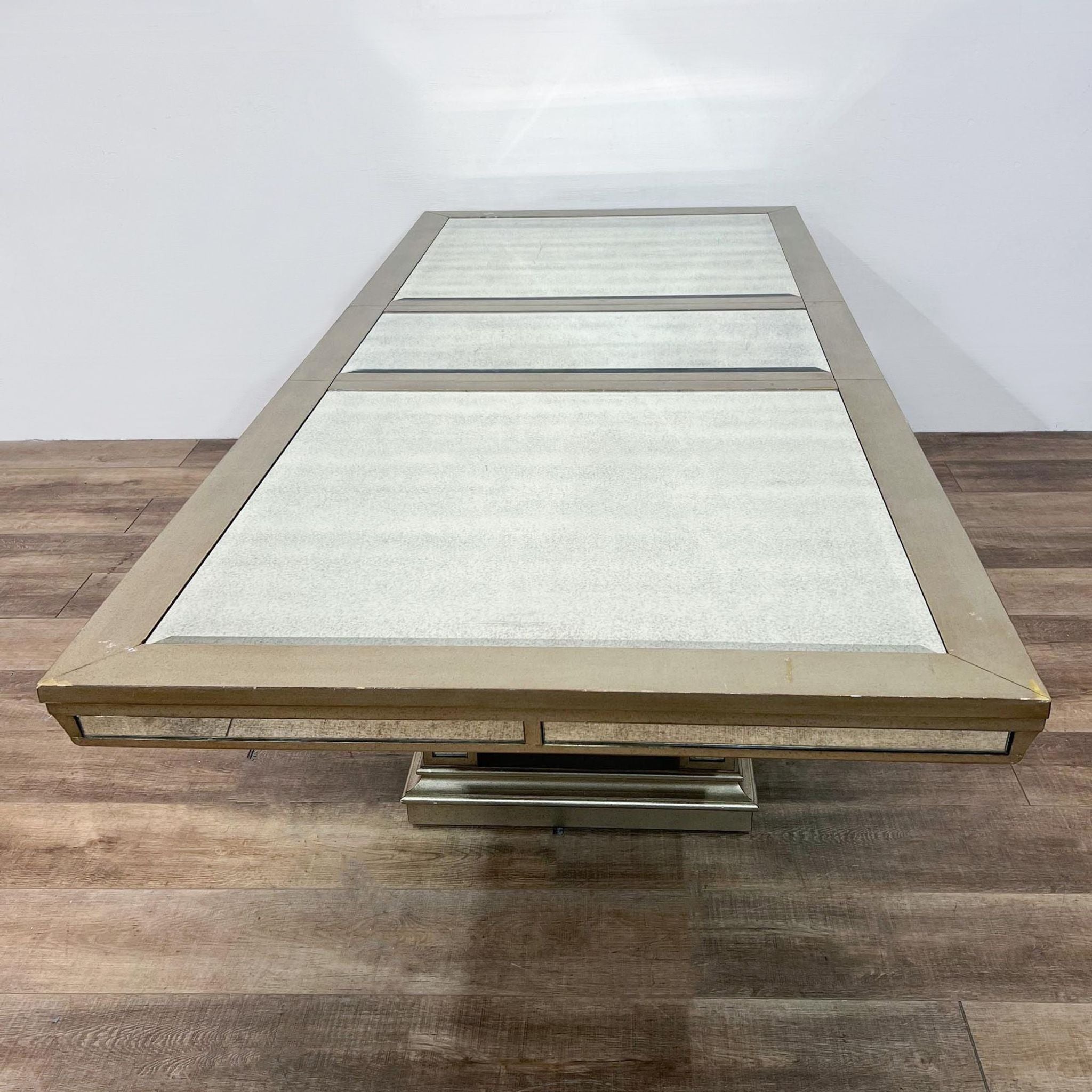 The Ava expandable dining table from Z-Gallerie is constructed from kiln dried hardwoods with lightly antiqued mirror panels along each side that is surrounded by a metallic champagne-finished trim. Included are 6 Ava dining chairs that are diamond tufted in grey velvet upholstery with a single button and finished in antique champagne with silver nailhead trim.