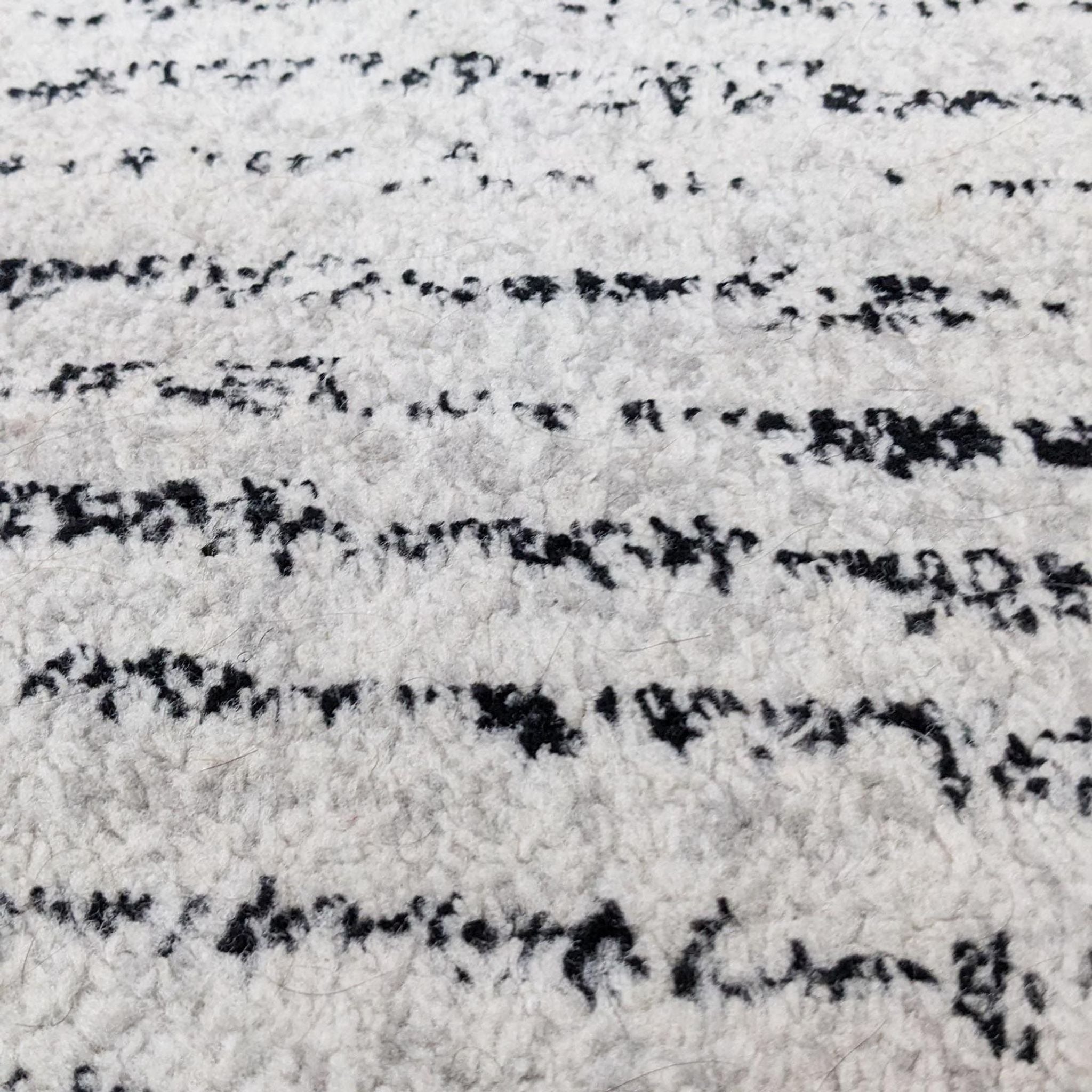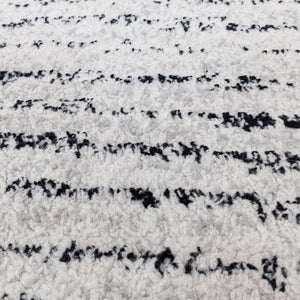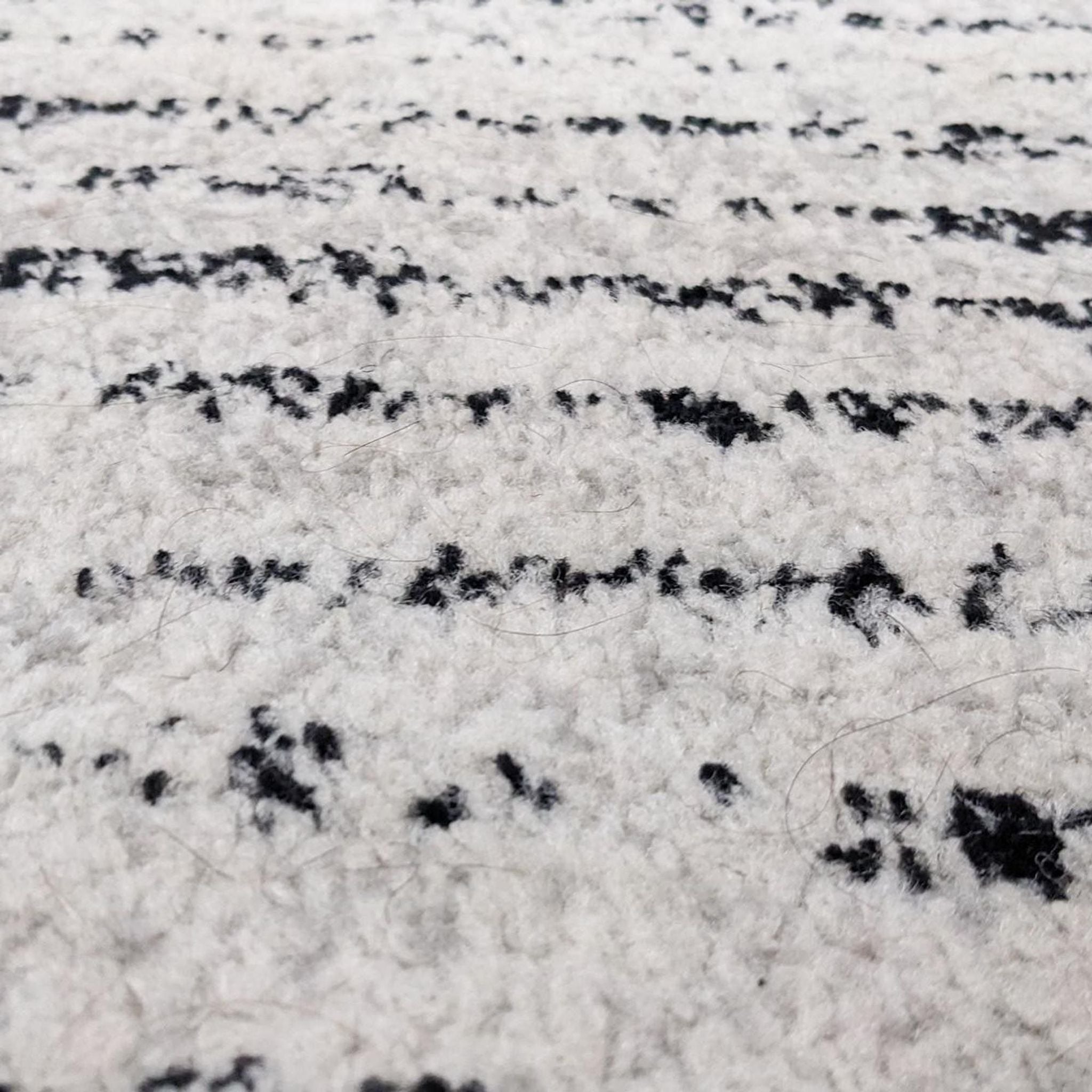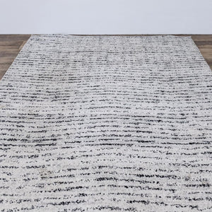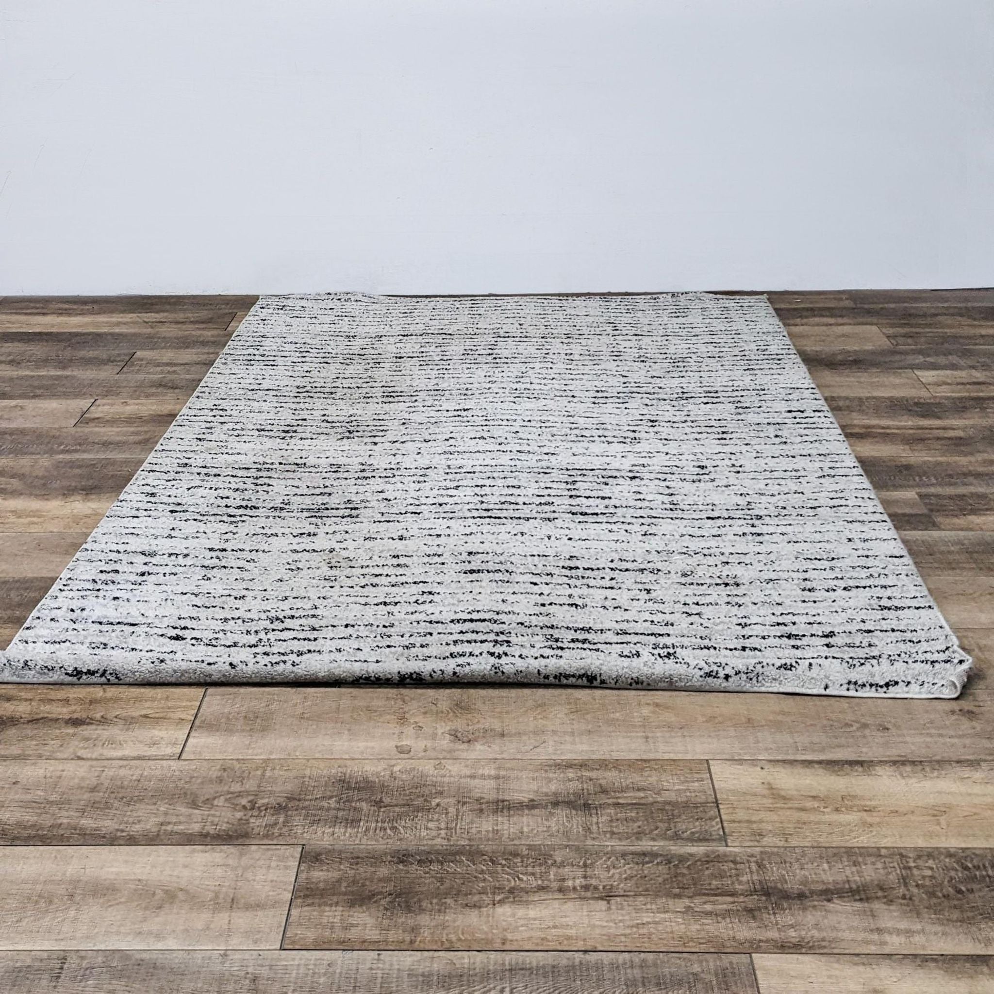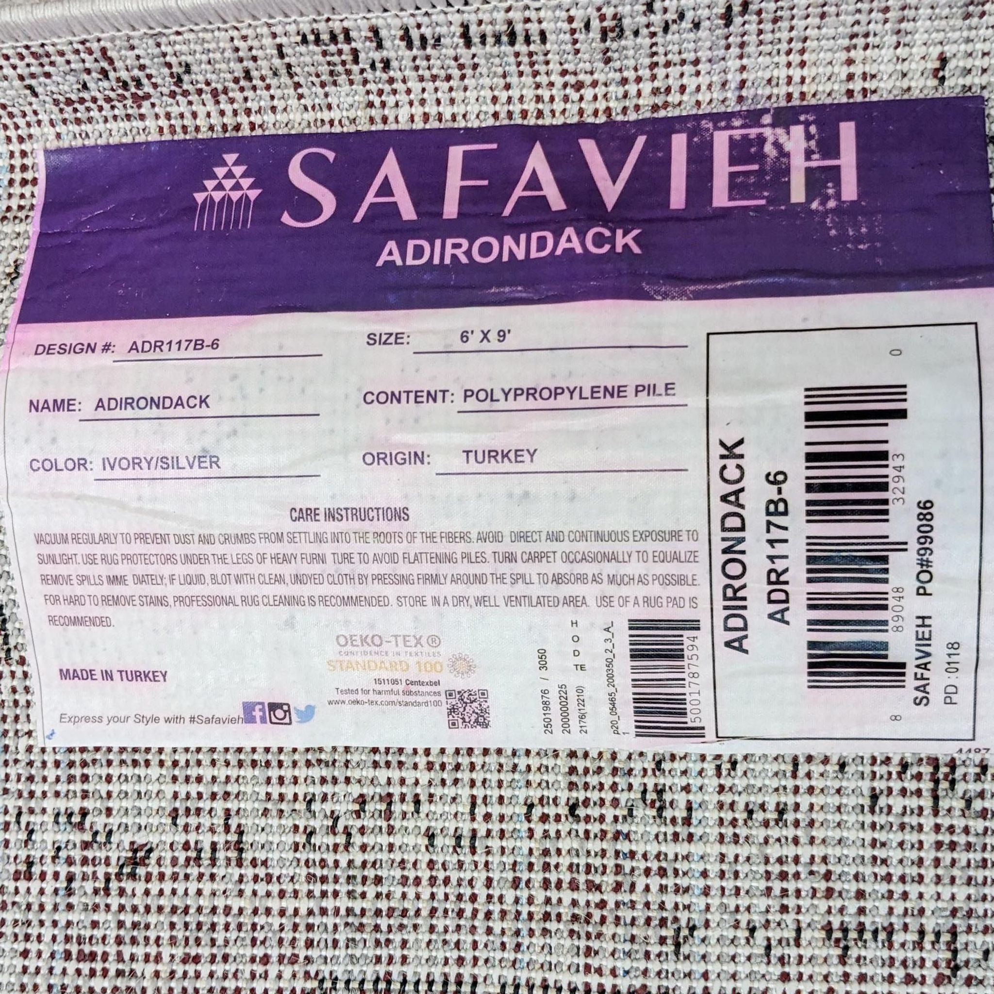 The 6’x9’ Adirondack area rug from Safavieh has a softly flowing linear design in ivory and silver and is power-loomed using synthetic yarns in Turkey.